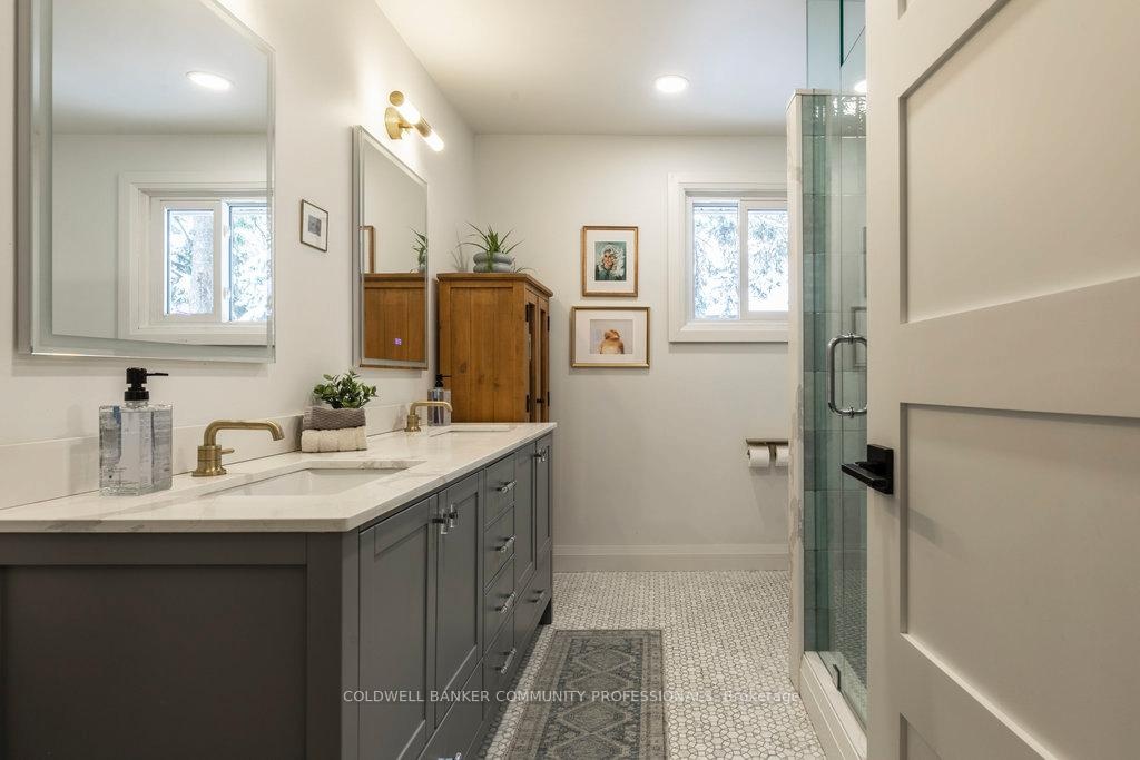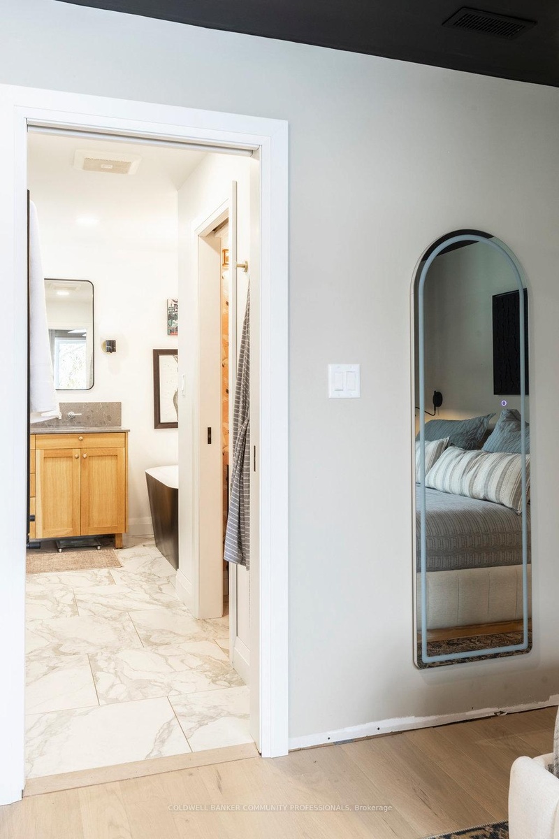 Welcome to 1052 French Rd! This beautifully updated 3+1 bedroom, 3.5 bathroom bungalow sits on a large, peaceful rural lot. As you enter, you'll be greeted by abundant natural light streaming into the spacious living and dining areas. The newly renovated kitchen is a chef's dream, featuring a brand-new double oven, induction cooktop, range hood, and dishwasher. The large island with seating is the perfect gathering spot, complemented by an oversized fridge, quartz countertops, and a full pantry just off the kitchen for extra storage. A convenient 2-piece bathroom located nearby. Down the hall, you'll find the newly renovated laundry/mudroom with access to the attached garage. On the opposite side of the kitchen, enjoy an open-concept den with a wood-burning fireplace and double doors leading to the backyard. The primary bedroom includes built-in wardrobes and a stunning ensuite bathroom featuring double shower heads, heated floors and towel rack, double sinks, a standalone tub, and a separate water closet with a bonus sink. Two additional bedrooms and a 4-piece bath (also with heated floors and towel rack) complete the main level. The lower level is expansive, offering even more living space. It includes an additional bedroom, 3-piece bathroom with heated floors, a second kitchen, a games room/wet bar with Skee-Ball, a home office, a rec room with a projector and wood-burning fireplace, and a home gym with a sauna. Step outside to your entertainer's dream backyard-complete with a deck, 8-person hot tub, and a large fire pit. This home truly has it all-modern updates, thoughtful details, and endless space for family and friends to enjoy!