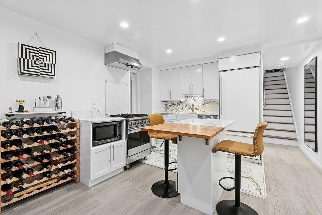 Walking into this home, you find yourself in the foyer featuring new hardwood floors, noticing crown molding on the top floor which adds an architectural polish. The newly renovated kitchen, is anchored by Calacatta marble countertops, and a suite of high-end appliances, including a new SMEG stove and hood, Sub-Zero refrigerator, and Miele dishwasher.