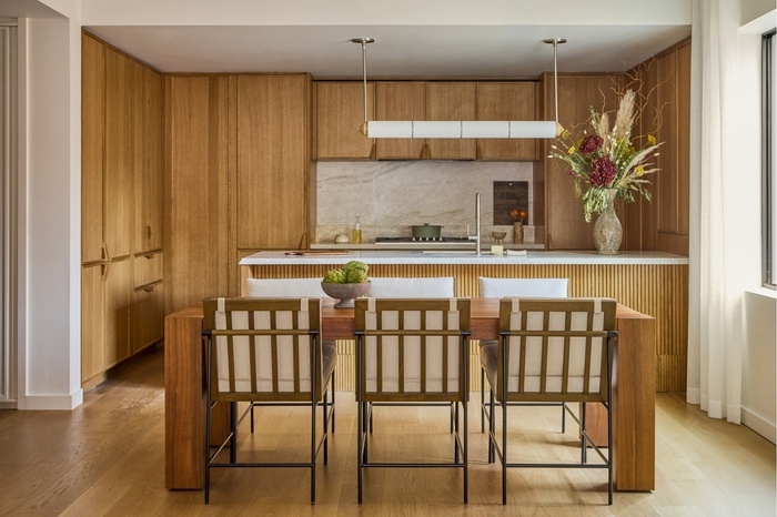 Designed with a focus on simplicity as a way of life, with interiors designed by AD100 Workstead that layer elegance and function that feel intimate in scale and have a soft calming effect. The oversized kitchen presents custom white oak cabinetry adorned with custom white oak hardware that is beautifully paired with a striking honed Taj Mahal quartzite countertop, backsplash and ledge. The integrated state-of-the-art Masterpiece Series Thermador appliance suite blends seamlessly into the background, while the custom light pendant designed by Workstead and paneled under-counter integrated XO wine cooler calls attention to the many thoughtful design details.