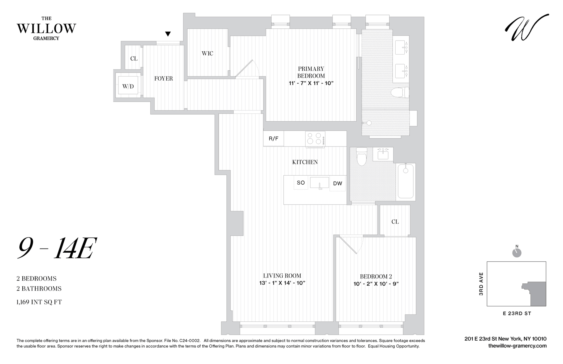 COMING TO GRAMERCY 2026. Residence 11E is a spacious two bedroom, two bathroom home. Featuring a thoughtfully designed space, it has an open concept kitchen, living, and dining area and floor-to-ceiling divided light windows that fill the apartment with natural light, and highlight the elegance of the wide-plank white oak flooring. The primary bedroom suite feels private and luxurious with generous closet space and a double vanity in the bathroom. A full size washer and dryer complete this special home.