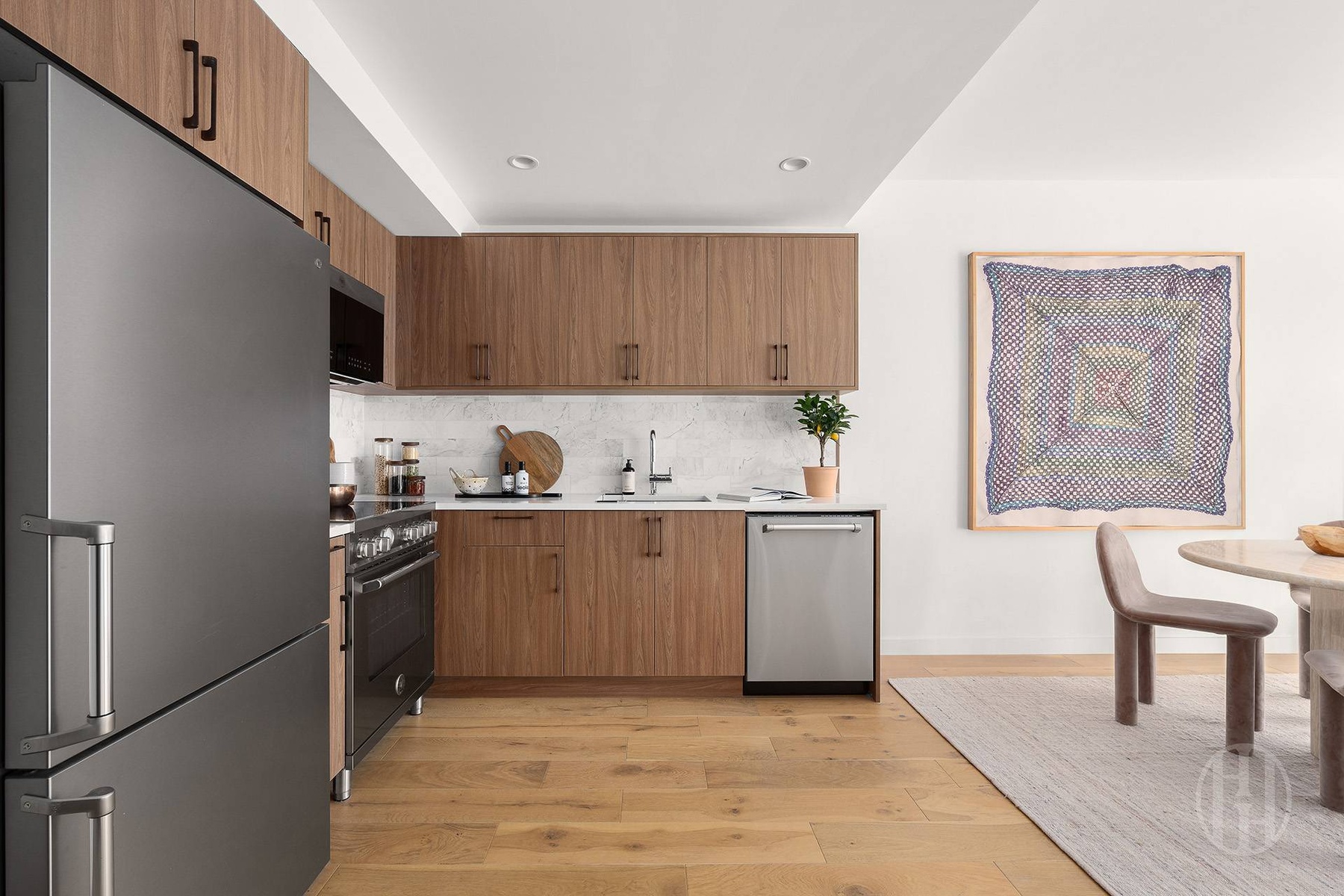 Kitchens are designed to entertain, with Bertazzoni and Bosch appliances, externally vented hoods, wine fridges, quartz countertops, marble backsplashes, and custom soft-close cabinetry. Marble bathrooms are appointed with Kohler and Grohe fixtures, and vanities offer built-in storage. Select residences include private foyers and outdoor space, and every home is equipped with a Bosch washer and dryer for everyday ease.
