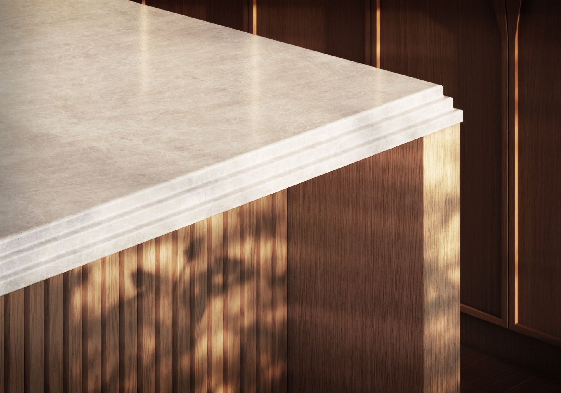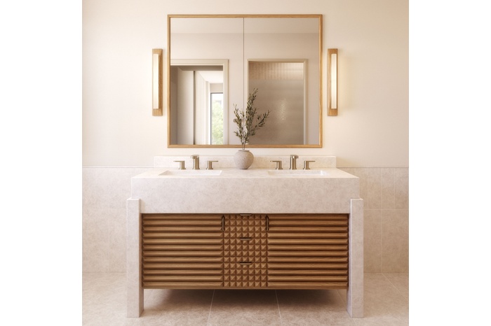 The bathrooms at Bergen are outfitted with soft tones and warm wood accents that make for a spa-like oasis with materials that are crafted to last. The bathroom is adorned with honed Crema Vanilla marble wall and floor tiles, a custom white oak vanity with Crema Vanilla marble countertop, legs and ledge, and a soaking tub clad in honed Crema Vanilla marble at the deck and skirt. Finishing touches include radiant heated floors and custom light fixtures by Workstead.