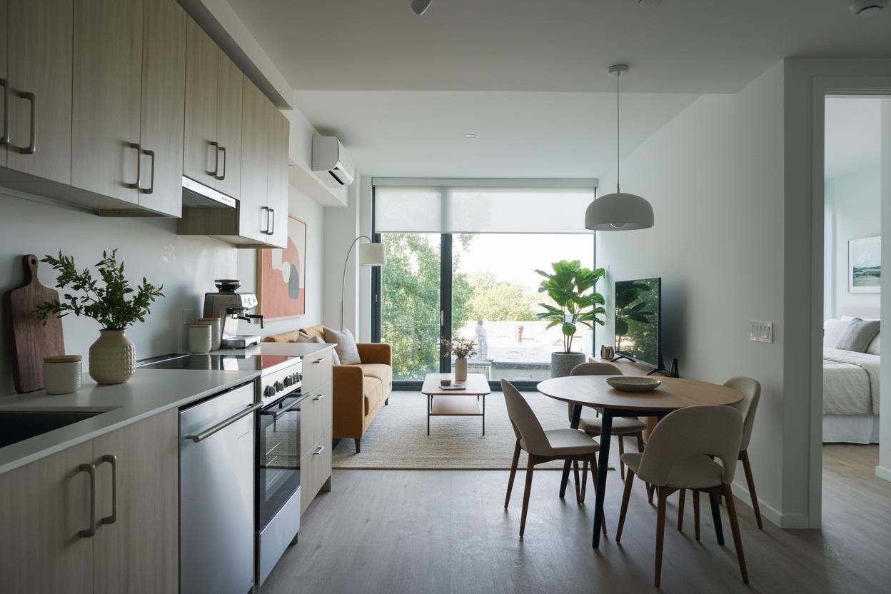 Residence 14 is a rare two-bedroom home offering both thoughtful interior design and exceptional private outdoor space. The open living and dining area connects seamlessly to the kitchen, creating an inviting flow that extends out to a large private terrace, perfect for entertaining, relaxing, or enjoying the outdoors in total privacy.