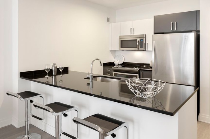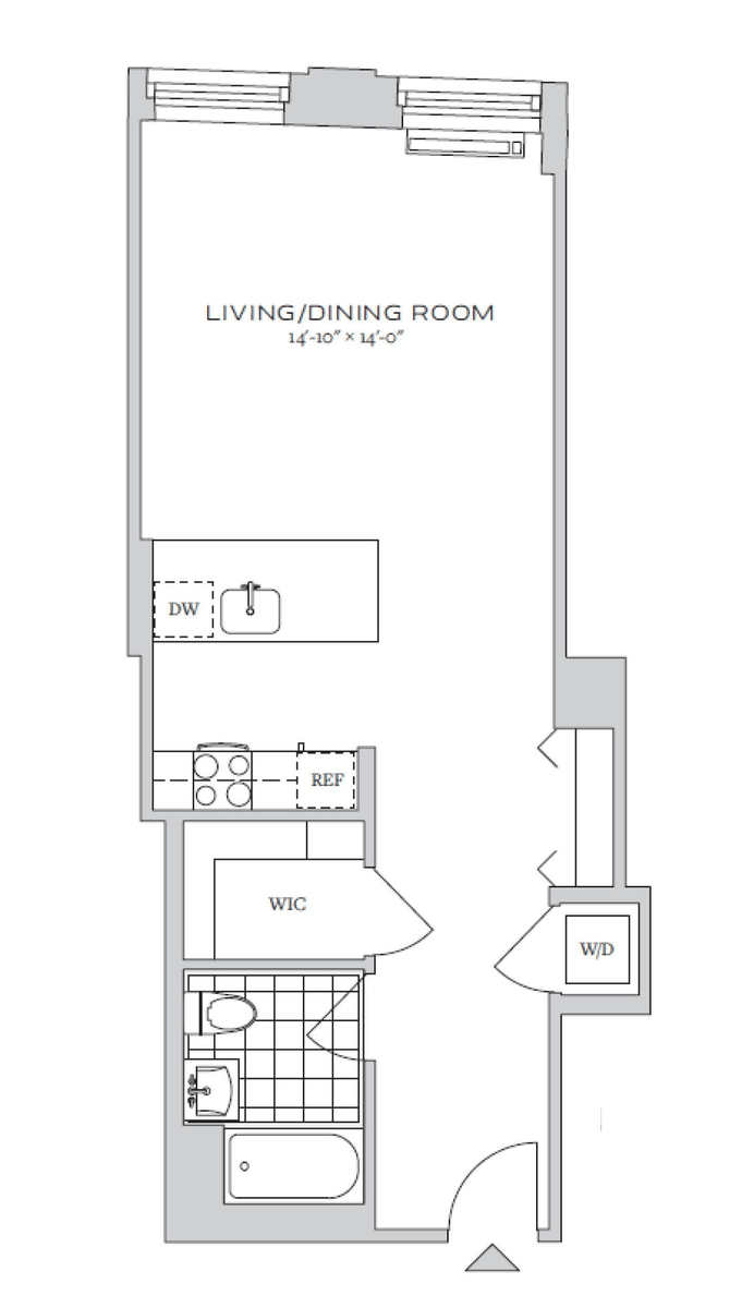 This large studio with great layout which features a gourmet kitchen with stone counter tops stainless steel appliances and an eating bar, a large walk-in-closet, and in-unit washer/dryer.