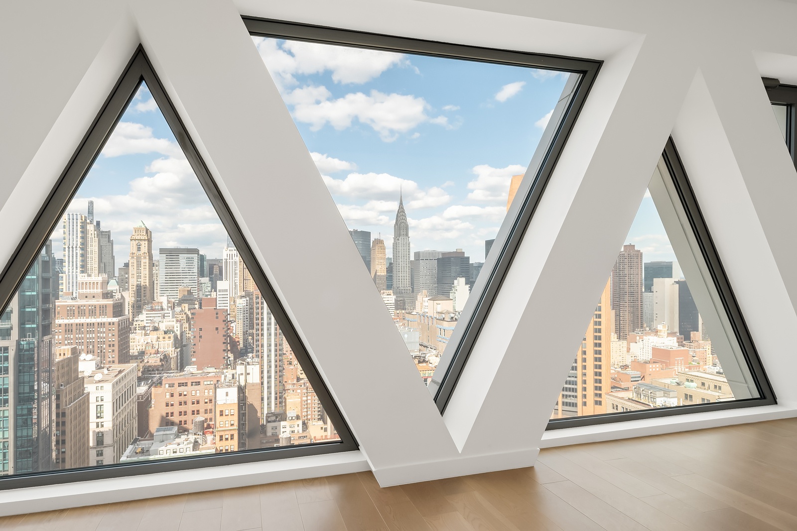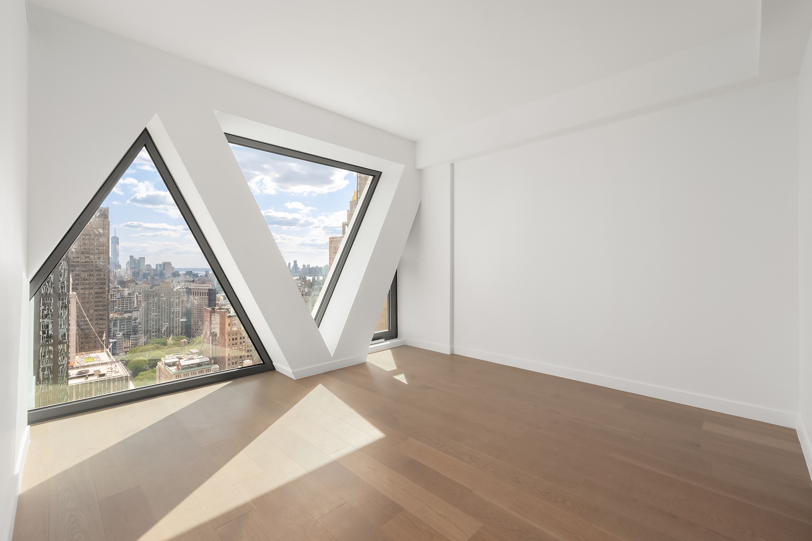 Two equally spacious ensuite bedrooms occupy the south end: one with a dramatic, triangular-windowed bathroom and the other with a marble shower/bathtub and a large walk-in closet. Both bathrooms feature custom-crafted White Oak vanities. Discreet luxuries throughout this home include 7-inch-wide plank, White Oak flooring and multi-zone climate controls. Expertly designed by Morris Adjmi, this home is the product of innovative materials, warm finishes, flowing lines and bright spaces.