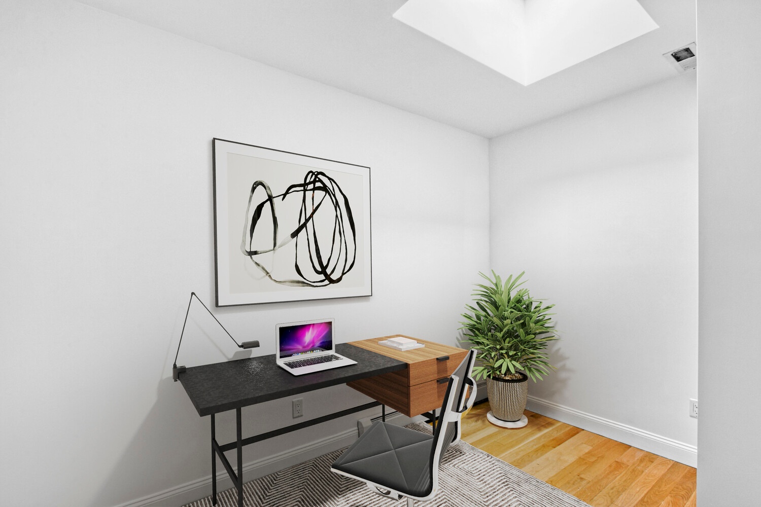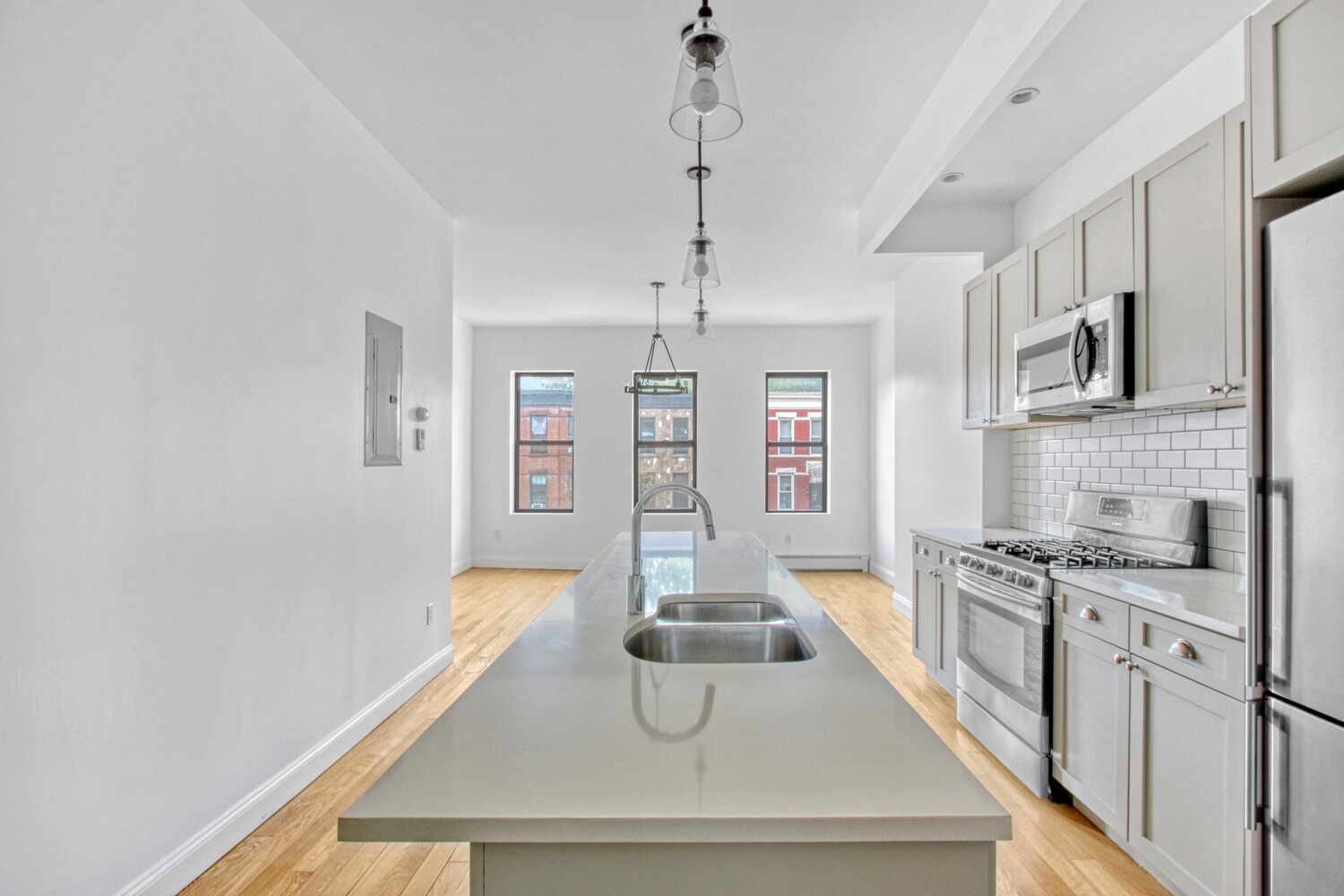 Make this expansive 3-bedroom, 2.5-bath duplex with a private rooftop your next home in Weeksville! Spanning a massive layout, the residence is thoughtfully designed with separate living and dining rooms, blending modern comfort with charming details like exposed brick in the living room. The home offers two king-sized bedrooms plus a third, smaller room with a skylight-perfect as a children's bedroom or dedicated home office. Both full bathrooms feature tubs, sleek modern vanities, and contemporary fixtures, while a convenient half bath is located on the main level. The windowed kitchen is equipped with a center island, stainless steel appliances, including a dishwasher, complemented by stone countertops custom wooden cabinetry, and ample storage. Upstairs, the private rooftop is an enviable perk, offering the ideal retreat for entertaining or enjoying peaceful city views. Additional details include in-unit washer/dryer, central heating + cooling, hardwood flooring throughout, and high ceilings. Located near the A/C trains at Ralph Avenue, commuting is a breeze. Local favorites such as Lakou Café, Tacolmos, BB's Burger Factory, and Nyla House are all just moments away, along with other major shopping and dining districts. Pets are welcome.