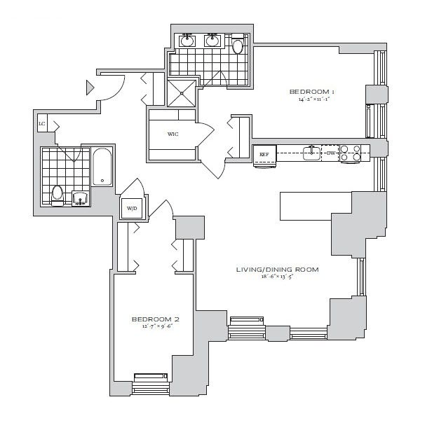 Sprawling high floor 2 bedroom with breathtaking south and east views of NYC. Apt features an open windowed kitchen, a primary bedroom with en-suite 4 piece bath and large WIC, an in-unit w/d, and wood floors.