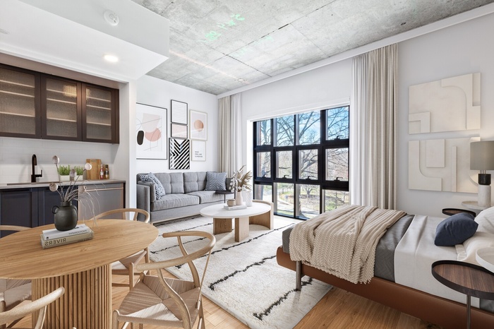 Every detail has been thoughtfully designed using the finest materials including wide white oak wood flooring, a state of the art kitchen with custom European cabinetry outfitted with industrial panel glass detailing, stainless steel appliances, large steel casement style windows. a huge walk in closet and a WASHER/DRYER in the unit. A meticulously designed bathroom features a dark walnut vanity and black matte hardware.