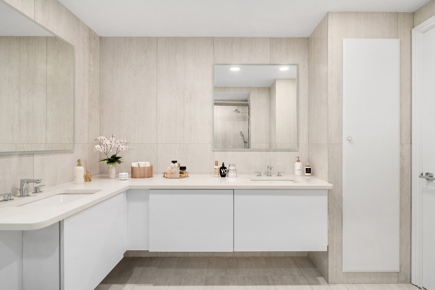 The home can be entered through its main entrance into a grand foyer-great for artwork- that connects the entertaining wing to the bedroom wing. A second entrance into the apartment opens into a mud room and laundry room in the bedroom wing of the home-great for the day-to-day.