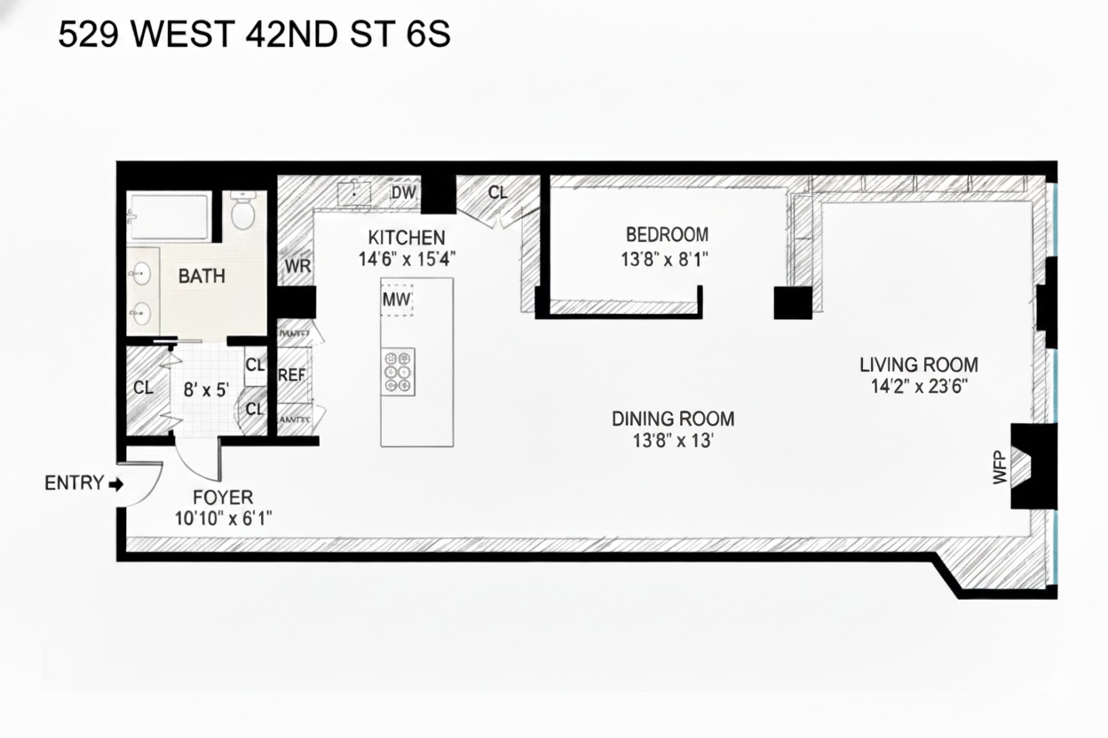 Welcome to Residence 6S at The Armory – a spacious and thoughtfully designed one-bedroom residence