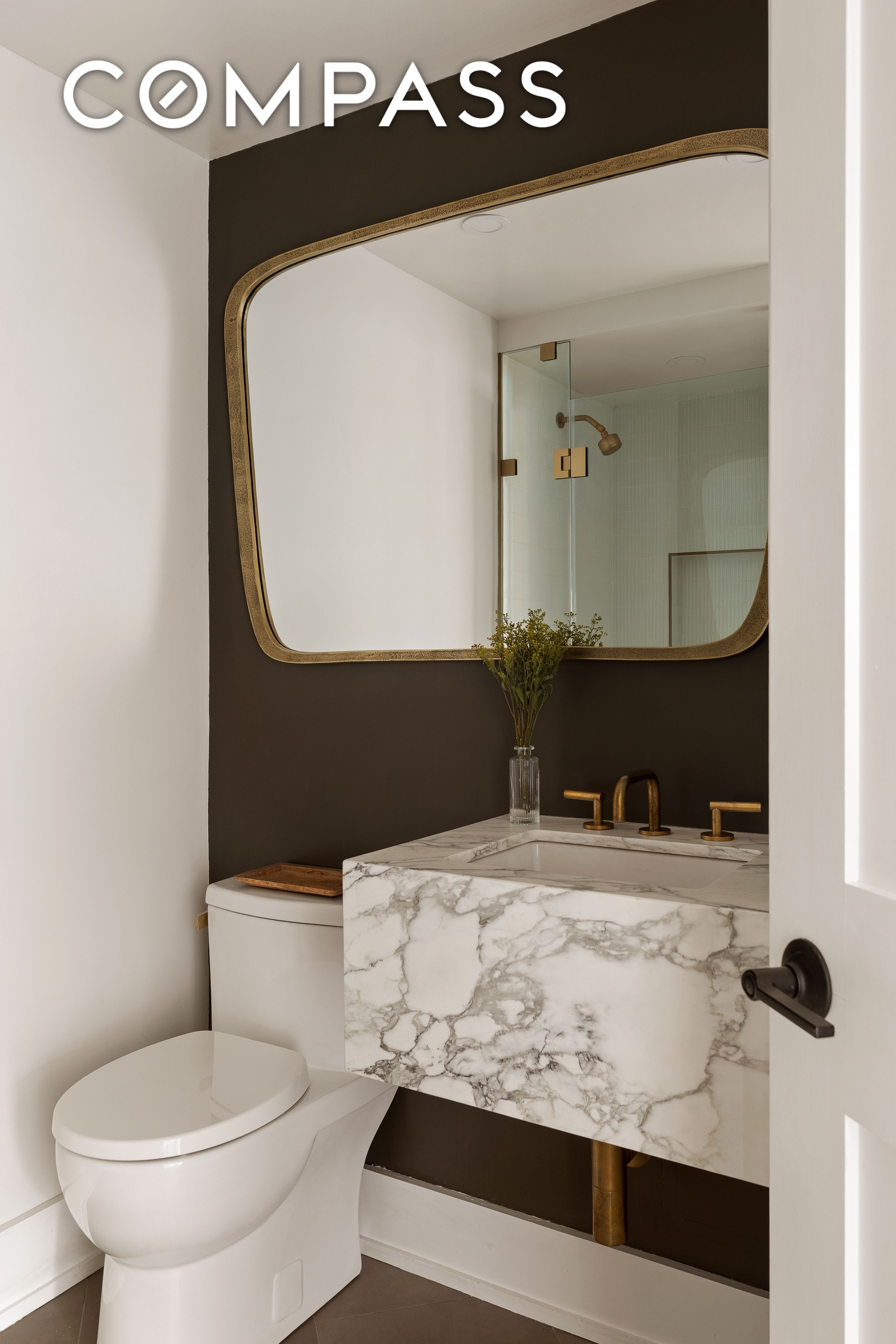 The layout has an organic flow to it while maximizing the space to the fullest, as the dining and living spaces warmly greet you and your guests, yet tucked around both corners, you’ll find the wings that house the bedrooms to feel private and secluded. All bedrooms have very generous closets, can fit king-size beds, and get plentiful light from open views. The primary bathroom features Bianco Dolomite tiles, a jet shower, radiant heat floors, Robern double medicine cabinets, and a custom vanity. The guest bathroom is complete with a Restoration Hardware vanity and Asian statuary marble tiles, and the hallway bathroom features a marble vanity and aged brass fixtures.