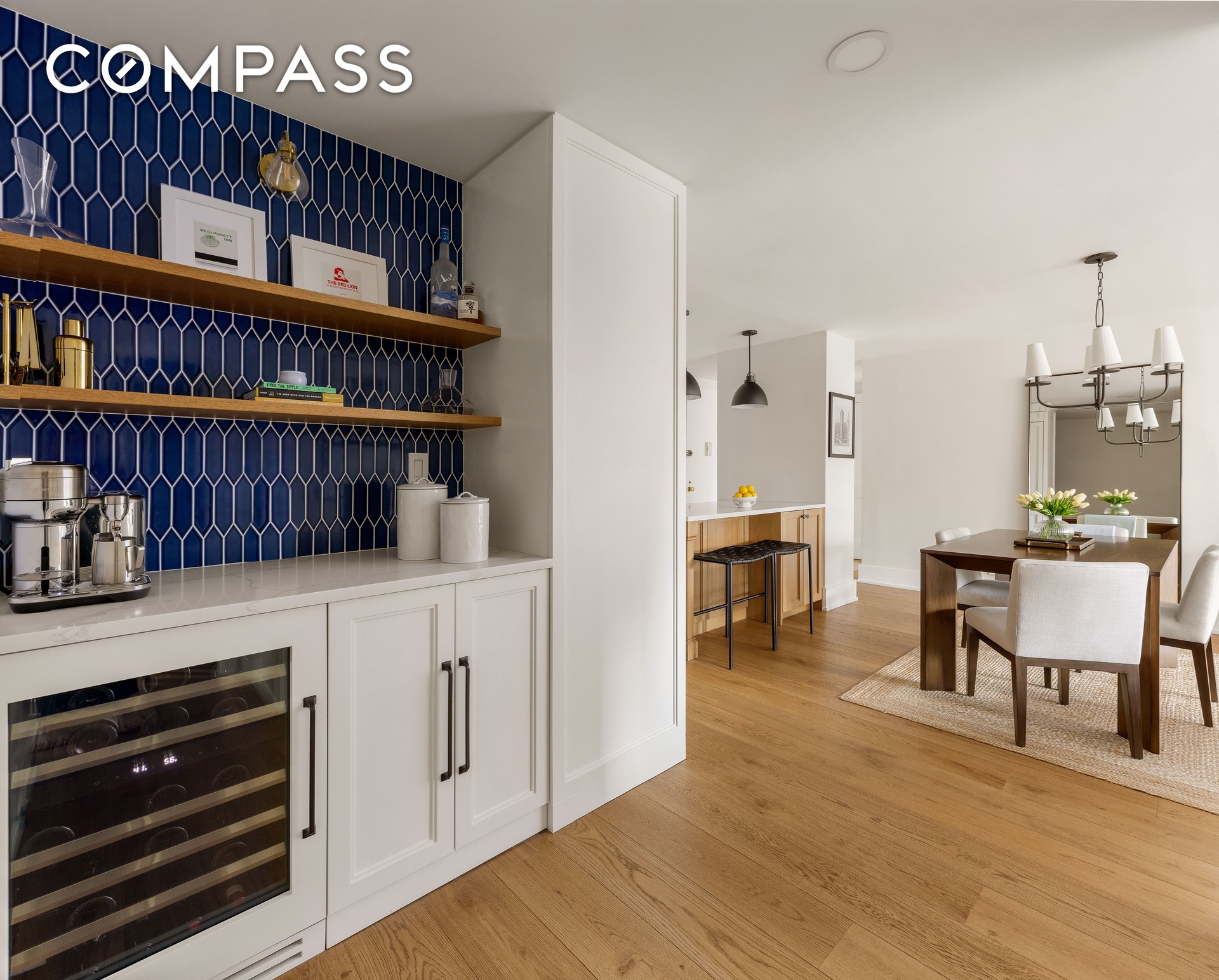 Upon entering into the generous entry foyer and continuing right, you’ll find yourself arriving in a gut-renovated and gracefully wide chef’s kitchen, the perfect setting to enjoy casually arranging meals with others in the space, completing extensive meal prep on the ample counter space, or just quietly enjoying a cup of coffee while basking in the morning light. This magnificent kitchen is outfitted with Thermador appliances, a Moen faucet, a Kohler cast iron kitchen sink, a Quartz countertop, and a wine refrigerator in the bar area. Flowing out from the kitchen, you’ll enter your living and dining room, which are highlighted by recessed lighting and three large west-facing windows with open city views, further heightening the bright and airy feel of the property.