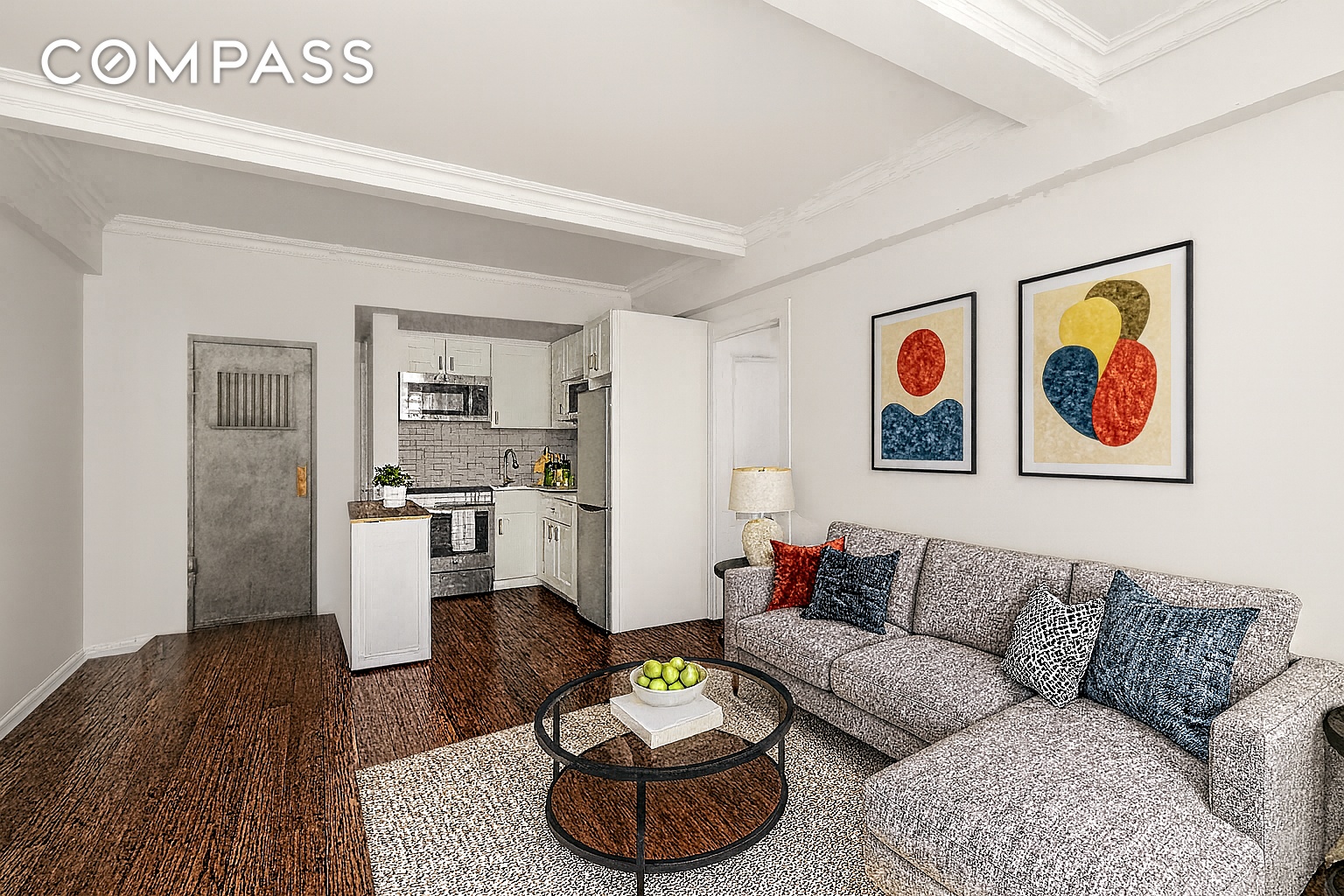 As you enter, you're greeted with the glow of eastern light showcased in classic casement windows. The living/dining space is comfortable and generous at every turn. It offers ample space for a dining table, a living room setup, and even a small office space. It is complemented by pristine hardwood oak floors and an elegant 8'6" beamed ceiling. Tying the living space together is an open chef's kitchen clad in stainless steel appliances.