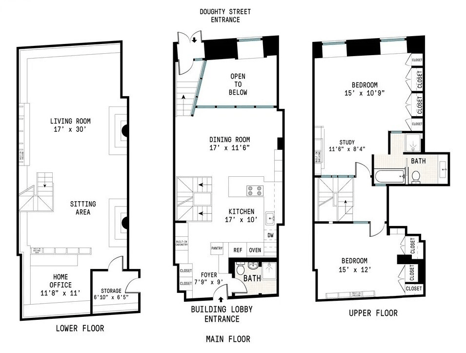 The main floor features dramatic 11-foot ceilings, exposed brick, chef's kitchen that flows into a dining room and living room. Also on this floor is a second private entrance that opens directly onto the tranquil, Doughty Alley so you can enter and exit without going through the lobby. Great for those who have pets.