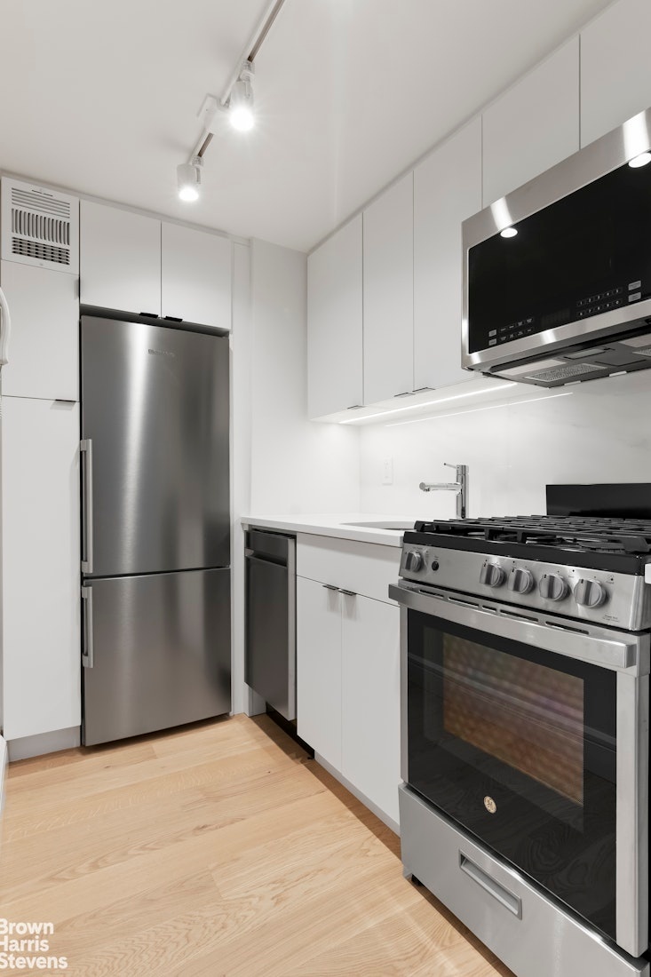 Perched on the 10th floor of 405 East 63rd Street, this sun-drenched, south-facing studio has been meticulously gut-renovated to combine modern elegance with everyday comfort. The expansive living area, featuring three north-facing windows, offers flexible space to create distinct sleeping, living, and dining zones. The chef-inspired kitchen showcases Catalina White Gloss cabinetry, Caesarstone Blizzard Quartz countertops, a polished chrome Grohe faucet, and sleek black hardware. Premium appliances-including a Blomberg refrigerator and GE Profile range, microwave, and dishwasher-add both sophistication and convenience.