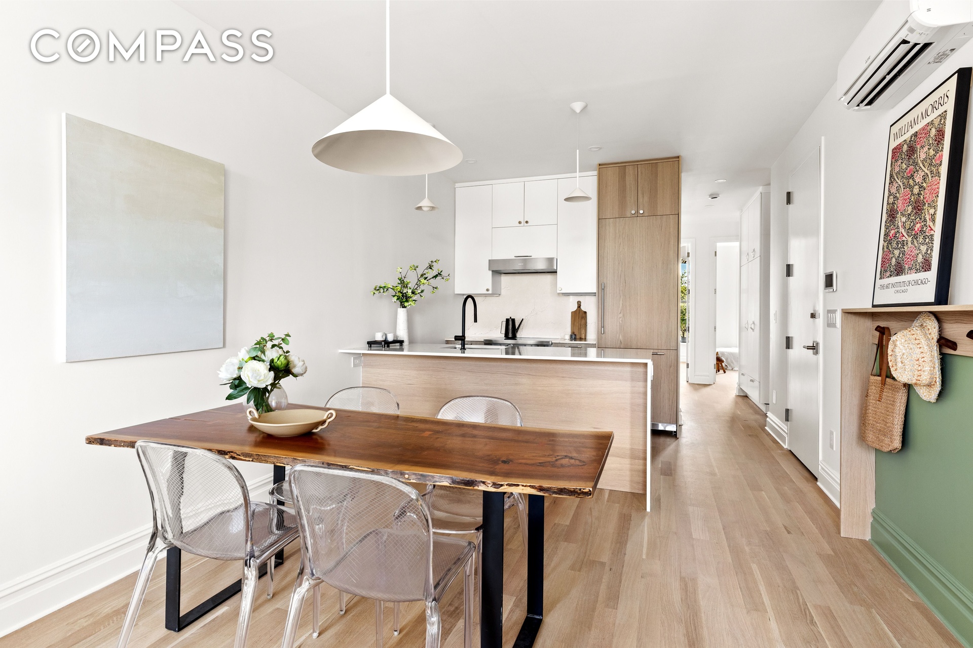 The living and dining areas flow seamlessly into a well-appointed kitchen with Shinoki Oak drawer and door fronts. Appliances include a top-of-the-line Bertazzoni induction range, a Miele range hood properly vented to the outside, and a Fulgor-Milano fridge. Friends and family can gather around the island, seated on barstools, to keep you company as you cook. The dining area has room for a table that seats at least six.