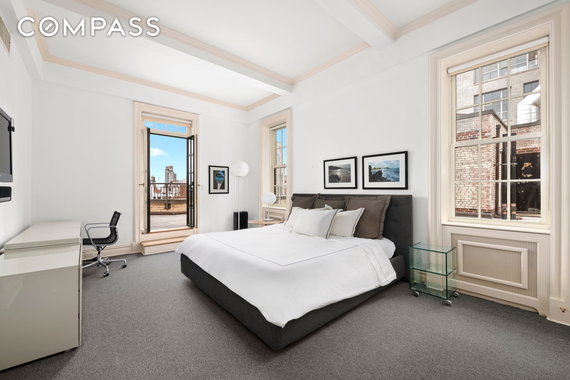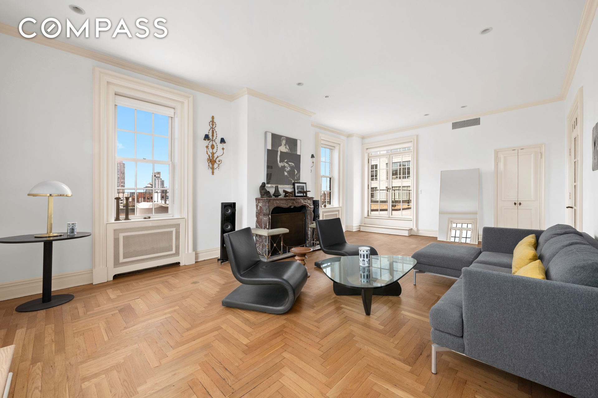 A private elevator landing opens to a gracious foyer leading to a magnificent corner living room with three exposures, a wood-burning fireplace, and two sets of French doors that open directly to the terrace. Soaring 11-foot ceilings and sun-drenched city views create a remarkable sense of light and scale.