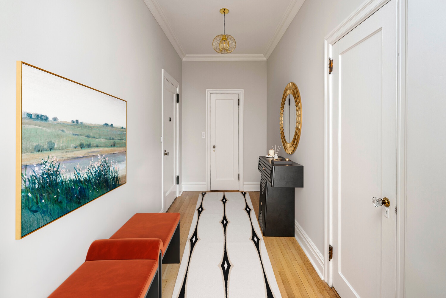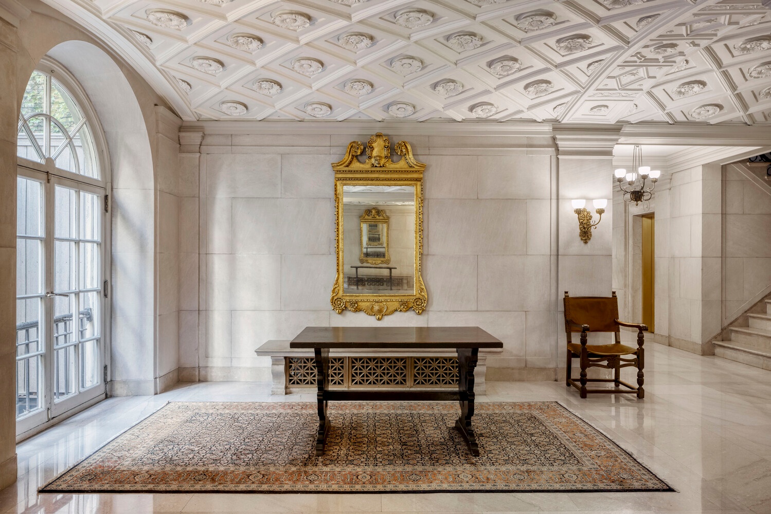 To retain the character of the original living room the distinctive cove crown was retained. A custom-designed mantle was built around the original Potoro marble surround of the rare working WBF, along with the addition of a Nero absolute granite hearthstone which is also used throughout the apartment for the window sills. Electrified fireplace sconces replaced candles. The concept of the living room was to provide layered lighting. The recesses, chandelier, and sconces are all LED on separate dimmers and can be used singularly or in tandem. All the electrical and plumbing throughout the apartment has been completely redone and is completely new. Period appropriate crown and base moldings were restored or replaced. Astor Court's 4J is aperfect synergy of Neo- Renaissance and contemporary utility.