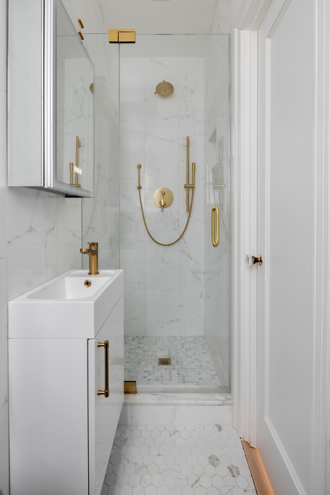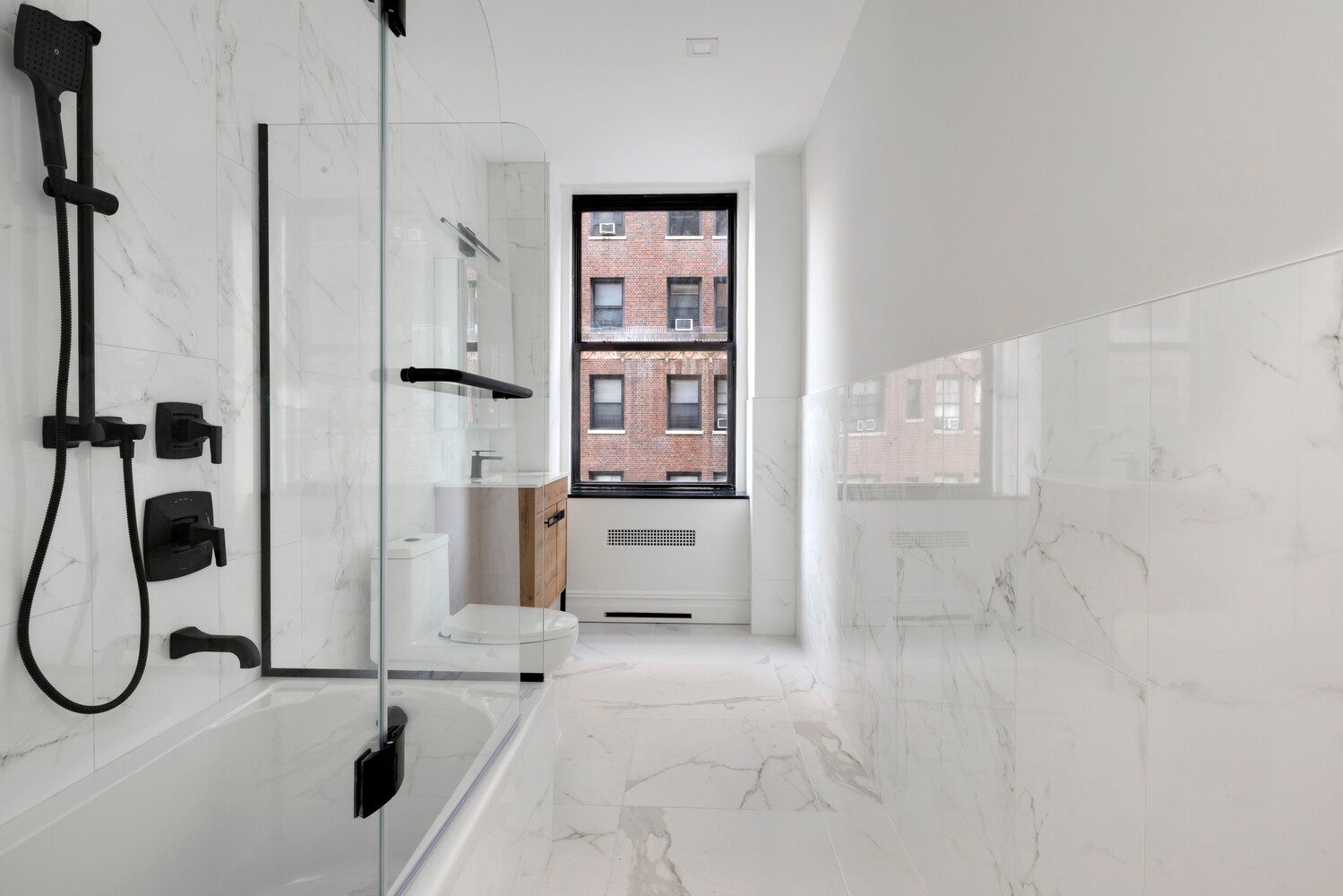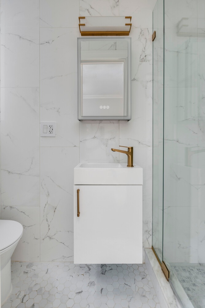 The generous master bedroom has large his and her closets. An en-suite full bath with step in shower, newly enlarged and conceptualized with a Grohe shower system, including handheld, and walls done in large format Porcelanosa wall tiles. A custom shower door was commissioned. The medicine cabinets in both bathrooms represent the best of new conveniences with built-in touch-control integrated light, USB ports and a defogger. The secondary bathroom provides continuity with Porcelanosa large format tiles and a new tub with tile surround. The tub is enclosed by a two-sided glass tub shower door, minimalist wood vanity, granite window sill and a Grohe design shower system with shower head and handheld intended for a tub configuration. Directly across the hall there is a linen closet for convenient access to toiletries, sheets, towels.