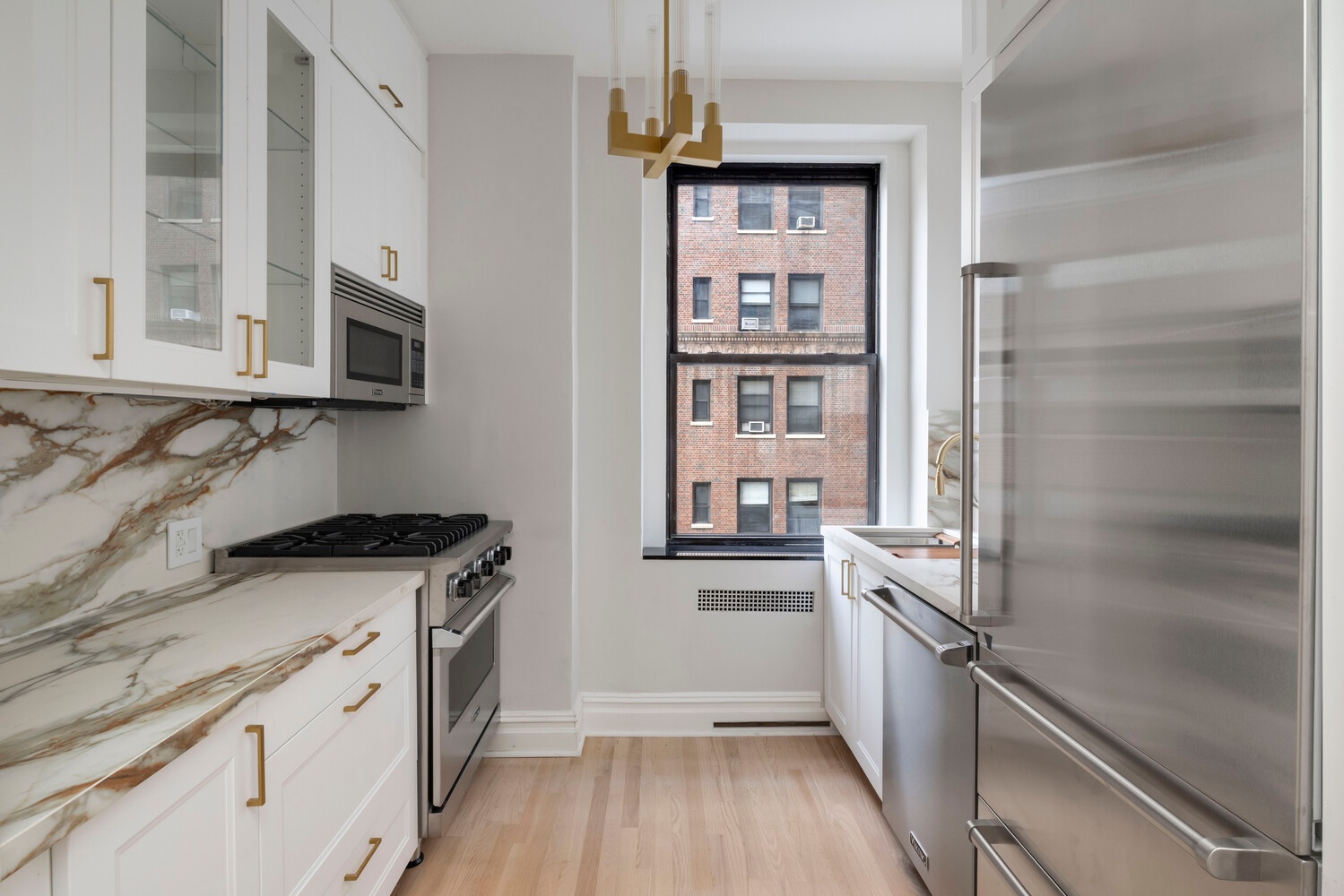 The large-windowed kitchen includes a Sub-Zero refrigerator, a Viking stove, dishwasher, microwave, a Kraus faucet with pull-down sprayer with a matching water purifier spigot. A dramatic Levantina Spanish sintered stone countertop and backsplash brig the look of the kitchen into 2025. The original hardwood floors were refinished and a new hardwood floor installed in the kitchen to restore the original intent. Undermount task lighting is there to facilitate your entertaining.