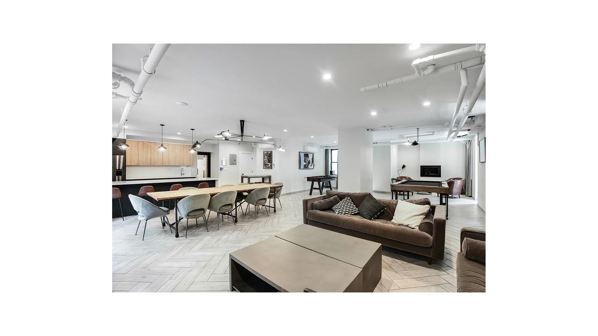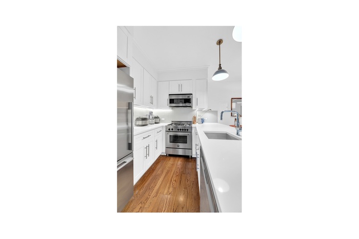 Step into timeless elegance with this top floor, impeccably reimagined 2-bedroom, 2-bathroom residence, offering an expansive loft-like layout and exquisite designer finishes throughout. The grand living and dining area is complemented by an open, windowed chef's kitchen-a true centerpiece featuring Fisher & Paykel and Bosch stainless-steel appliances, custom white shaker cabinetry, and polished white quartz countertops, perfect for both entertaining and everyday living.