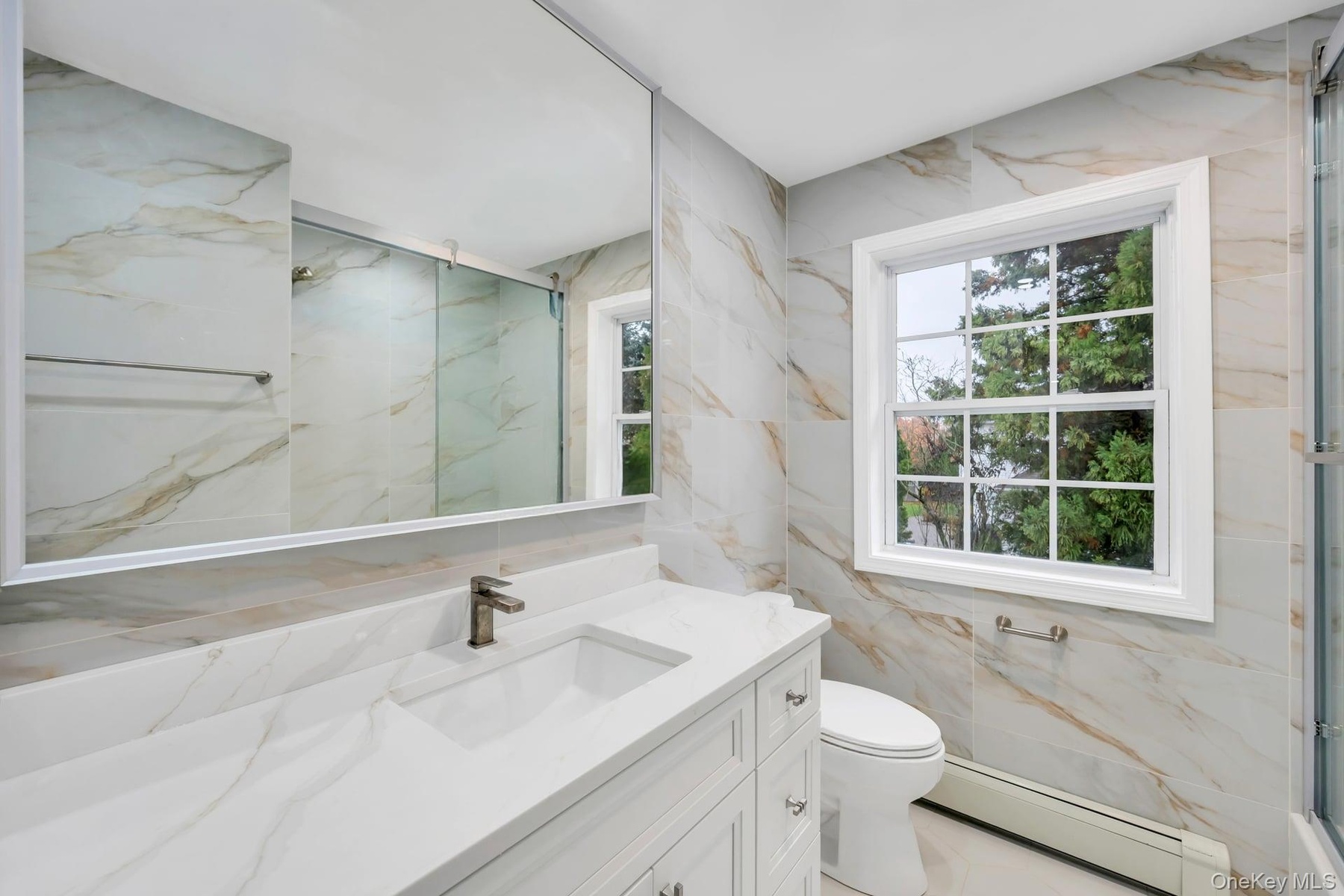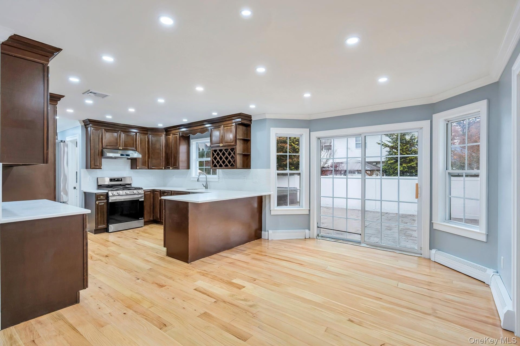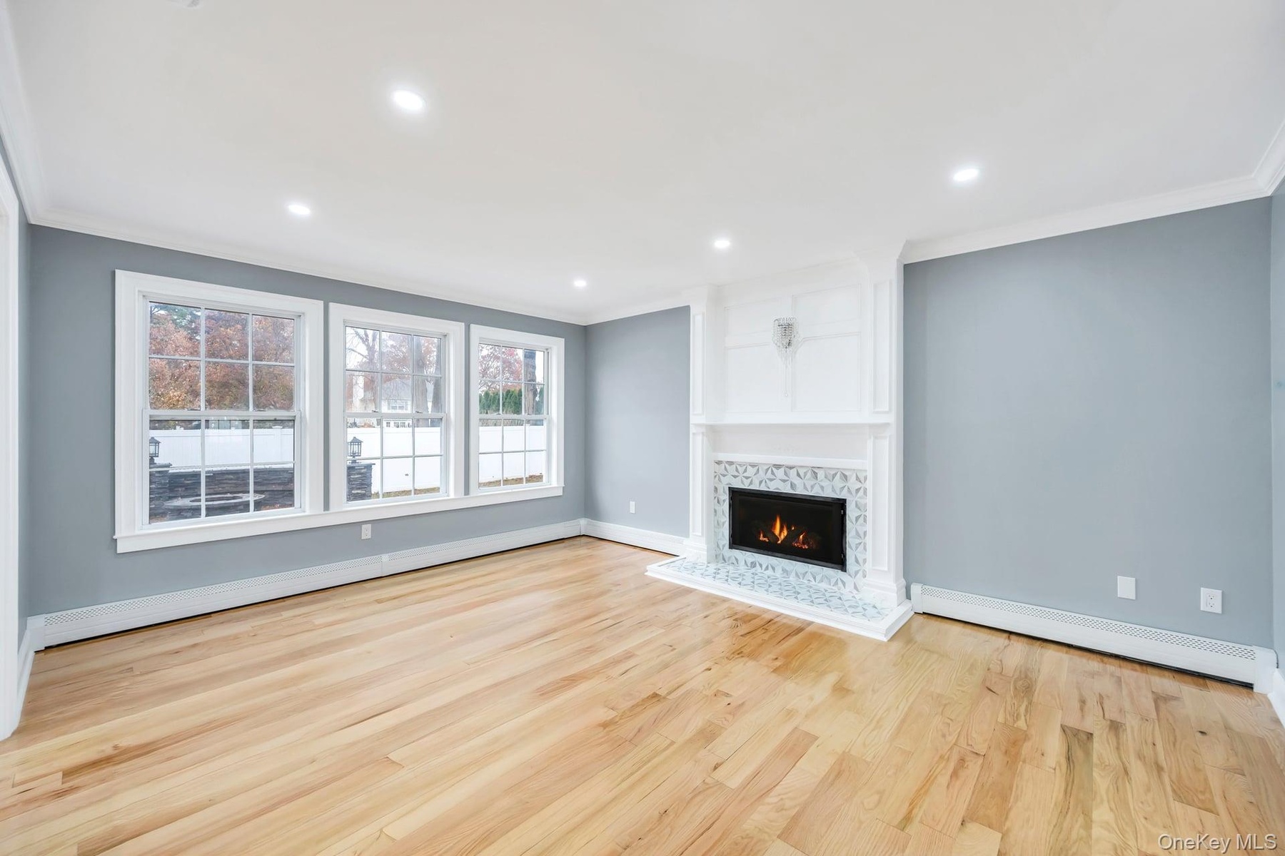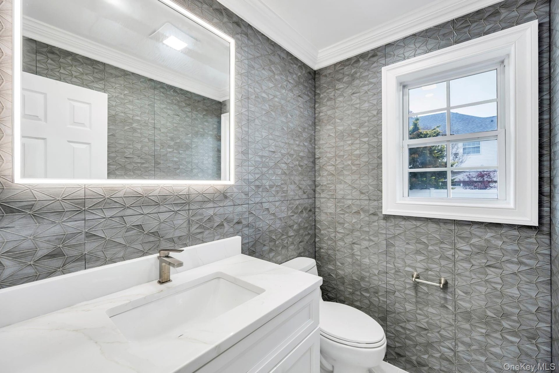 Perfectly positioned mid-block on a beautiful street, this newer-built home combines high-end finishes, craftsmanship, and comfort from the moment you arrive. The exterior makes an immediate impression with a full paving stone driveway and walkway leading to the front entrance, flanked by two cultured-stone pillar lights and a striking partial cultured-stone front facade. Step through the grand two-story entry and be greeted by a dazzling crystal chandelier, 8-foot ceilings, and brand-new hardwood floors throughout. To your right, the formal living room is filled with natural light and finished with elegant custom molding. The open flow continues into the warm family room featuring a custom wood-burning fireplace with detailed box molding and granite tile surround. The chef’s kitchen is a showstopper with rich walnut cabinetry, quartz countertops, a white ceramic tile backsplash, an abundance of counter and cabinet space, brand-new LG stainless steel appliances, and a gas stove. The kitchen opens seamlessly into a formal dining room perfect for hosting. The first floor also offers a new designer powder room, pantry, and a mudroom with washer/dryer hookups and cabinetry. Upstairs, all bedrooms are generously sized, including an enormous primary suite featuring recessed lighting, hardwood floors, and an incredible custom California closet system with shelves, drawers, and endless hanging space. The spa-like primary bath offers an oversized glass-enclosed rainfall shower, a stone hexagon shower floor, porcelain floor-to-ceiling tile, a double quartz vanity with a gray base, and an oversized framed mirror. The fully renovated hallway bath includes a tub with glass shower, octagon tile flooring, and a white vanity with quartz countertop. Every door throughout the home is brand-new six-panel style, and the entire interior has been freshly painted. The full finished basement provides additional living space with high ceilings, baseboard heat, herringbone-pattern porcelain tile flooring, new basement windows, and a brand-new hot water heater. The gas burner has also been updated. Outside, the resort-style backyard is built for entertaining with a massive paver patio, fire pit with built-in bench seating, two cultured-stone lighted pillars, and an outdoor kitchen featuring dual-level bluestone counters, a stainless steel sink, wine fridge, barbecue, and two additional propane burners—all surrounded by white PVC fencing for total privacy. This home delivers unmatched attention to detail, elegant finishes throughout, and a layout perfect for both everyday living and unforgettable entertaining.