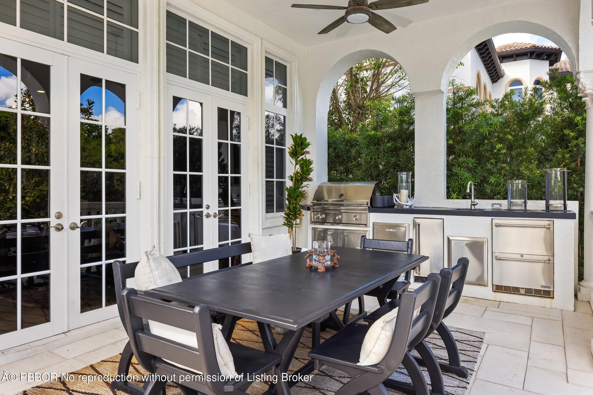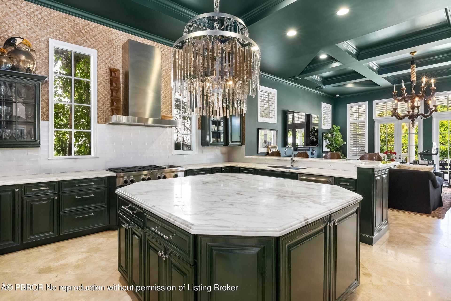 Gorgeous double-height living room with fireplace. Chef's kitchen with oversized island and breakfast bar opens to family room. Oversized Primary Suite with balcony features beautiful water views. Highlights include formal dining room, elevator, and 3 car garage. Stunning loggia with built-in summer kitchen is perfect for entertaining.