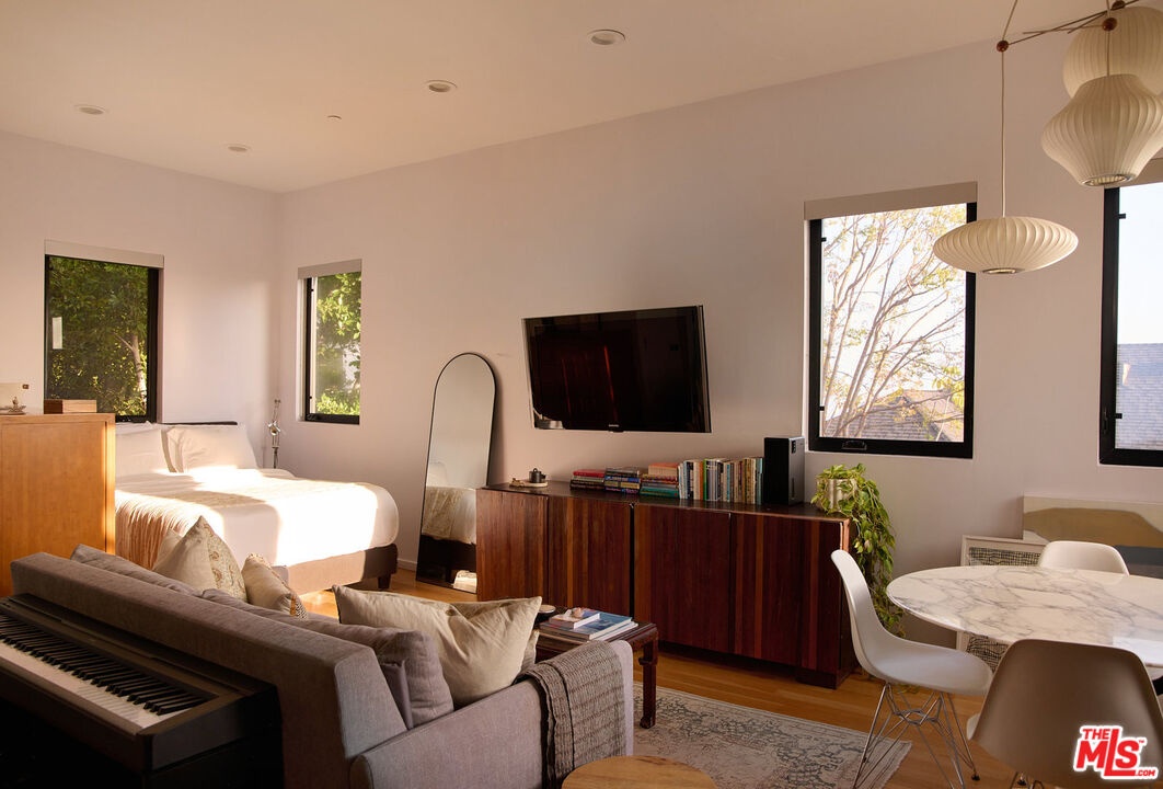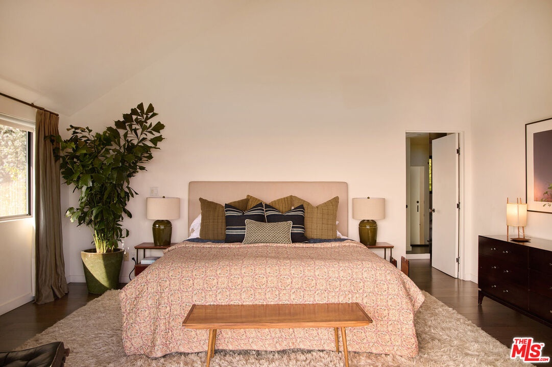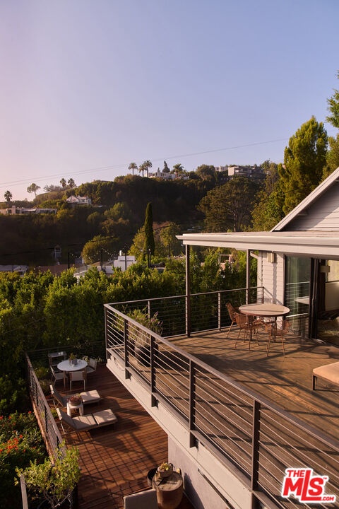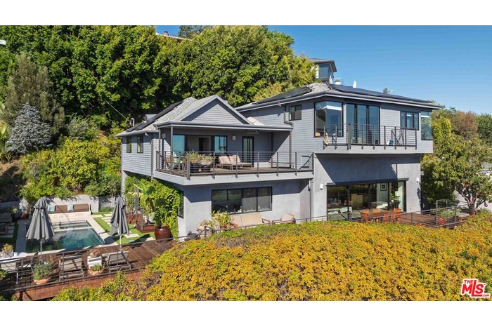 Set high above the city in the coveted Hollywood Hills, this three-story architectural retreat with Guest house is the epitome of refined Los Angeles living. Sprawling 180-degree panoramas stretch from the Downtown skyline to the Pacific Ocean and on the clearest days, Catalina Island graces the horizon. Tucked away behind lush, mature, and terraced landscaping on a private estate lot, the residence offers five sumptuous bedrooms and six baths, married with the serenity of a hideaway yet moments from the cultural energy of the city. Walls of glass dissolve the boundary between inside and out, while multiple terraces beckon the mild Southern California climate. The interiors glow with wide-plank wood floors, recessed lighting, and vaulted ceilings with exposed beams a warm, architectural counterpoint to ultra-modern finishes. At its heart, the chef's kitchen dazzles: a restaurant-grade La Cornue range anchored by custom oak cabinetry, dual dishwashers and premium fixtures frame a space made for effortless entertaining. Adjacent open dining and living zones flow seamlessly to an outdoor lounge and expansive deck a rare luxury in the Hollywood Hills and an entertainer's dream as the sun dips below the Pacific. A versatile TV room/den, complete with closets, offers the flexibility to serve as an additional bedroom ideal for guests or a private retreat. Upstairs, the primary suite unfolds like a resort retreat complete with walk-in closet, spa-inspired bath, and private terrace with sweeping views. Just off this level, the second terrace features built-in outdoor heaters perfect for year-round comfort while enjoying the breathtaking panorama. The third level presents a purposeful family room, wet sink and fridge for convenience, plus three uniquely finished guest bedrooms each with their own ensuite bath and generous storage. Enjoy ultimate convenience with a full laundry room downstairs and an additional laundry area complete with washer and dryer tucked neatly into the upstairs bathroom. Step outside and live as though on vacation every day: multiple terraces and patios, lounging zones, a shimmering pool and spa all arrayed to capture light and view. With the smart iAqualink system, pool and spa temperature and settings are controllable remotely pure ease and the automated fully retractable pool cover adds an extra layer of conveience and saftey. Two motorized sun-shades elegantly manage light and privacy throughout the day. Underpinning the beauty is serious forward-thinking infrastructure. Fully paid $30,000+ Tesla solar panels promote eco-conscious living while lowering energy cost. A whole-house water filtration system, whole-house fan, in-wall flat screens (three), Sonos sound zones (7 indoor, 4 outdoor), Nest cameras, Rachio irrigation system and a 240-volt NEMA 14-50 outlet in the garage for EV charging all converge in a home that's as smart as it is chic. A detached guest structure includes a full kitchen, bath and its own courtyard ideal for visiting friends, extended stays or a boutique home office. This is more than a home it's a statement of mega-design, technological intelligence and panoramic beauty. With its vantage from the heights of Los Angeles, it delivers luxury, sustainability, privacy and spectacle in equal measure. Truly a rare opportunity to own a hillside haven with views from downtown to the sea.