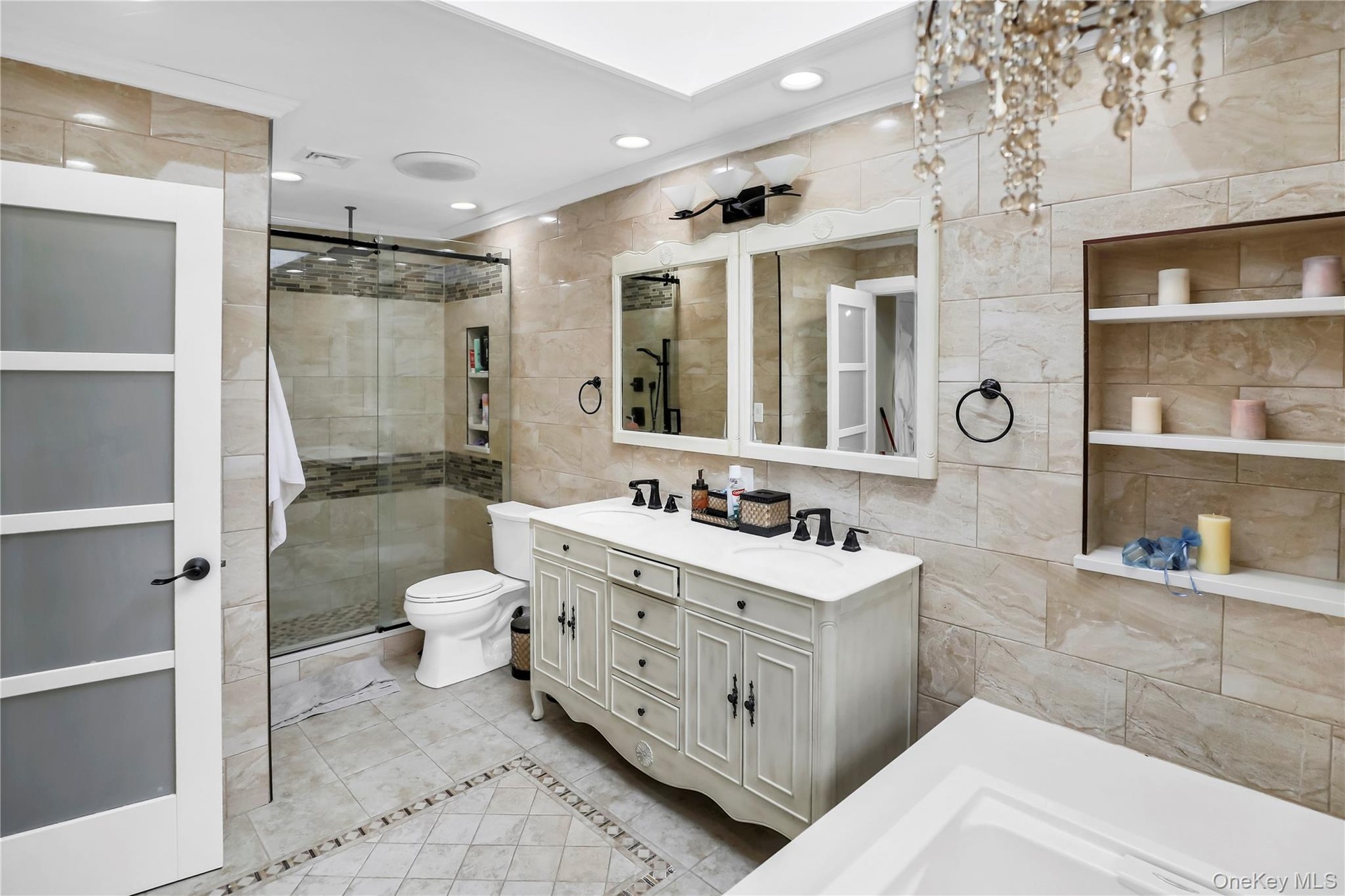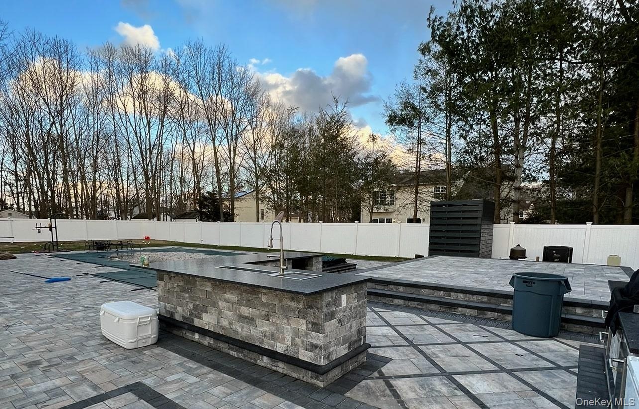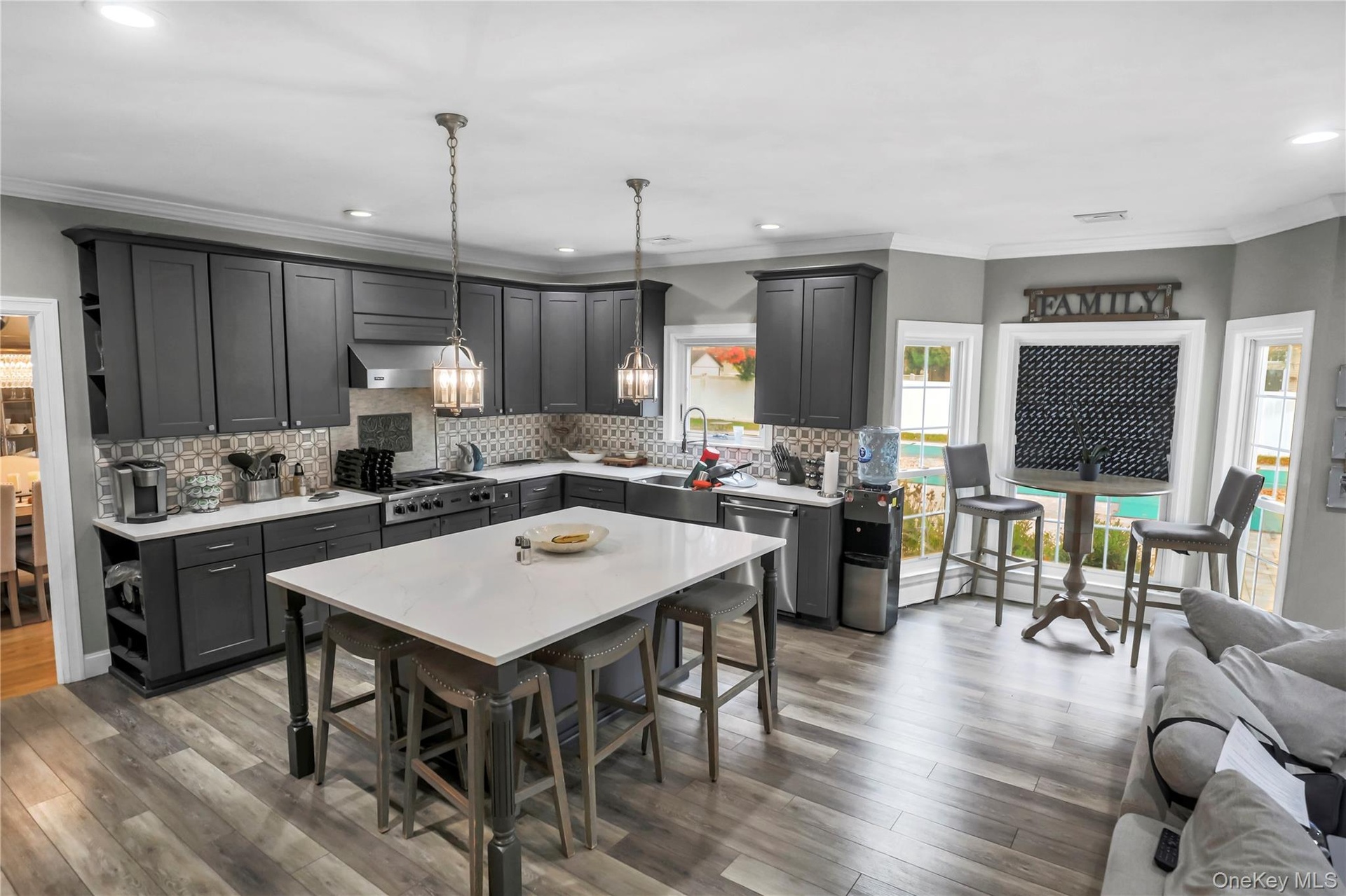 Welcome home to this grand 5-bedroom, 3-bathroom residence in Lake Grove, a part of the Three Village School District. This home greets you with a grand two-story foyer, with hardwood floors throughout, elegant wainscoting, and a gleaming chandelier. The open-concept living room boasts cathedral ceilings and an arched window that fills the space with light. The heart of the home is the kitchen, masterfully designed with a massive island, floor-to-ceiling cabinetry, and a Viking brand appliance suite. This space opens seamlessly into a cozy family room with a stone electric fireplace, ideal for daily gatherings. The primary suite offers a vaulted ceiling, his-and-her closets, and a full bath with a double vanity, soaking tub, and separate glass-enclosed shower. The home also includes four additional bedrooms and a finished basement, providing an ideal space for a rec room. The exterior features stone and vinyl, with a stately circular paver driveway. The private backyard hosts pavers around the heated saltwater pool with a relaxing infinity-edge hot tub that flows directly into it. This is complemented by a gourmet outdoor kitchen with a stone-faced island, built-in grill, and sink, all set beside a raised paver patio. A private outdoor shower completes the space. Key upgrades within the last three years include the roof, Anderson windows, renewed bathrooms, kitchen, and the A/C compressor. Waiting for you to move into this dream home!
