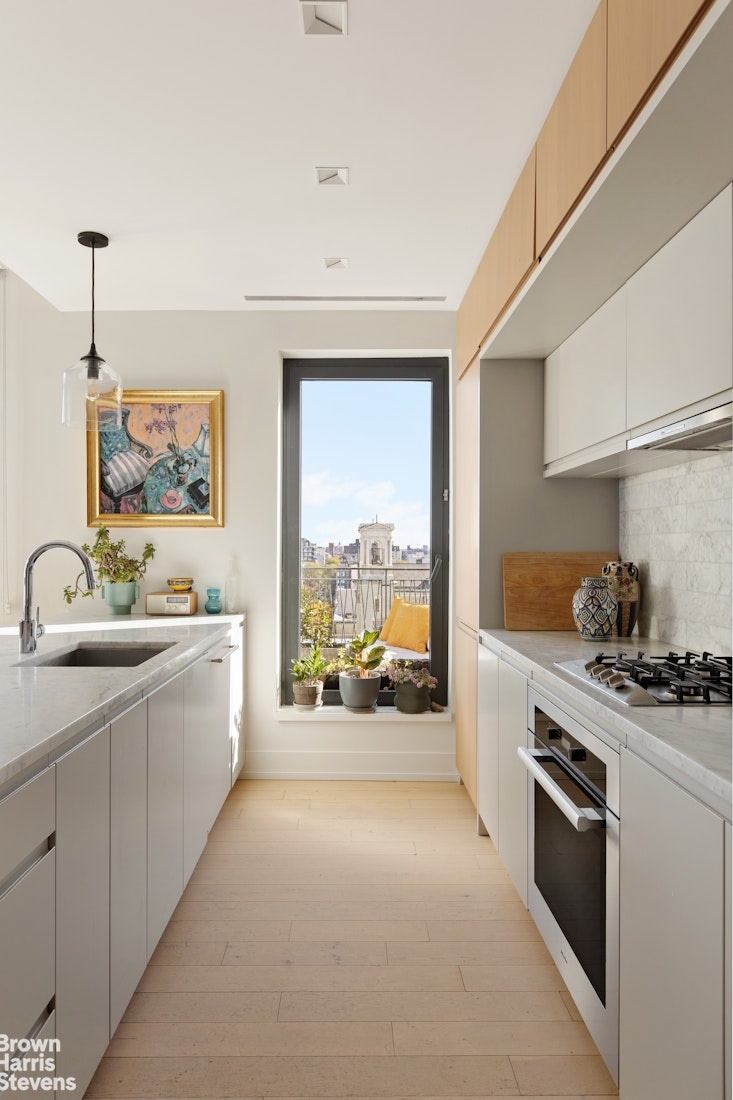Floor-to-ceiling windows flood the 1308 square feet of the home with natural light, highlighting its elegant finishes and airy layout. The gourmet kitchen is a dream for both everyday living and entertaining, featuring a full suite of Miele appliances, sleek custom cabinetry, and a waterfall countertop island offering additional seating and prep space. A massive walk-in coat closet anchors the entryway, ensuring an organized and functional home.