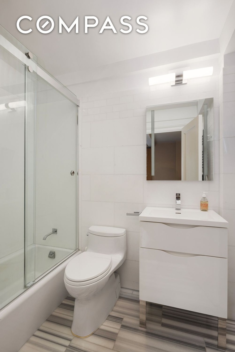 Welcome to #2E at 45 Christopher Street, a 2 bedroom, 2 bath condominium with terrace, wood burning fireplace and split AC system in West Village’s most distinguished Bing & Bing pre-war condo. Enter this ~1,240 sqft residence to a gracious foyer, with two large closets, which leads to the expansive south-facing living room. Beamed ceilings, a wood-burning fireplace with a stylish mantel, and double-paned windows framing the charming south views, enhance this elegant room.