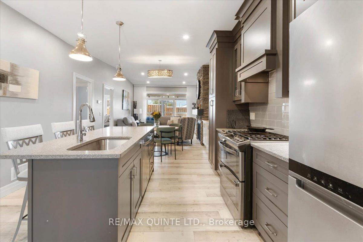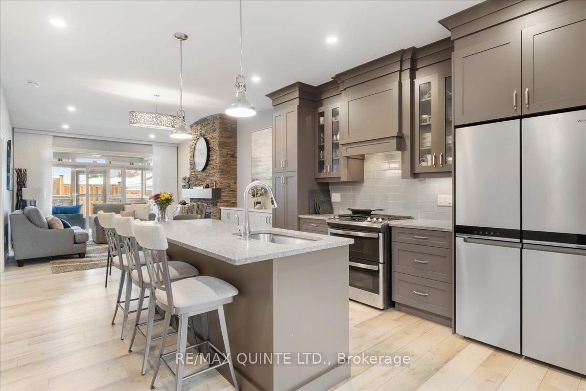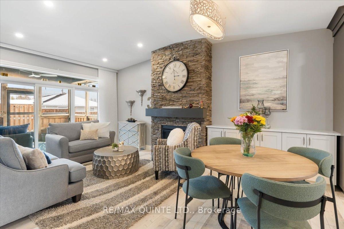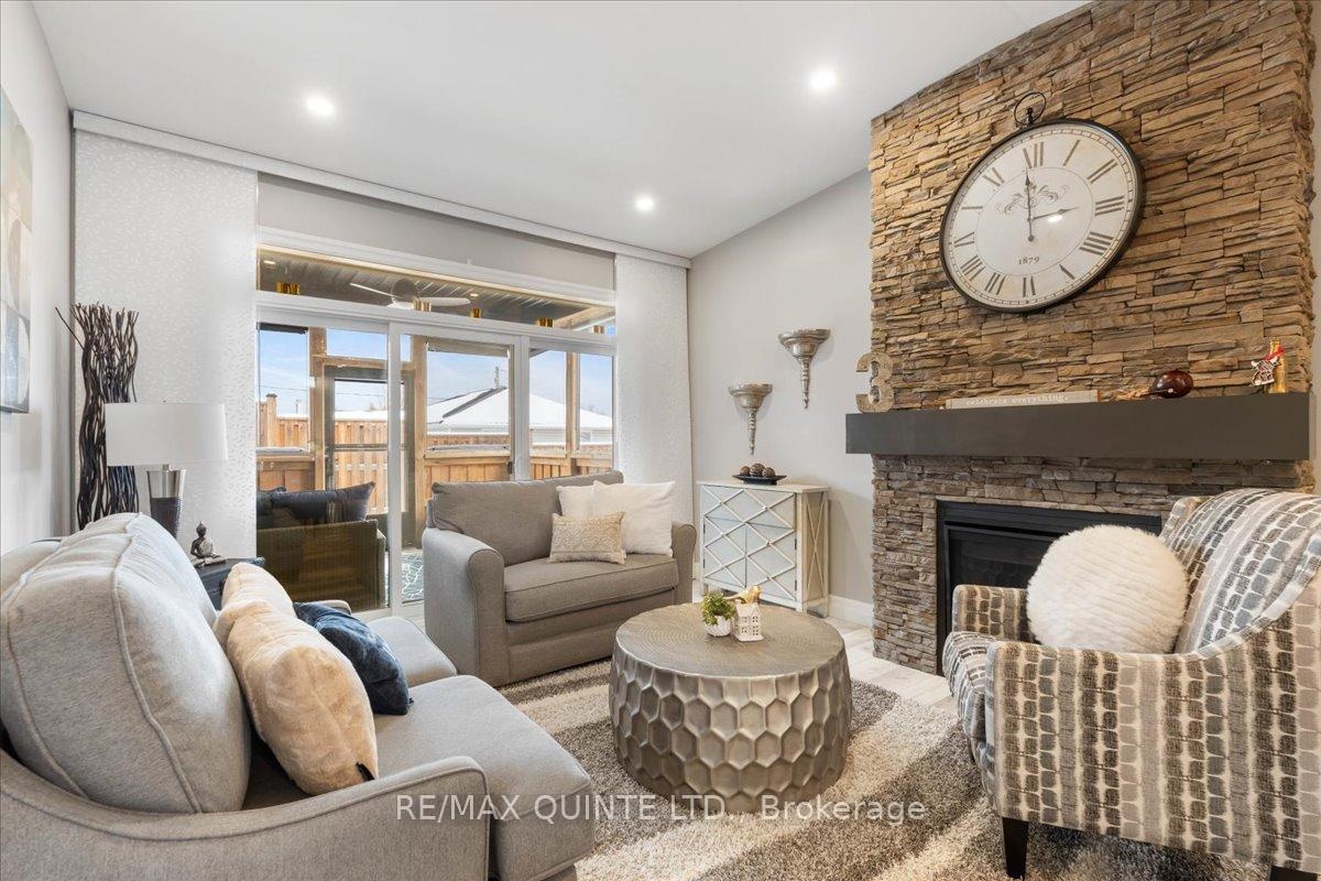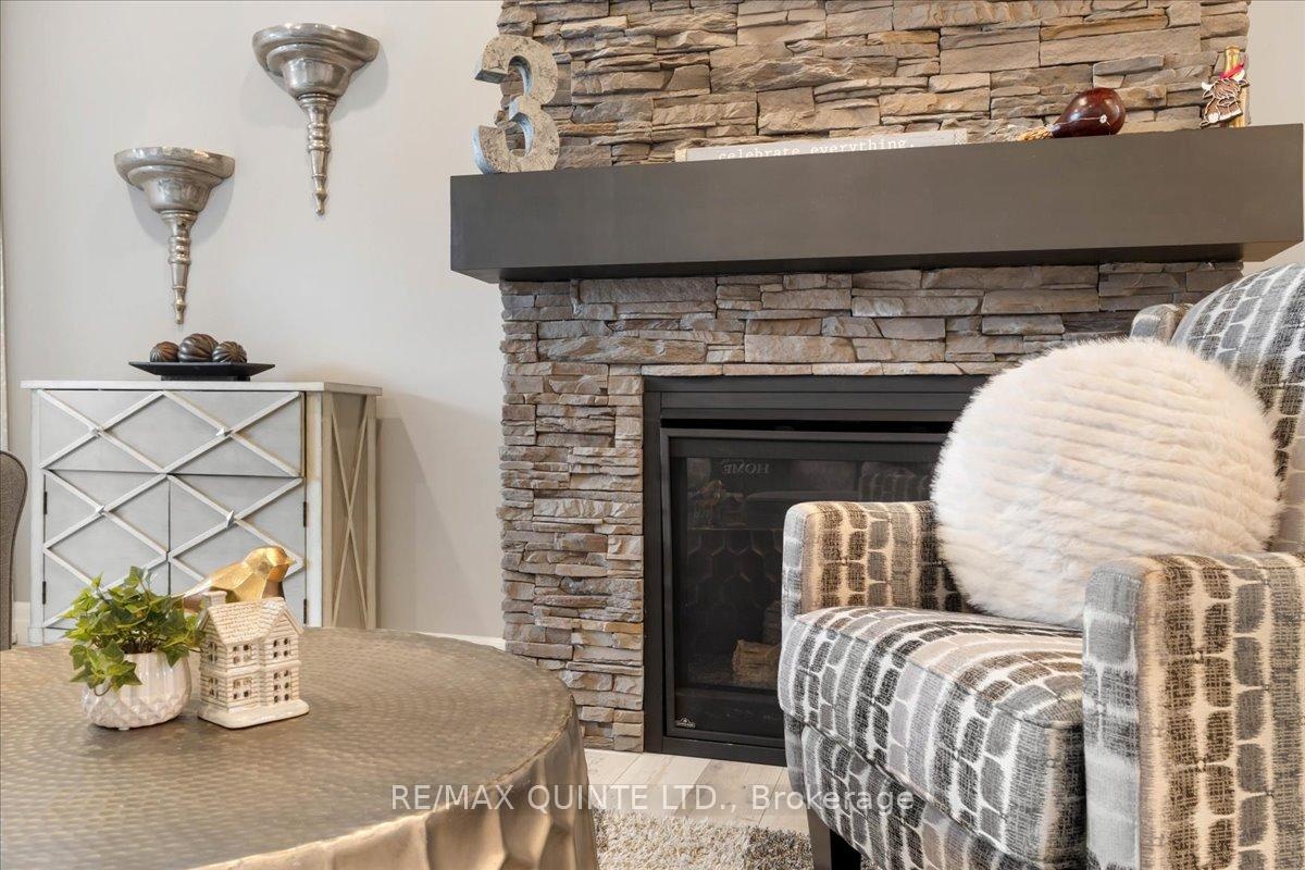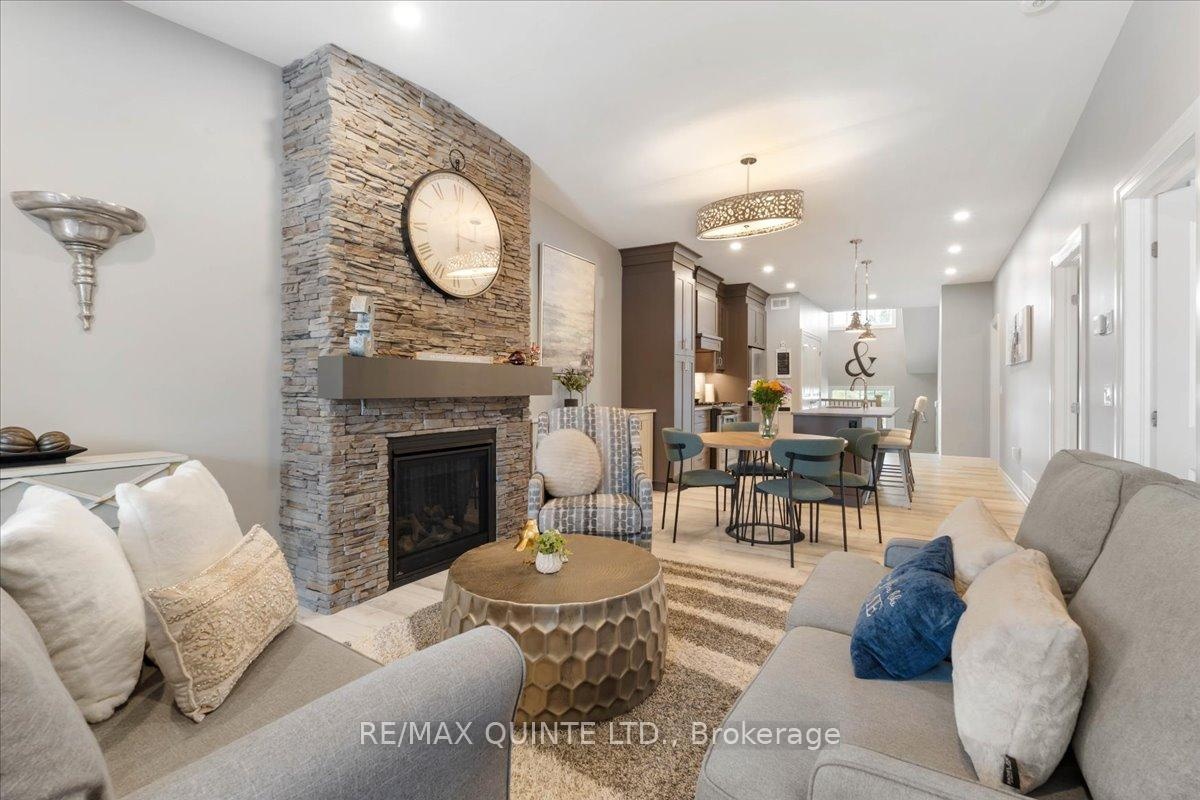 Modern Comfort Meets Country Calm in Stirling. Welcome to this stunning end-unit townhome-a rare find tucked into a quiet cul-de-sac surrounded by nature and beautiful views of the Oak Hills. Thoughtfully upgraded and meticulously maintained, this home blends modern convenience with peaceful, easy living just minutes from all Belleville and Quinte West amenities while taking in the small town charm and history in Stirling. You will notice the impressive curb appeal, with a paved driveway offering parking for four vehicles and inside entry to a fully finished garage-complete with its own water spout for easy cleaning. Step inside to a spacious foyer and an open-concept main floor with warm finishes and natural light throughout. The designer kitchen features ceiling-height cabinetry, a central island, and a built-in buffet. Enjoy extended space for entertaining during holiday meals that flows seamlessly into the dining area-perfect for gatherings. The living room features a vaulted ceiling, a cozy gas fireplace with stone surround, and large patio doors leading to a screened-in sunroom where you can unwind and take in the panoramic views. The primary bedroom offers a spa-inspired semi-ensuite with heated floors, a deep soaker tub, and a tiled glass shower. A separate den or guest room sits conveniently beside the main bath-ideal for a home office. Downstairs, the fully finished lower level offers a spacious rec room, a second built-in buffet perfect for a coffee or cocktail bar, a large guest bedroom with walk-in closet, and a full 3-pc bath. Extra features include a Kohler generator, tankless water heater (owned), gas BBQ hookup, Levolor blinds water softener and backup hydro to the garage door-plus a partially fenced yard for added privacy. Move-in ready and filled with thoughtful upgrades, this home offers the best of low-maintenance living in a quiet, sought-after Stirling neighbourhood.