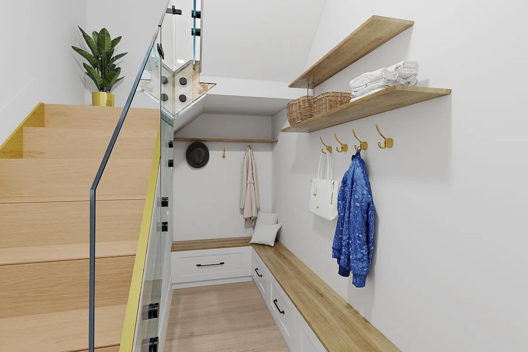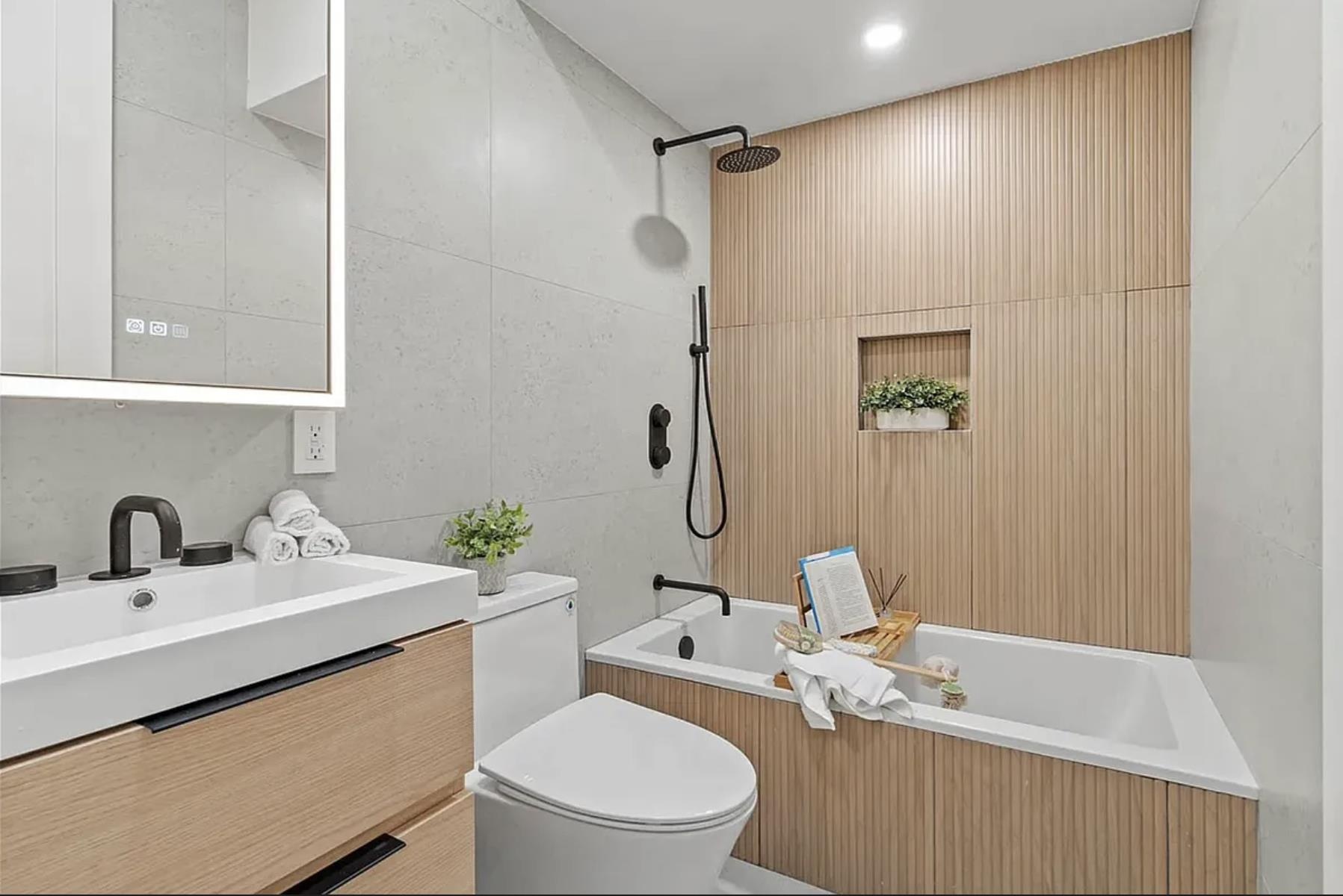 On the lower level, greeted by a bright open-concept living, dining, and kitchen space with premium finishes like floor-to-ceiling double-pane Reynaers windows, recessed lighting, multi-zone Daikin heating and cooling mini splits, and solid 7-inch engineered white oak floors with a protective acoustic sublayer.