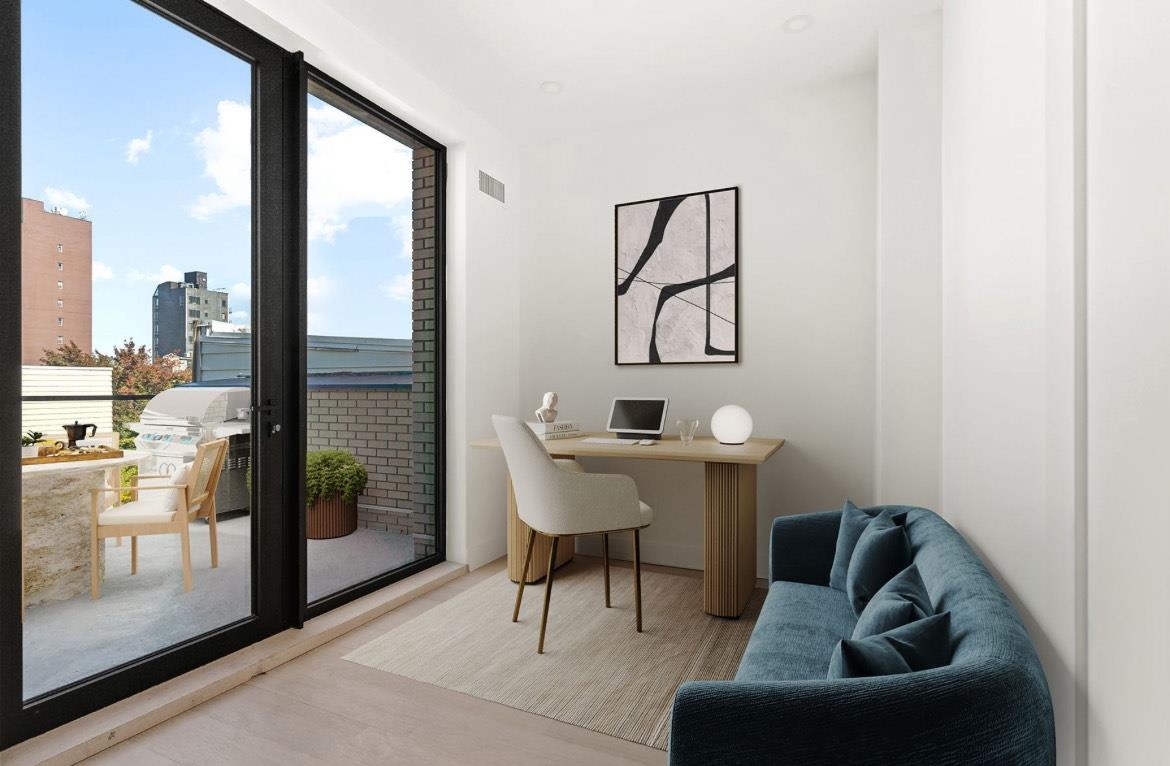 The upper level has two lovely bedrooms that flow out to the spacious second terrace. The primary bedroom has a reach-in closet and a pristine en-suite bathroom, while the second bedroom has its own closet can easily flex as a home office, gym, yoga studio, media room, or playroom, among many other possibilities.