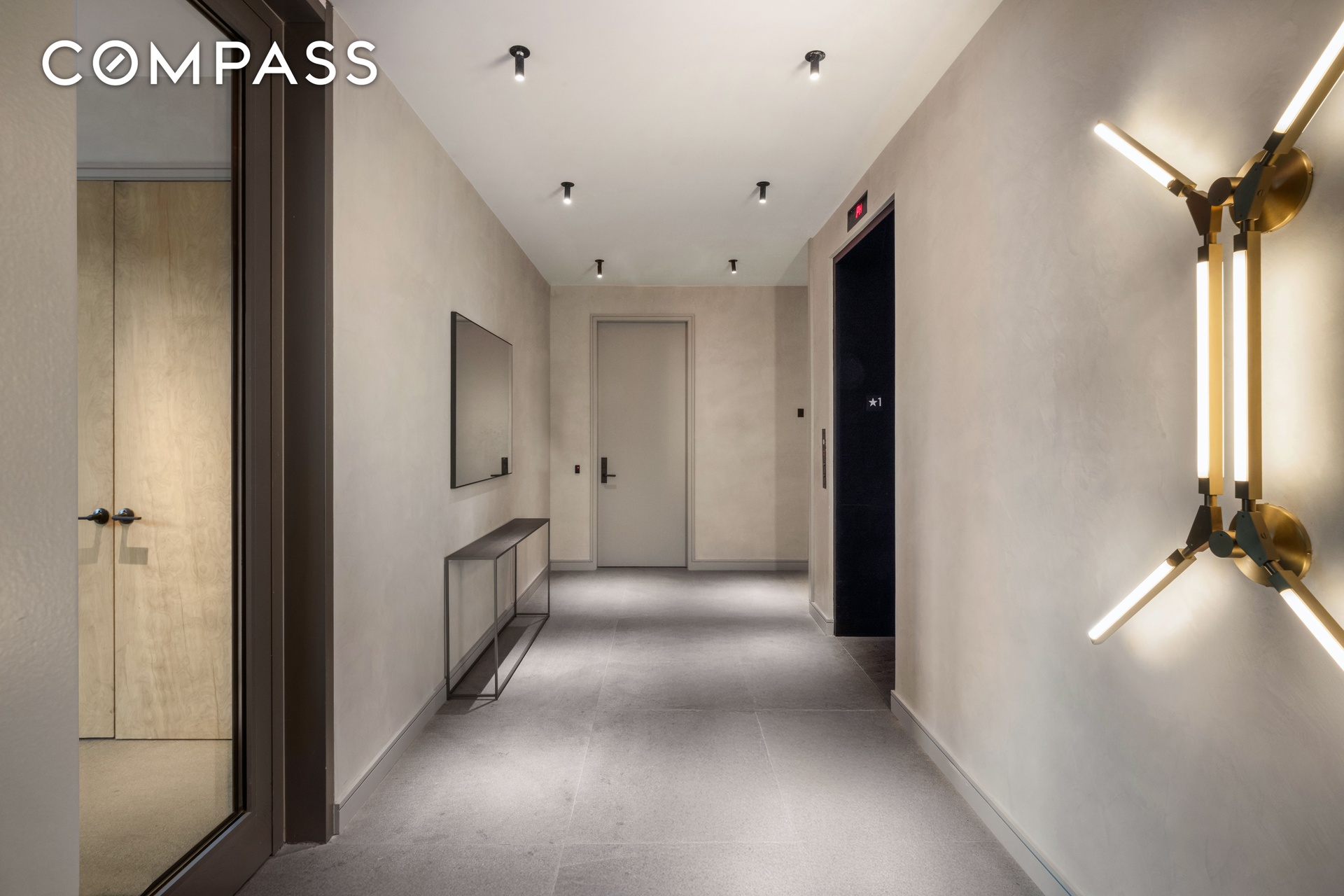 Down the hallway, seamless floor-to-ceiling doors reveal a long expanse of finished closet space feature shelving, hanging rods and an in-unit stacked LG washer and vented dryer. The sun-kissed primary suite features an expansive king-size bedroom with a wall of south-facing windows framing open-sky views. The custom walk-in closet/dressing room leads to an en suite spa bathroom finished with a freestanding soaking tub, frameless glass rain shower, an extra-wide double vanity and radiant heat floors. The sunny second bedroom offers a roomy reach-in closet and easy access to the well-appointed full guest bathroom with a large tub/shower. Crestron Home Automation System prewiring is available to control lighting, HVAC, speakers, and window shades. 421-A tax abatement is in effect until 2034.