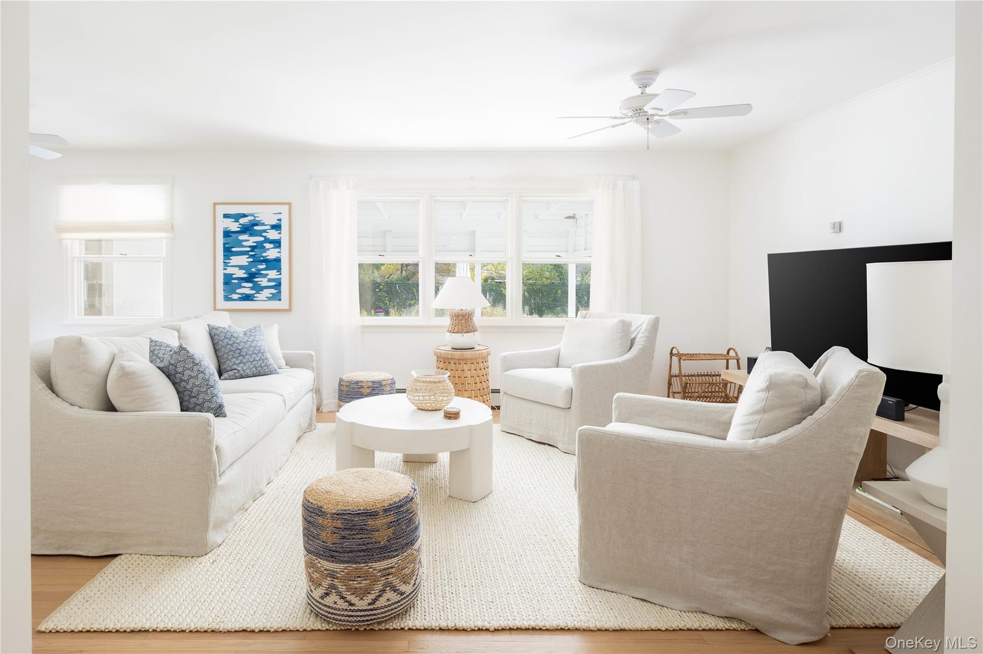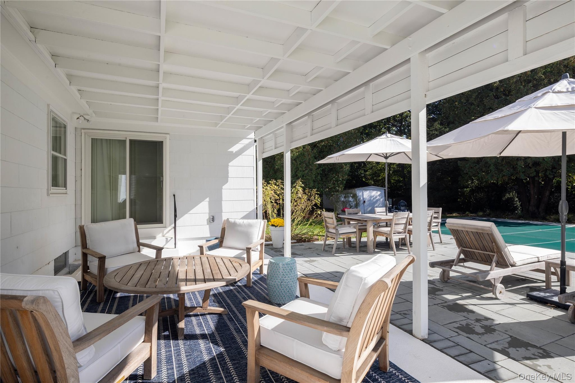 Stylishly Renovated Ranch with Saltwater Pool! Bright, white, and move-in ready—this renovated ranch offers the modern coastal look every buyer is searching for. The open, airy layout features a cozy living room, spacious dining area, and an eat-in kitchen with white cabinetry, brushed gold hardware, and new flooring. The living room features large windows overlooking the backyard and gorgeous pool, filling the home with natural light. The dining room has great indoor outdoor flow, perfect for entertaining. The property includes two bedrooms, one full bath, a full unfinished basement, and an attached 1.5 car garage. Upgrades include super high efficient CAC with air cleaner (2023,) freshly painted interiors (2024,) light-toned flooring (2025), and updated window treatments throughout (2025). Exterior improvements include a 18x36 saltwater vinyl pool with stadium steps which has: propane heat, integrated pool lighting system, automatic cover and mesh winter cover (2023). Bluestone pavers surrounding the pool and connecting to a covered patio, and upgraded landscaping for a clean, modern finish (2023). Covered patio is 25x12 and is the perfect place to enjoy your morning coffee or evening cocktail and relax. Ideally located near both Southold Village and historic Greenport, the property offers the best of both worlds. Wineries, local farms, and farm-to-table dining are just moments away, while boating enthusiasts will appreciate nearby marinas. Serene beaches like Town Beach and Goose Beach are just moments away. A turnkey opportunity for those seeking a year-round home, weekend retreat, or investment property on the North Fork. Furnishings may be available for separate purchase.