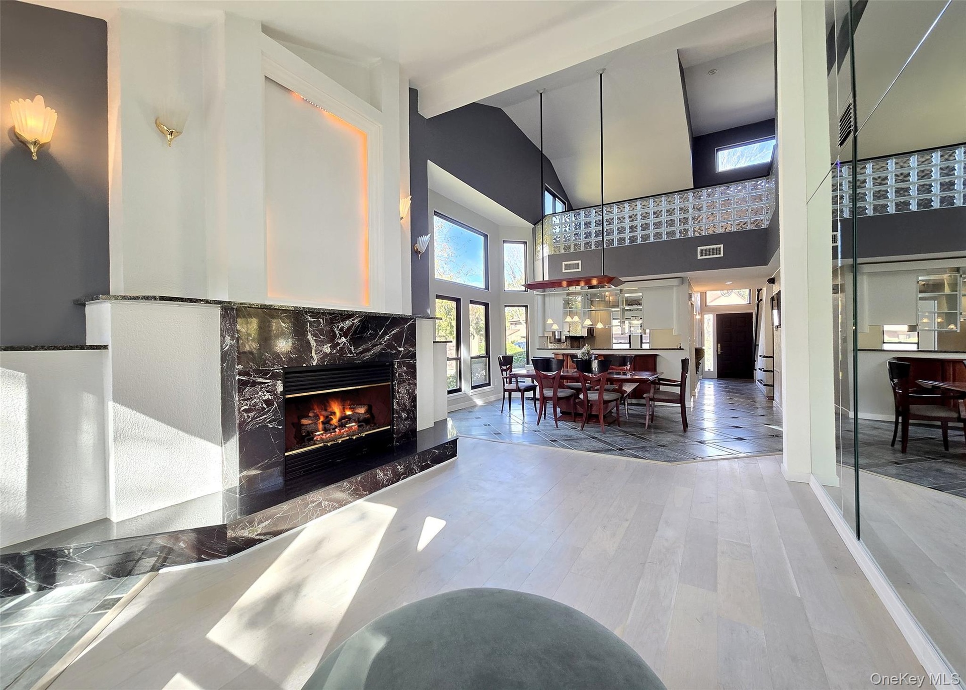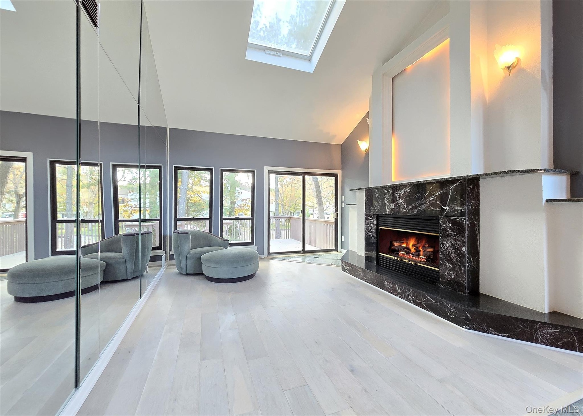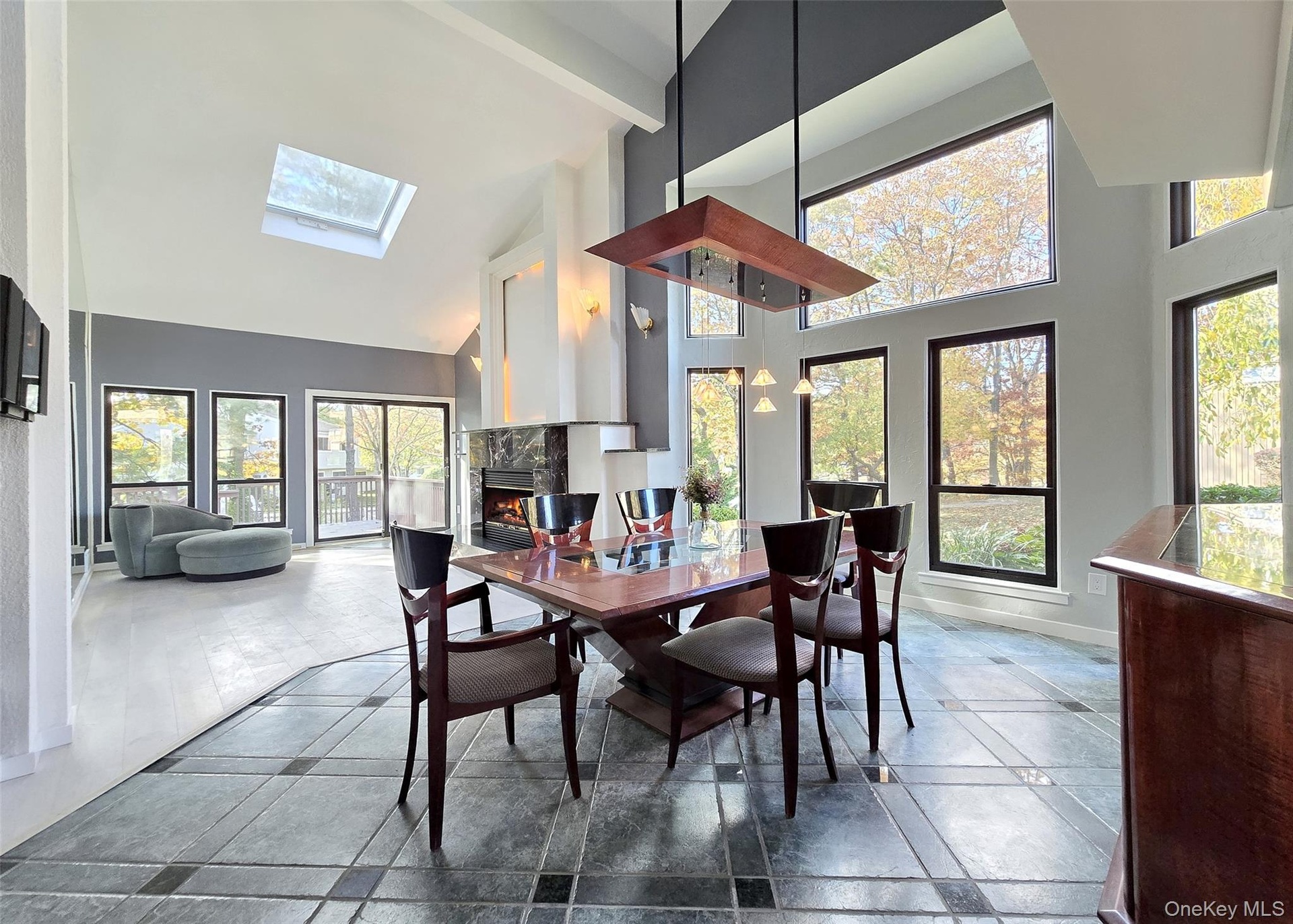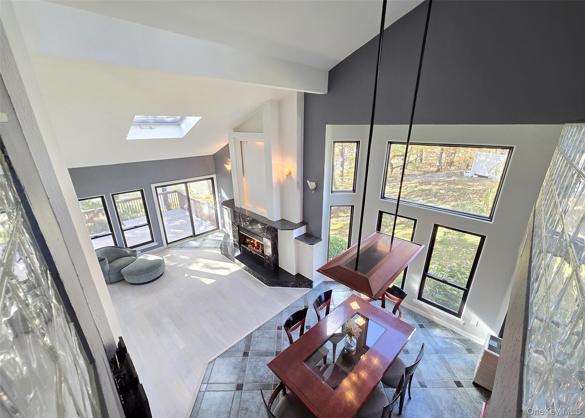 The main level showcases a bright, open kitchen with custom windows that flood the space with natural light. The adjacent formal dining room features soaring cathedral ceilings and expansive windows, while the inviting living room centers around a gas fireplace with custom accent lighting and opens to a bi-level deck, perfect for outdoor entertaining. The primary suite offers a peaceful retreat with skylight, updated en-suite bathroom, and generous closet space. Additional bedrooms provide ample room for family or guests, with large closets throughout.