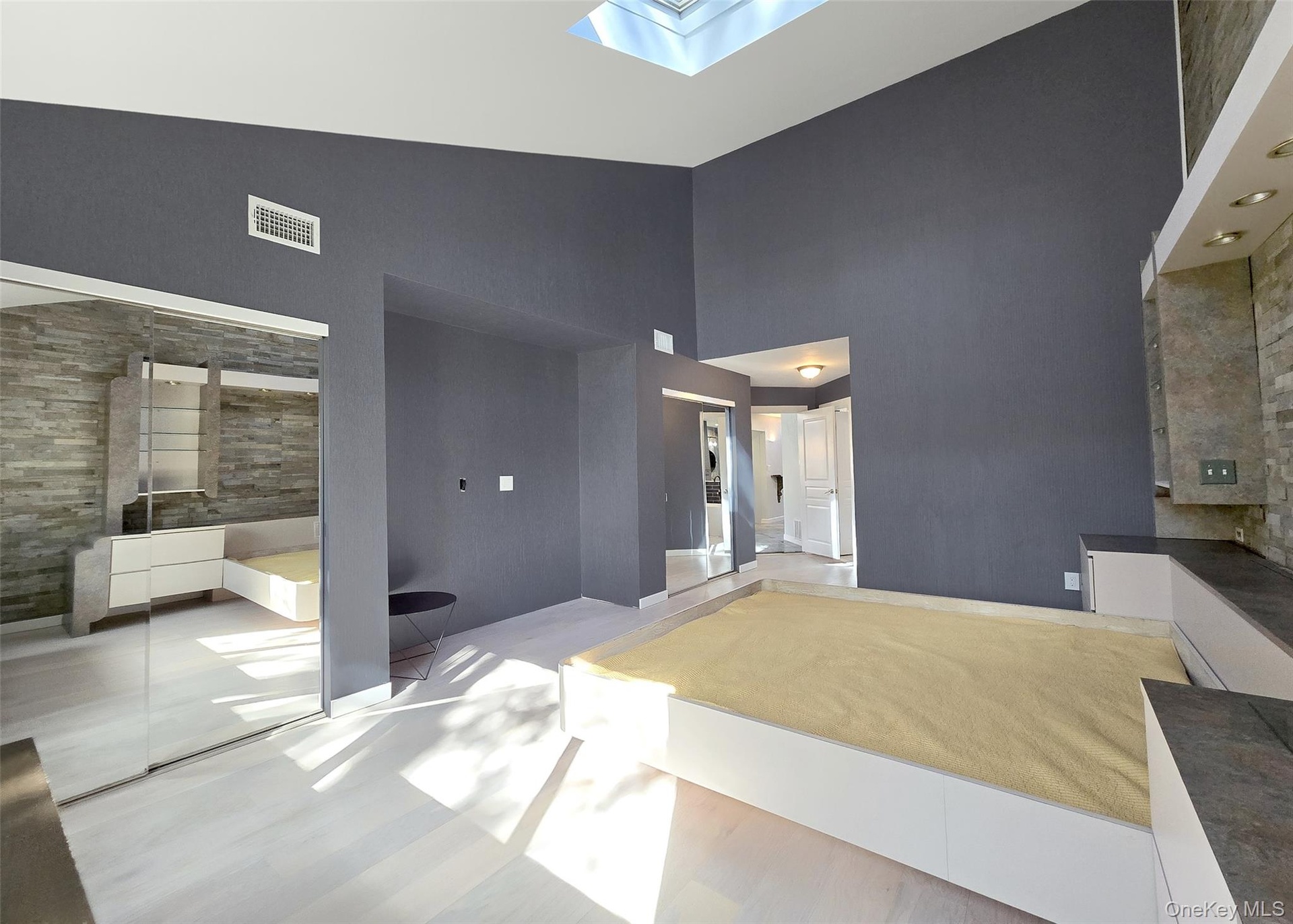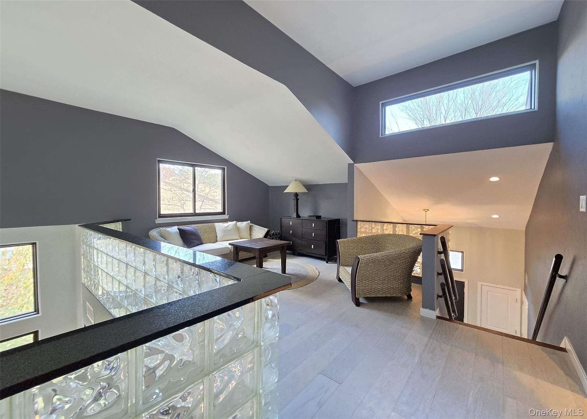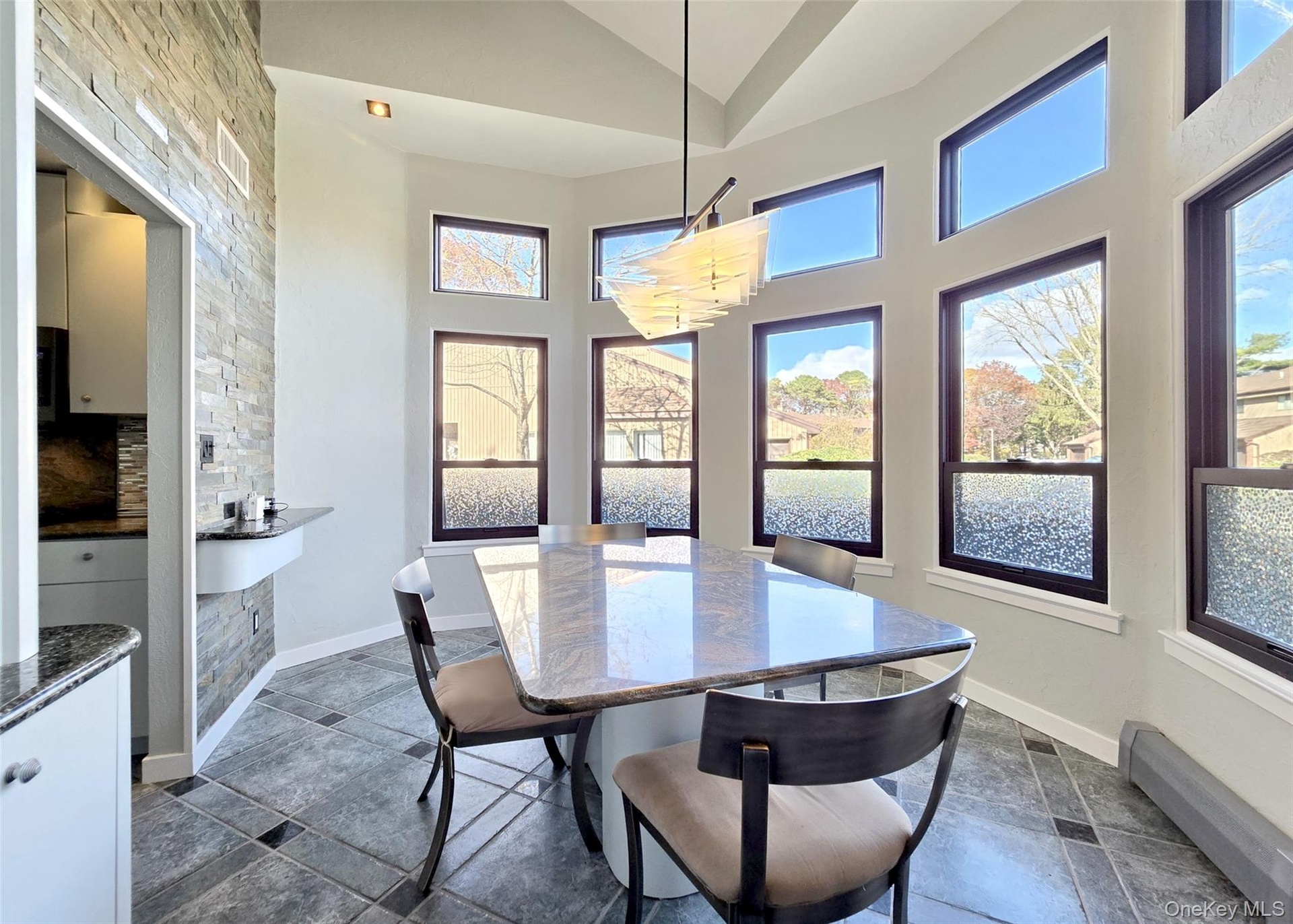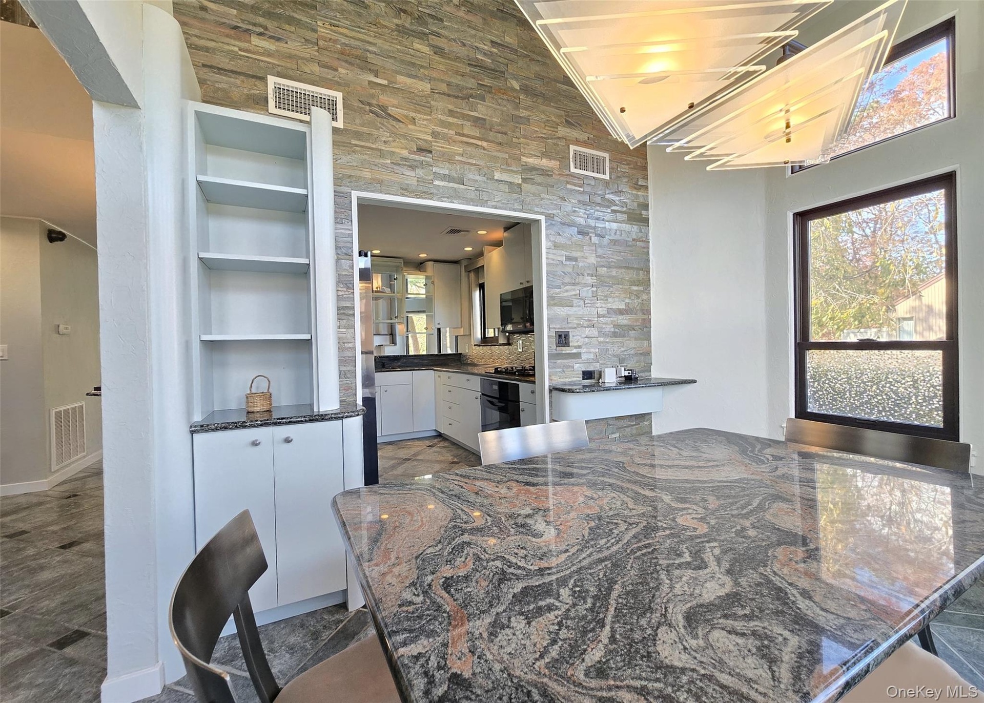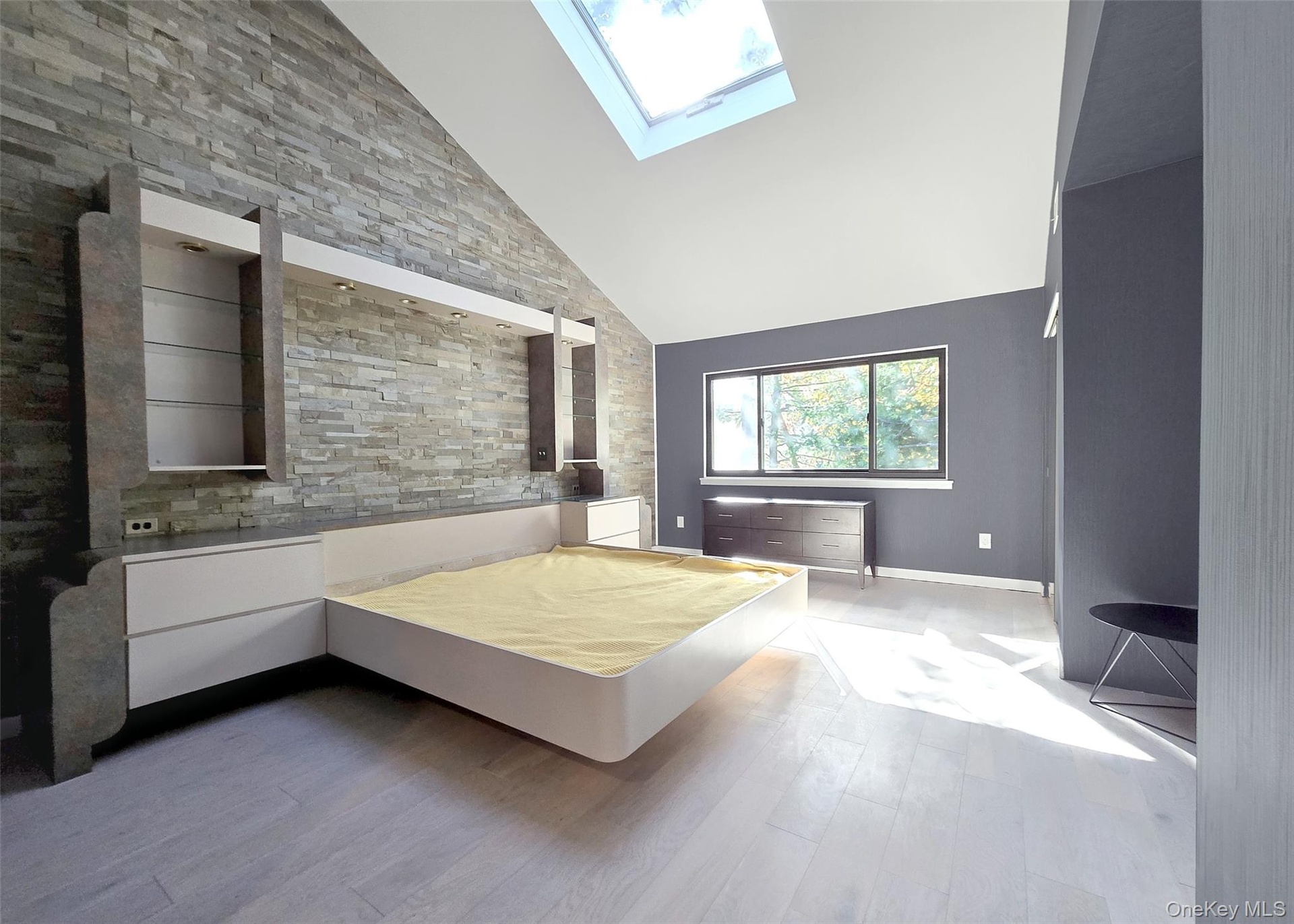 The main level showcases a bright, open kitchen with custom windows that flood the space with natural light. The adjacent formal dining room features soaring cathedral ceilings and expansive windows, while the inviting living room centers around a gas fireplace with custom accent lighting and opens to a bi-level deck, perfect for outdoor entertaining. The primary suite offers a peaceful retreat with skylight, updated en-suite bathroom, and generous closet space. Additional bedrooms provide ample room for family or guests, with large closets throughout.