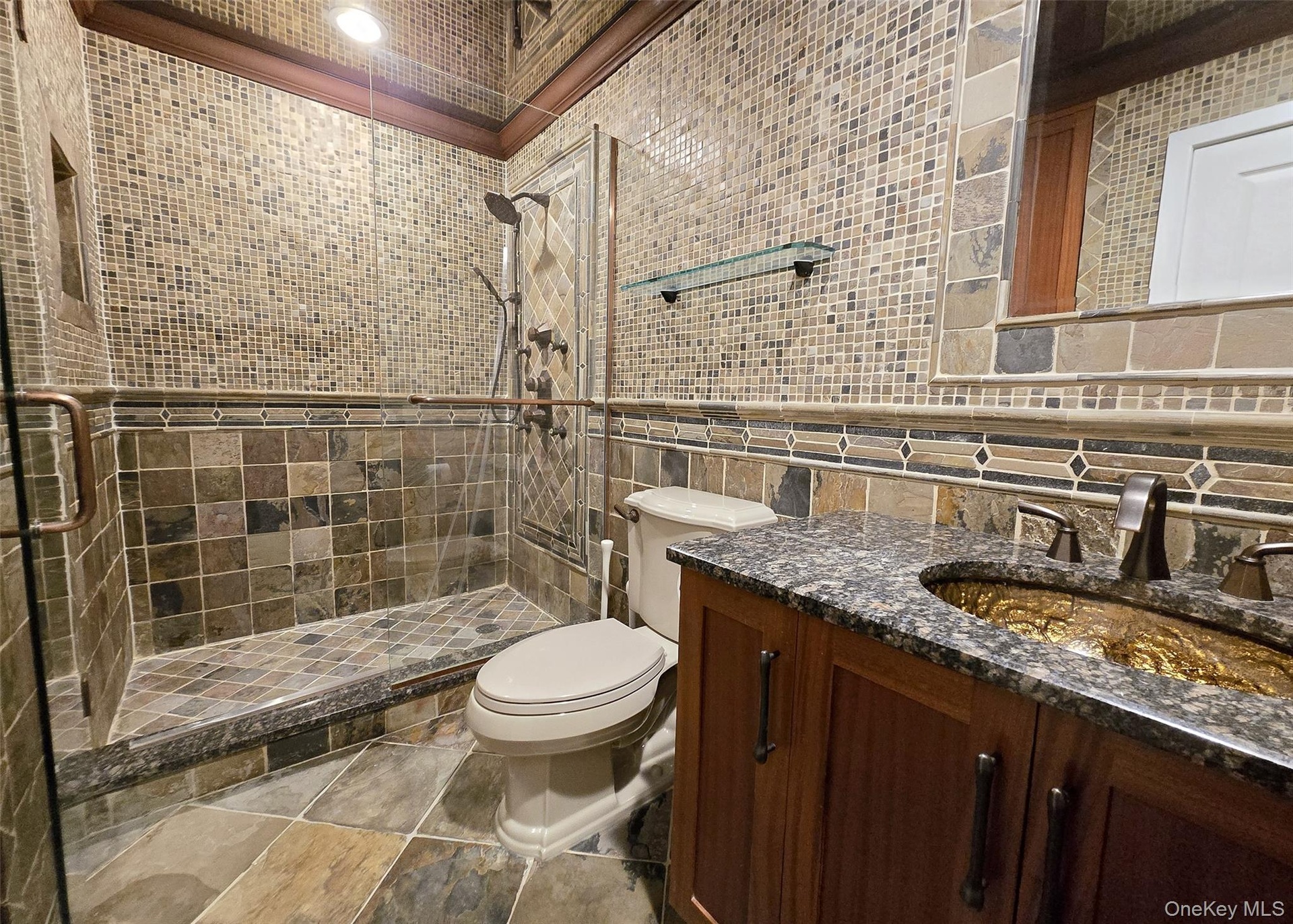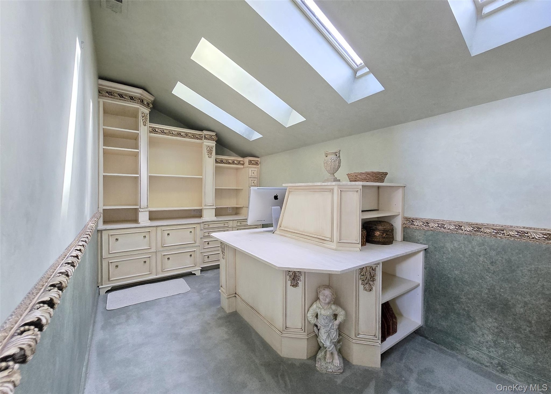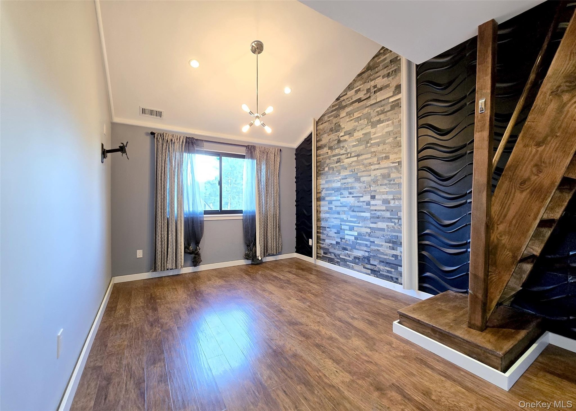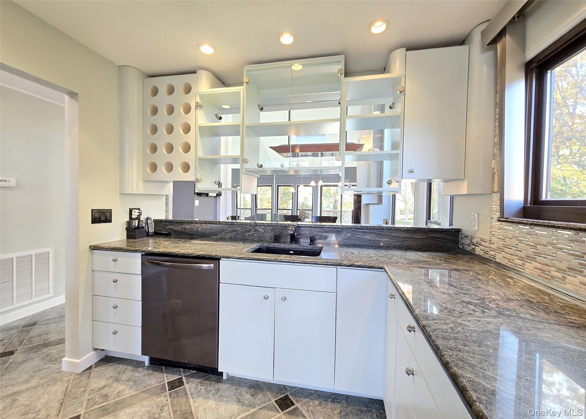 The main level showcases a bright, open kitchen with custom windows that flood the space with natural light. The adjacent formal dining room features soaring cathedral ceilings and expansive windows, while the inviting living room centers around a gas fireplace with custom accent lighting and opens to a bi-level deck, perfect for outdoor entertaining. The primary suite offers a peaceful retreat with skylight, updated en-suite bathroom, and generous closet space. Additional bedrooms provide ample room for family or guests, with large closets throughout.