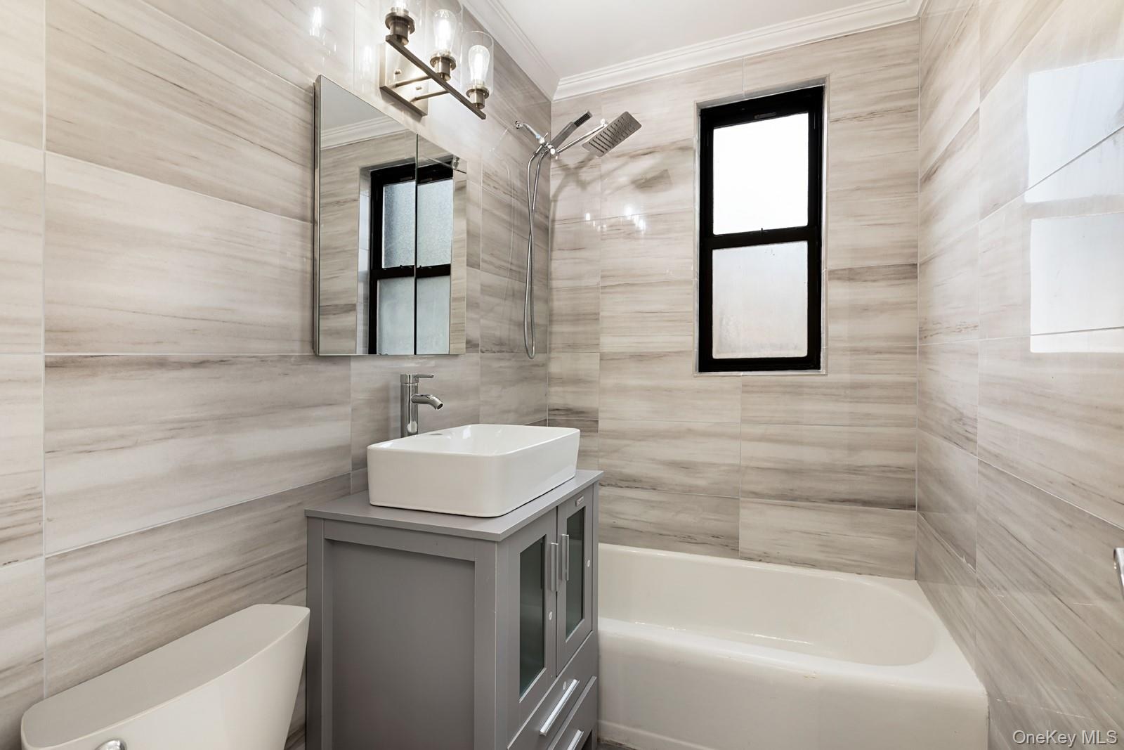 The windowed four-fixture bathroom has been completely renovated. The walls are adorned with large-format porcelain tiles, creating a peaceful and calming space.