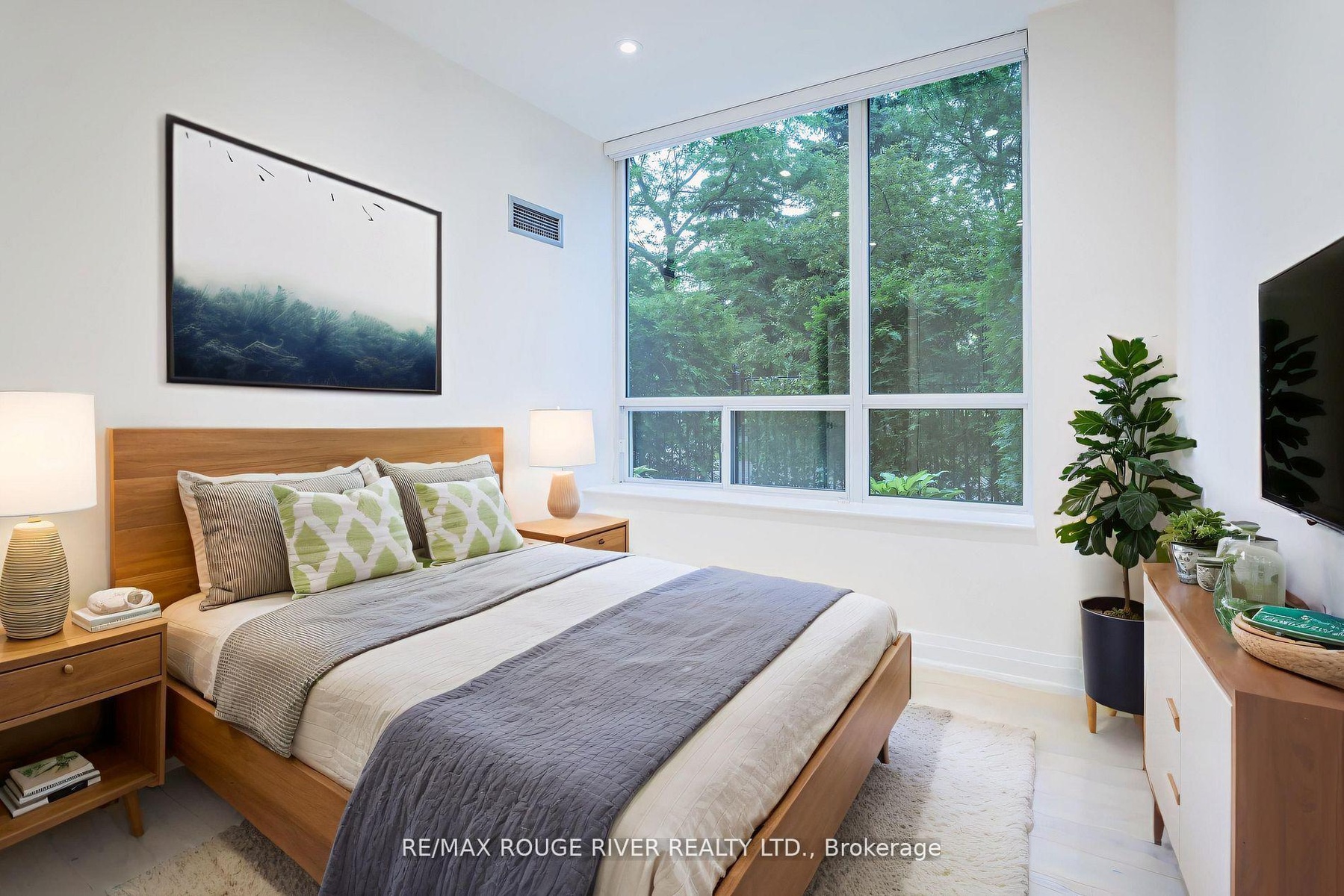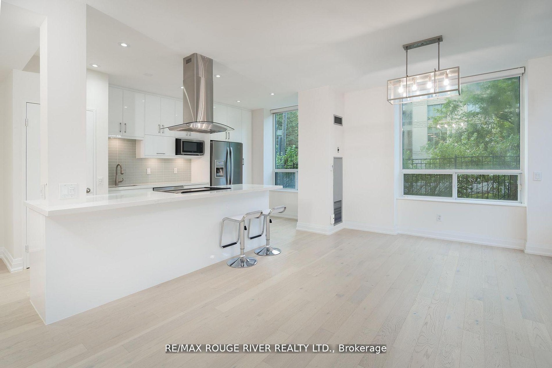 Prime North York Living! This stunning, fully renovated 2-bedroom, 2-bath 1053 Sq Ft, ground floor Corner unit suite offers the perfect blend of style, comfort, and convenience complete with a private entrance from a large, fully fenced terrace. Designed for downsizers or anyone seeking effortless, low-maintenance living, this condo truly feels like a model home. Inside, you'll find engineered hardwood flooring throughout, a modern kitchen with quartz countertops, stainless steel appliances (2020), custom built-in closets, and a Bosch ventless washer + dryer (2020). The oversized kitchen island is enhanced with a sleek fan hood, while remote-controlled sheer blinds add a touch of sophistication to every room. The primary bedroom features a spacious walk-in closet and a private 4-piece en-suite. Thoughtful custom storage solutions are found throughout the unit. Includes one underground parking spot and exclusive use of a storage locker. Enjoy unbeatable walkability just steps to North York Centre, TTC subway, Earl Haig Secondary, McKee Public School, restaurants, shopping, Loblaws, Metro, and more. Quick access to Hwy 401 & 407, top hospitals, and all urban essentials. Located in a well-managed, recently updated building, this is a rare opportunity to enjoy elegant city living in a warm, welcoming community.