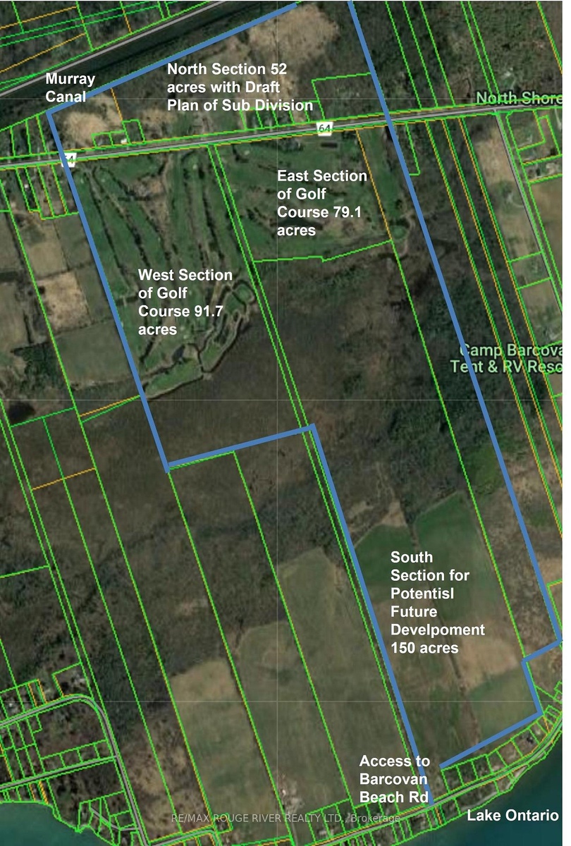 An exceptional opportunity to develop a golf course residential community at the gateway to Prince Edward County. Located on the north side of CR 64, bordered by Murray Canal and a well established 18 hole golf course to the south this 52 acre parcel has a draft plan approval of sub-division for 105 home sites. Could be ideal for a retirement or park model style community. The owners are open to a variety of options with qualified buyers.
