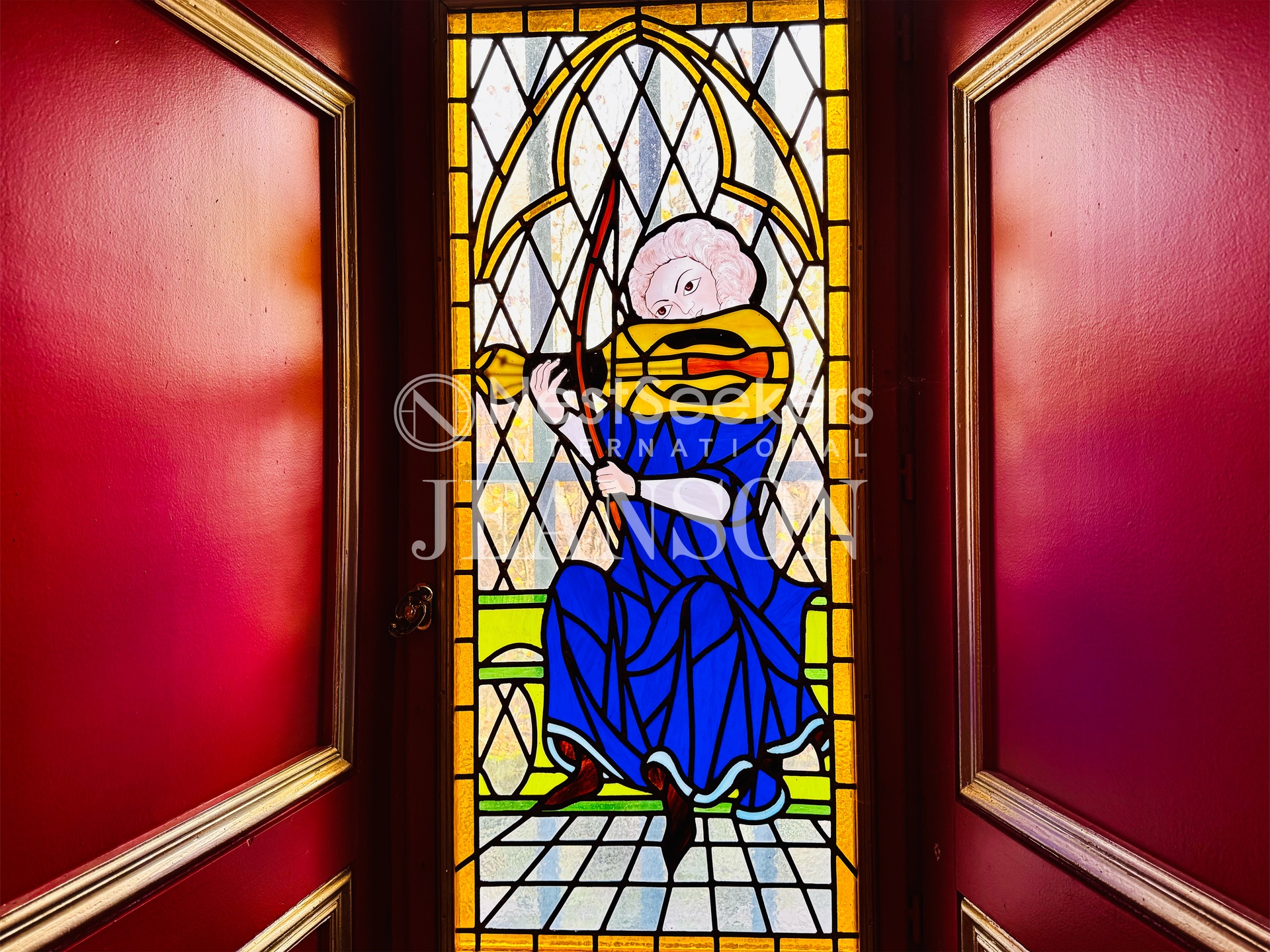 Inside, the dramatic 123-step spiral staircase, the billiard room, and the impressive armory set the tone. The reception rooms include a grand salon, formal library, boudoir, estaminet, private chapel, and a fully equipped 36-seat cinema.