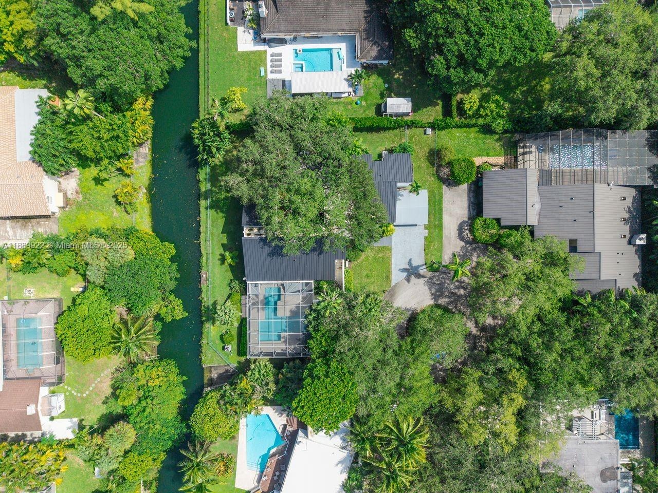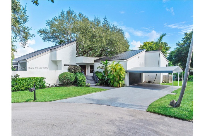 Mid-century modern 4BR/3BA + loft residence in Palmetto Bay, designed by architect Marc Firestone. Encompassing 4,362 total SF, this canal-front gem sits on a quiet cul-de-sac surrounded by majestic oaks and lush landscaping. The home embraces indoor-outdoor living with a central atrium. Vaulted wood-beamed ceilings, walls of glass, and natural light define the open spaces. A spiral staircase leads to a loft overlooking the family room with fireplace and bar. The kitchen opens to a covered screened terrace and patio with heated pool ideal for entertaining. Features include new plank flooring, 2024 metal roof, ample parking, and a private concrete boat launch.