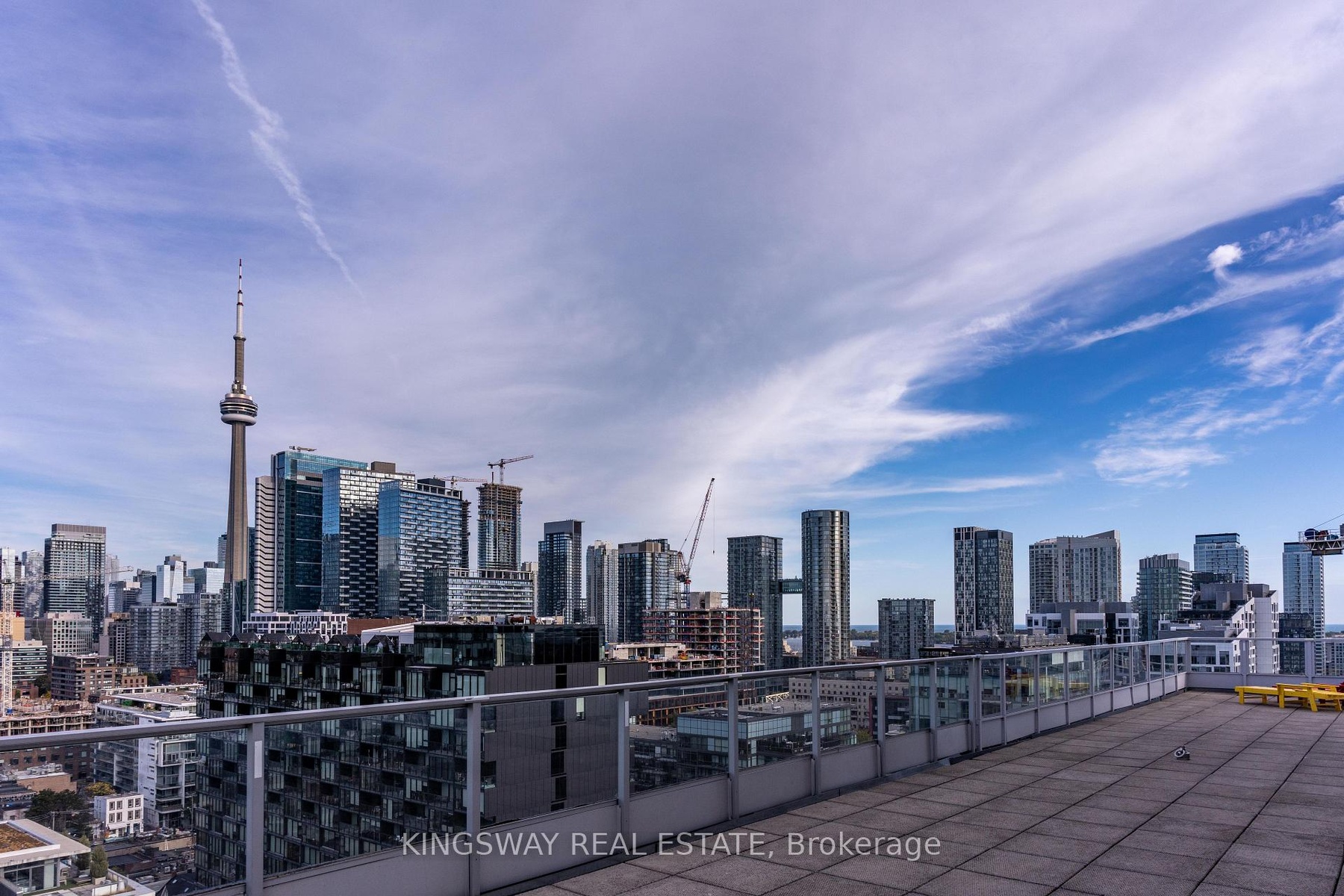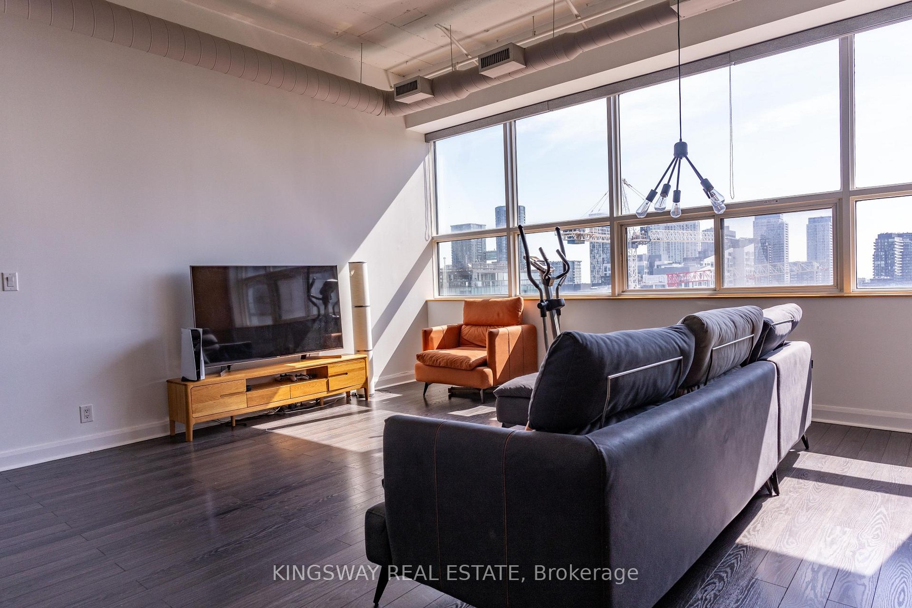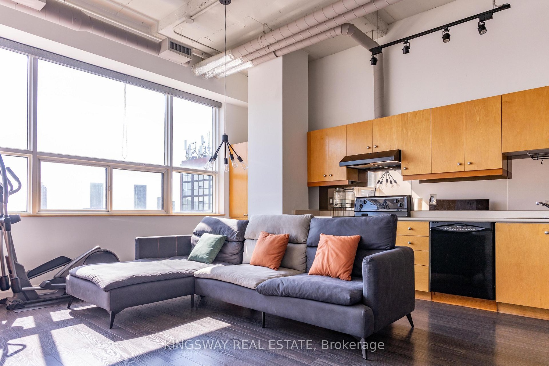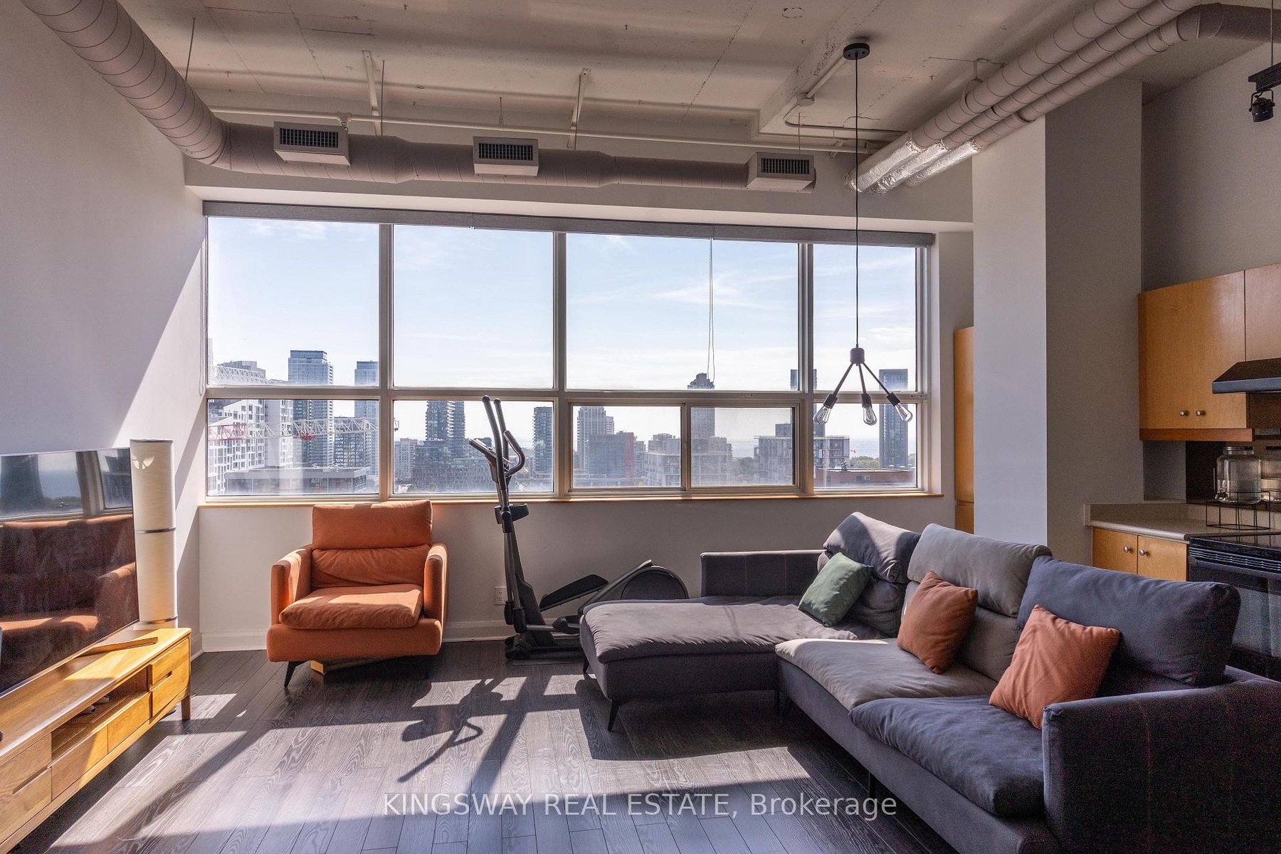 Lower Penthouse Hard Loft in the heart of King West. Experience true hard loft living with soaring 11-foot ceilings and sun-filled south exposure offering stunning city and lake views. Built from a former office building, this suite features thicker concrete construction for excellent sound insulation. Open-concept layout with sleek laminate flooring throughout. Enjoy the best of downtown living with shops, restaurants, and transit at your doorstep.