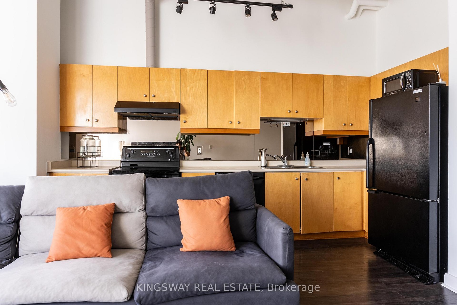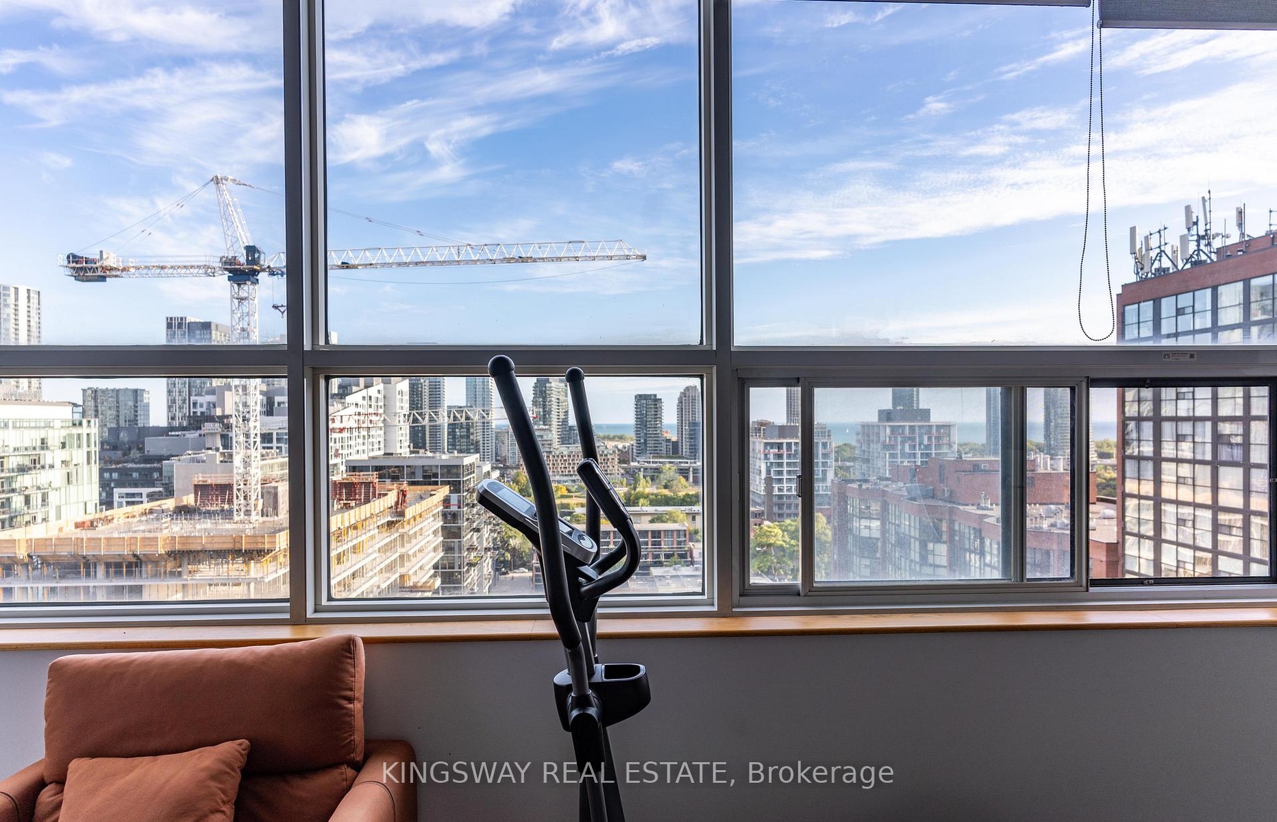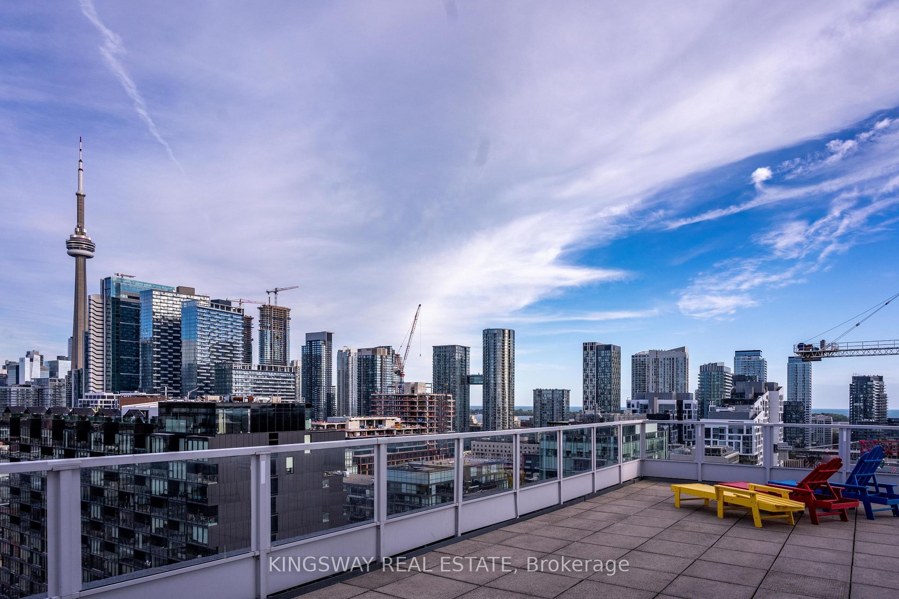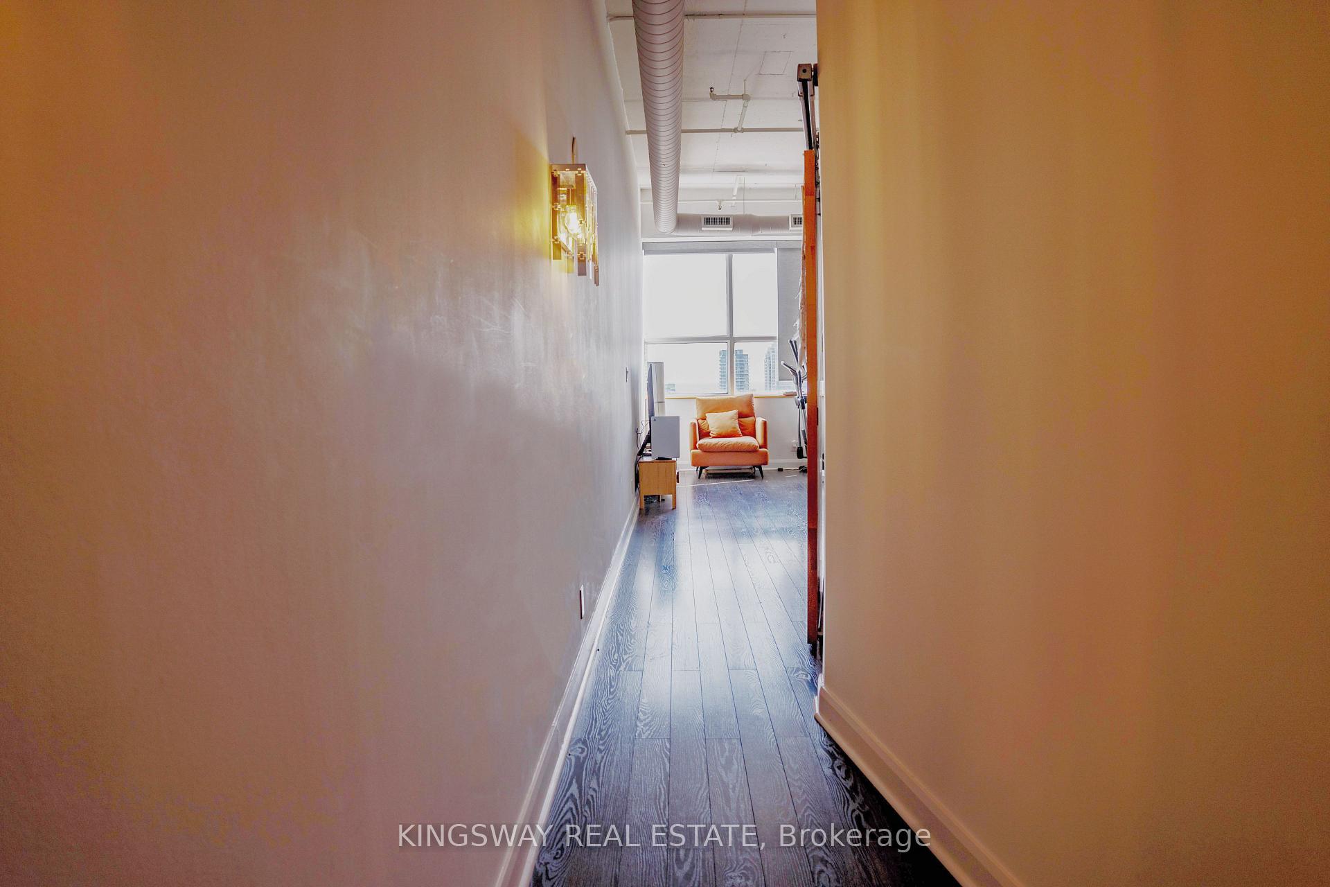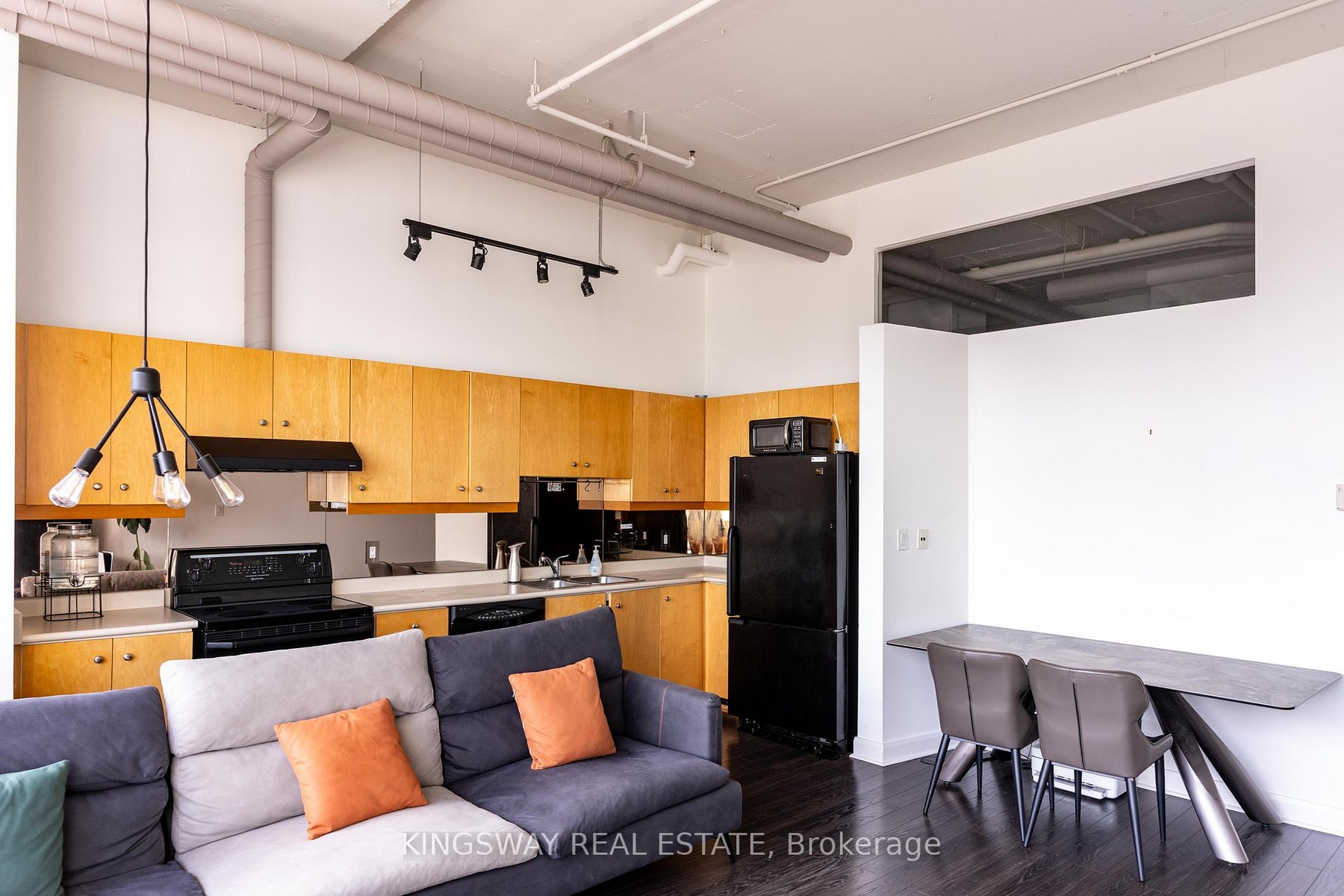 Lower Penthouse Hard Loft in the heart of King West. Experience true hard loft living with soaring 11-foot ceilings and sun-filled south exposure offering stunning city and lake views. Built from a former office building, this suite features thicker concrete construction for excellent sound insulation. Open-concept layout with sleek laminate flooring throughout. Enjoy the best of downtown living with shops, restaurants, and transit at your doorstep.