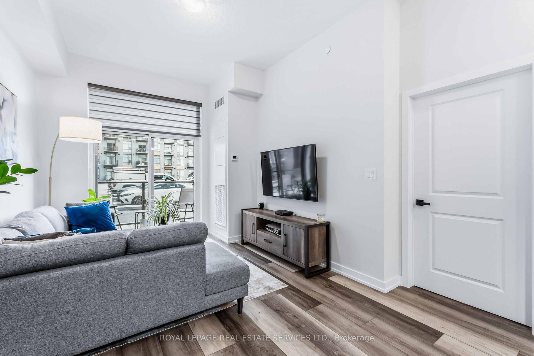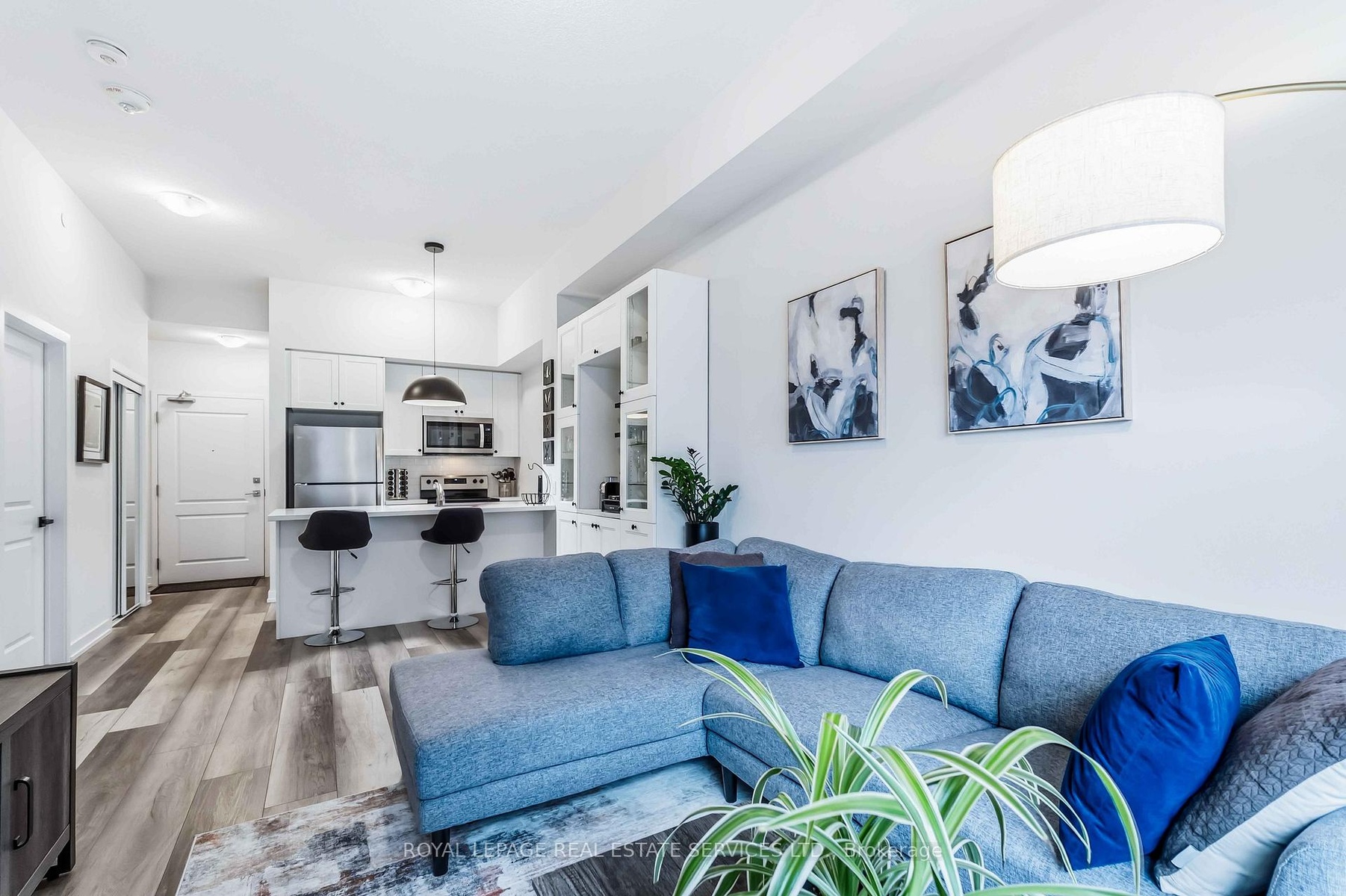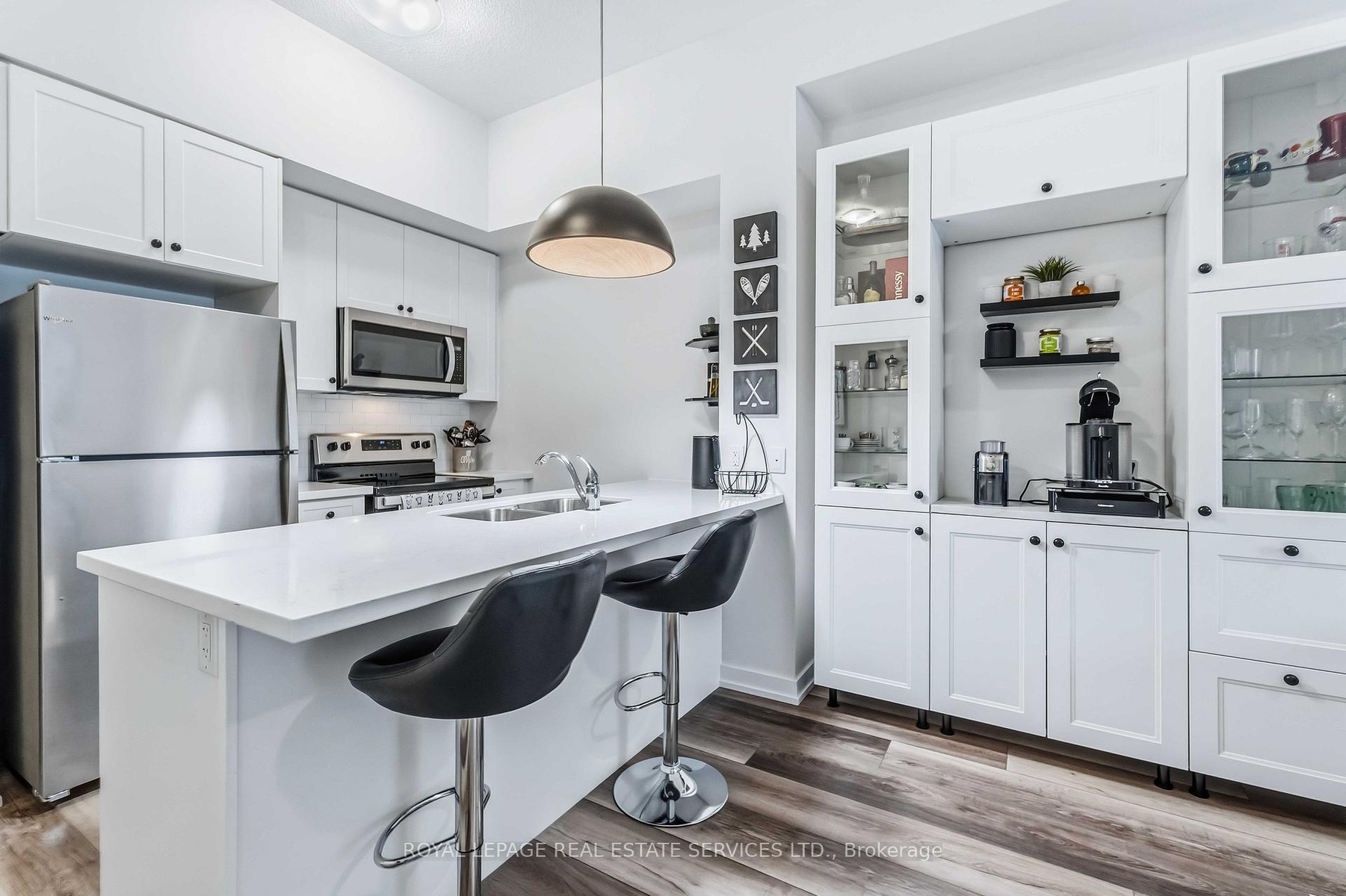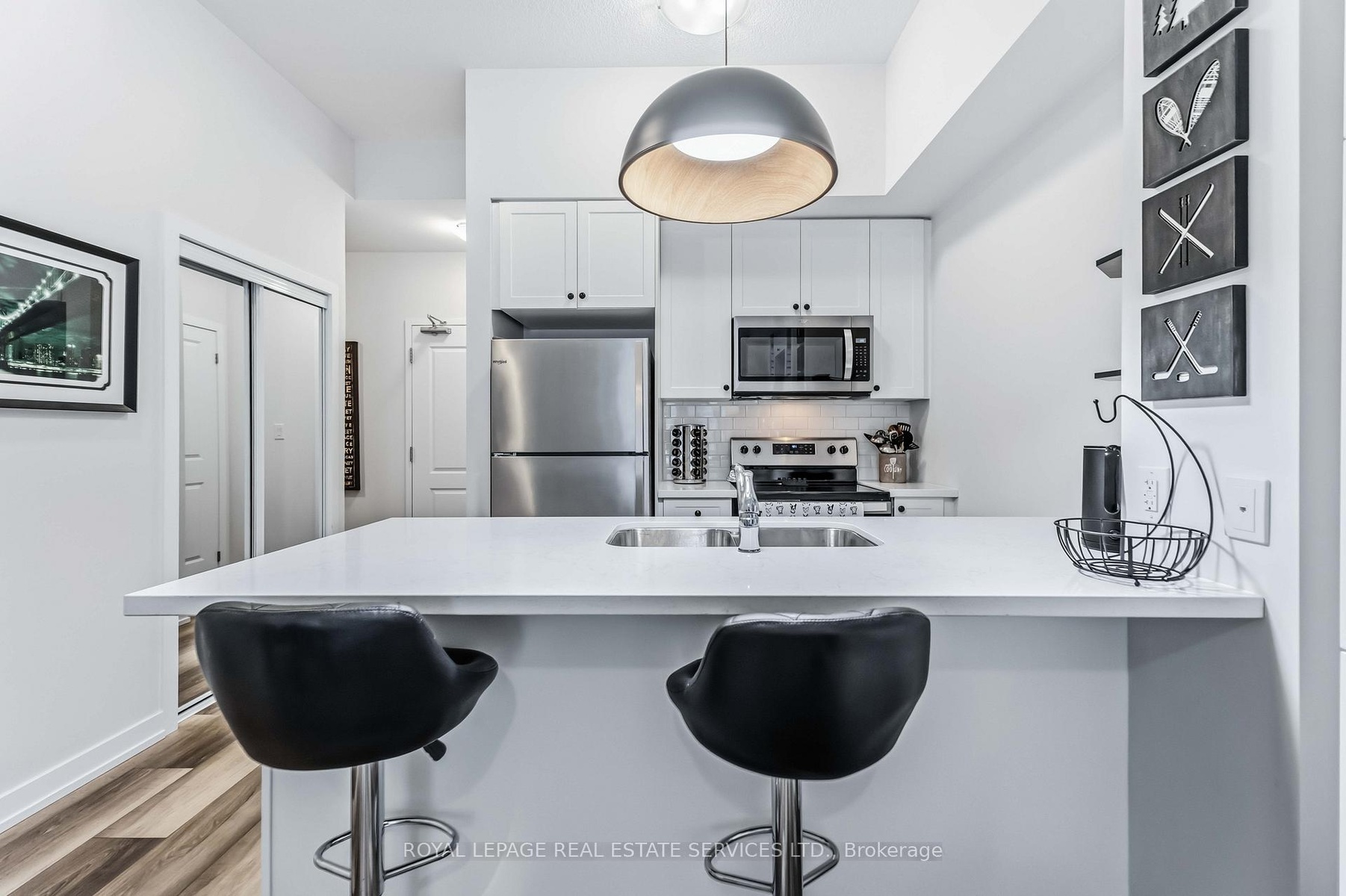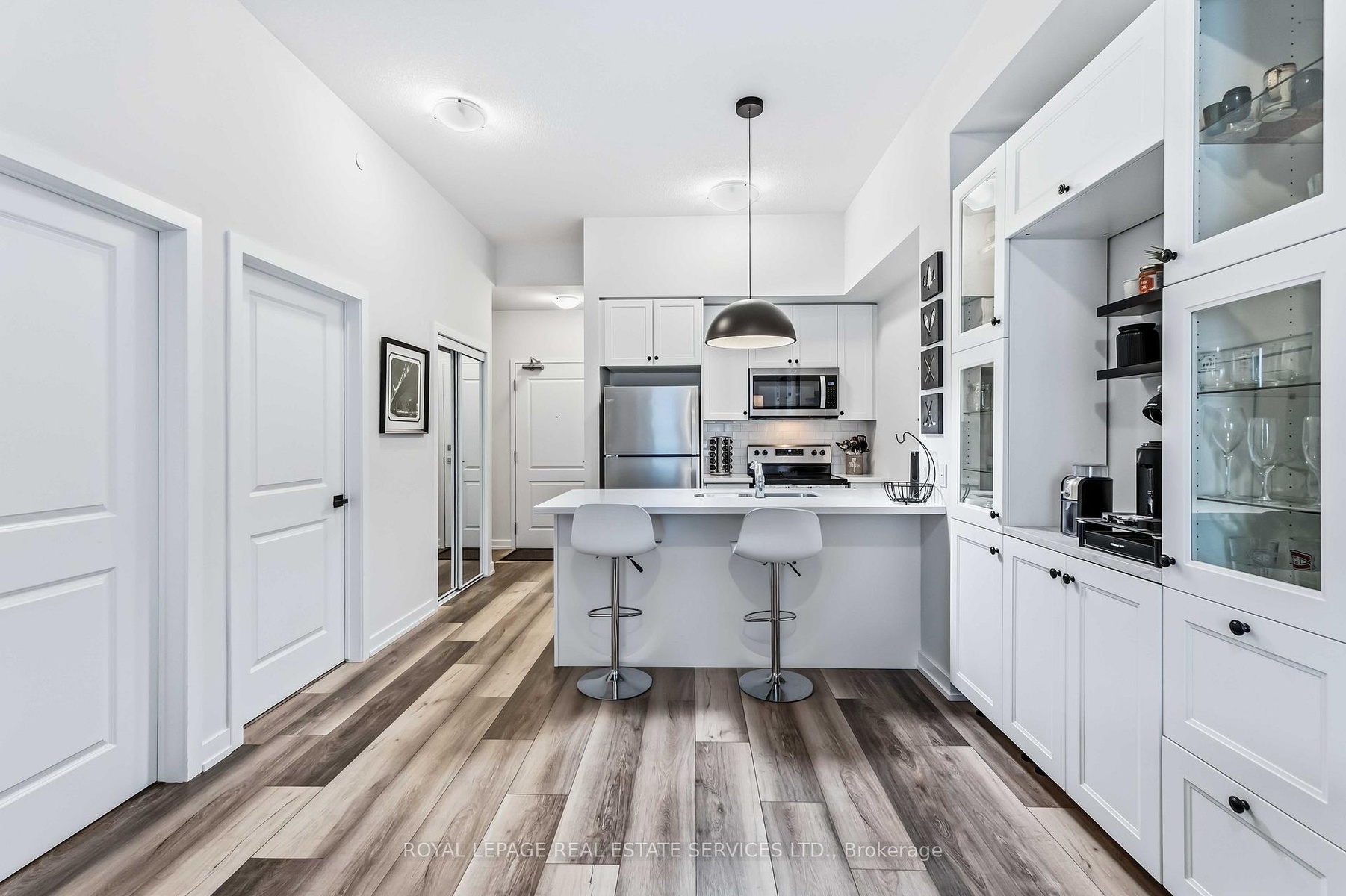 Experience modern living with this stunning 1-bedroom + den residence. The heart of the home is a modern, open-concept kitchen featuring a quartz peninsula island, subway backsplash, stainless steel appliances, and upgraded lighting. This flows seamlessly into a living and dining area defined by luxury vinyl plank flooring, a custom wall cabinet structure, and electric blinds, all leading to a sun-filled balcony walk-out. Beyond the main living space, you will find a versatile den perfect for a home office, a foyer with double mirrored closets, a 4-piece bathroom, and a bright primary bedroom with large windows. Perfectly situated for convenience, this unit is located just steps from the elevator, garbage chute, and your storage locker. Residents enjoy fabulous building amenities including a gym, party room, and meeting room, plus easy highway access for commuters. Don't miss out on this blend of luxury and convenience!