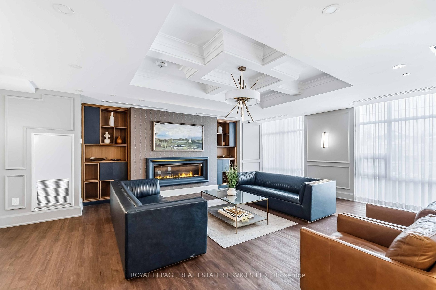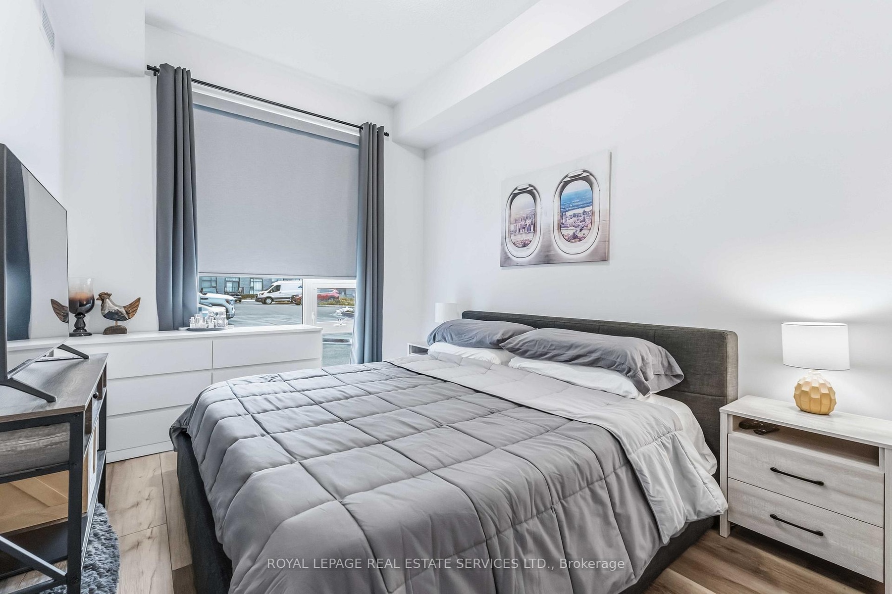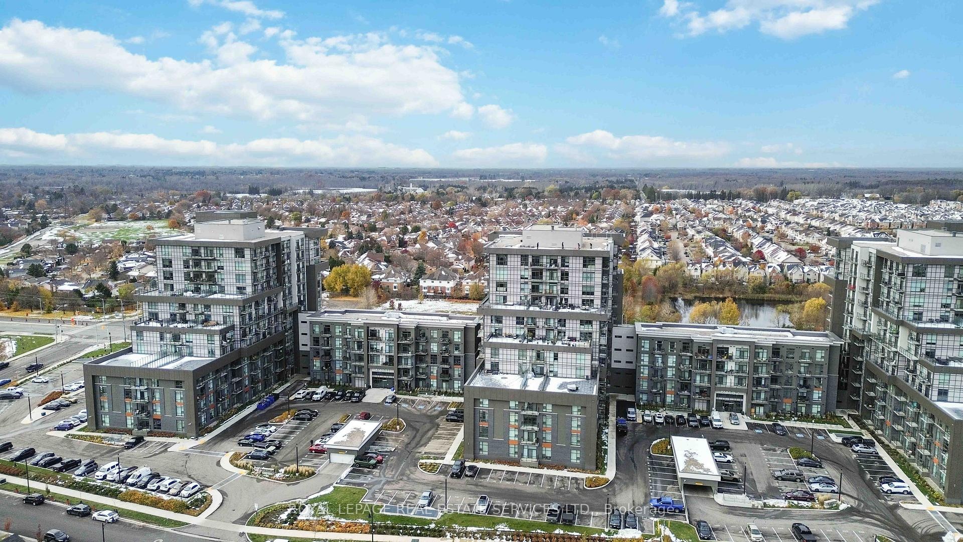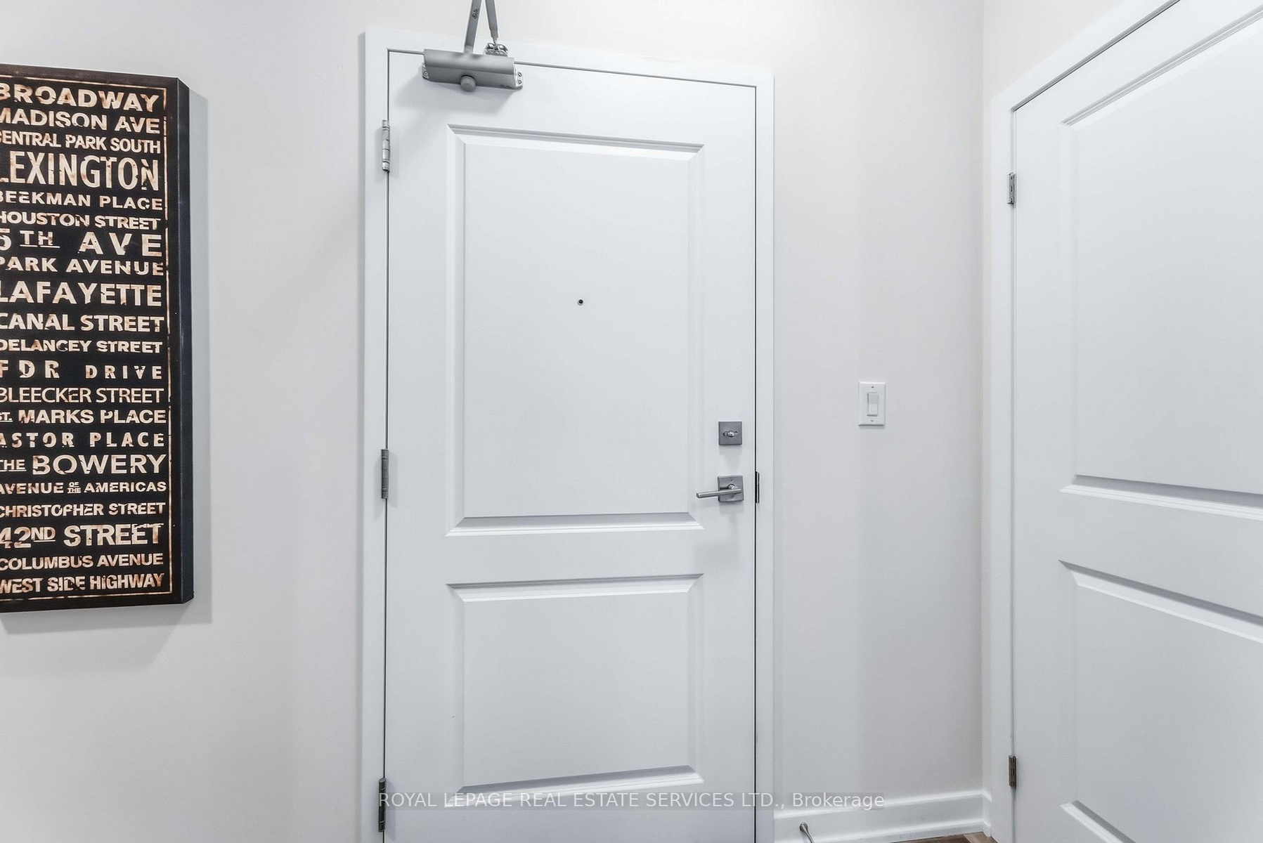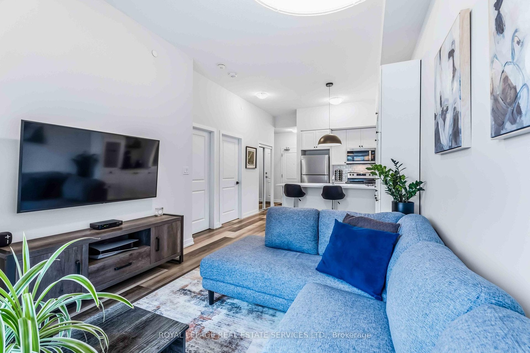 Experience modern living with this stunning 1-bedroom + den residence. The heart of the home is a modern, open-concept kitchen featuring a quartz peninsula island, subway backsplash, stainless steel appliances, and upgraded lighting. This flows seamlessly into a living and dining area defined by luxury vinyl plank flooring, a custom wall cabinet structure, and electric blinds, all leading to a sun-filled balcony walk-out. Beyond the main living space, you will find a versatile den perfect for a home office, a foyer with double mirrored closets, a 4-piece bathroom, and a bright primary bedroom with large windows. Perfectly situated for convenience, this unit is located just steps from the elevator, garbage chute, and your storage locker. Residents enjoy fabulous building amenities including a gym, party room, and meeting room, plus easy highway access for commuters. Don't miss out on this blend of luxury and convenience!