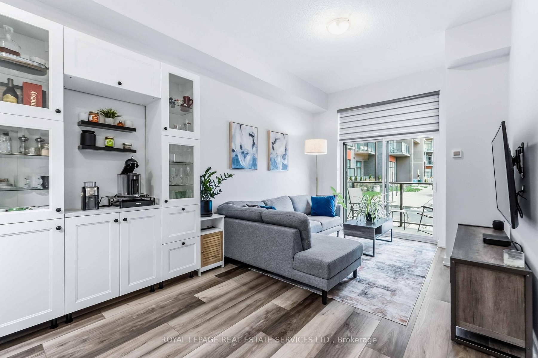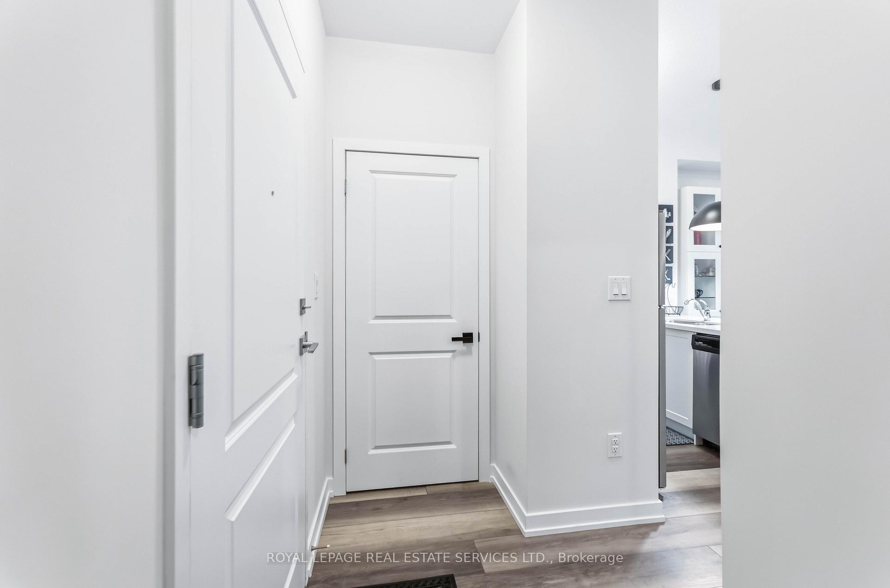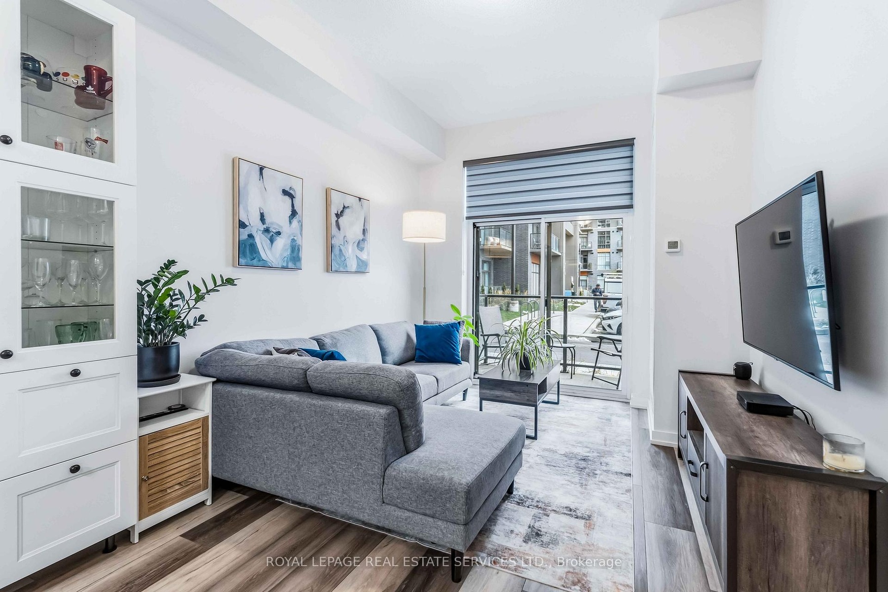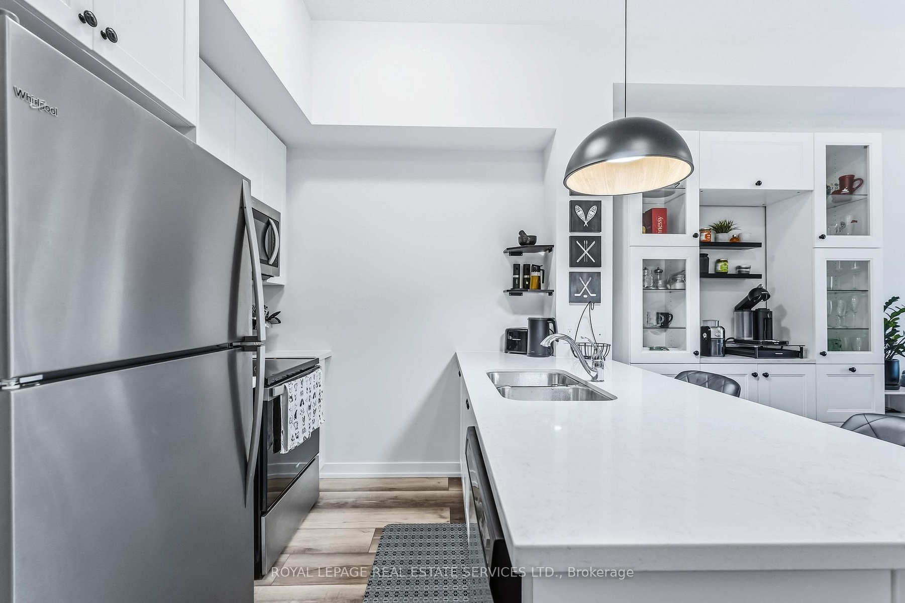 Experience modern living with this stunning 1-bedroom + den residence. The heart of the home is a modern, open-concept kitchen featuring a quartz peninsula island, subway backsplash, stainless steel appliances, and upgraded lighting. This flows seamlessly into a living and dining area defined by luxury vinyl plank flooring, a custom wall cabinet structure, and electric blinds, all leading to a sun-filled balcony walk-out. Beyond the main living space, you will find a versatile den perfect for a home office, a foyer with double mirrored closets, a 4-piece bathroom, and a bright primary bedroom with large windows. Perfectly situated for convenience, this unit is located just steps from the elevator, garbage chute, and your storage locker. Residents enjoy fabulous building amenities including a gym, party room, and meeting room, plus easy highway access for commuters. Don't miss out on this blend of luxury and convenience!