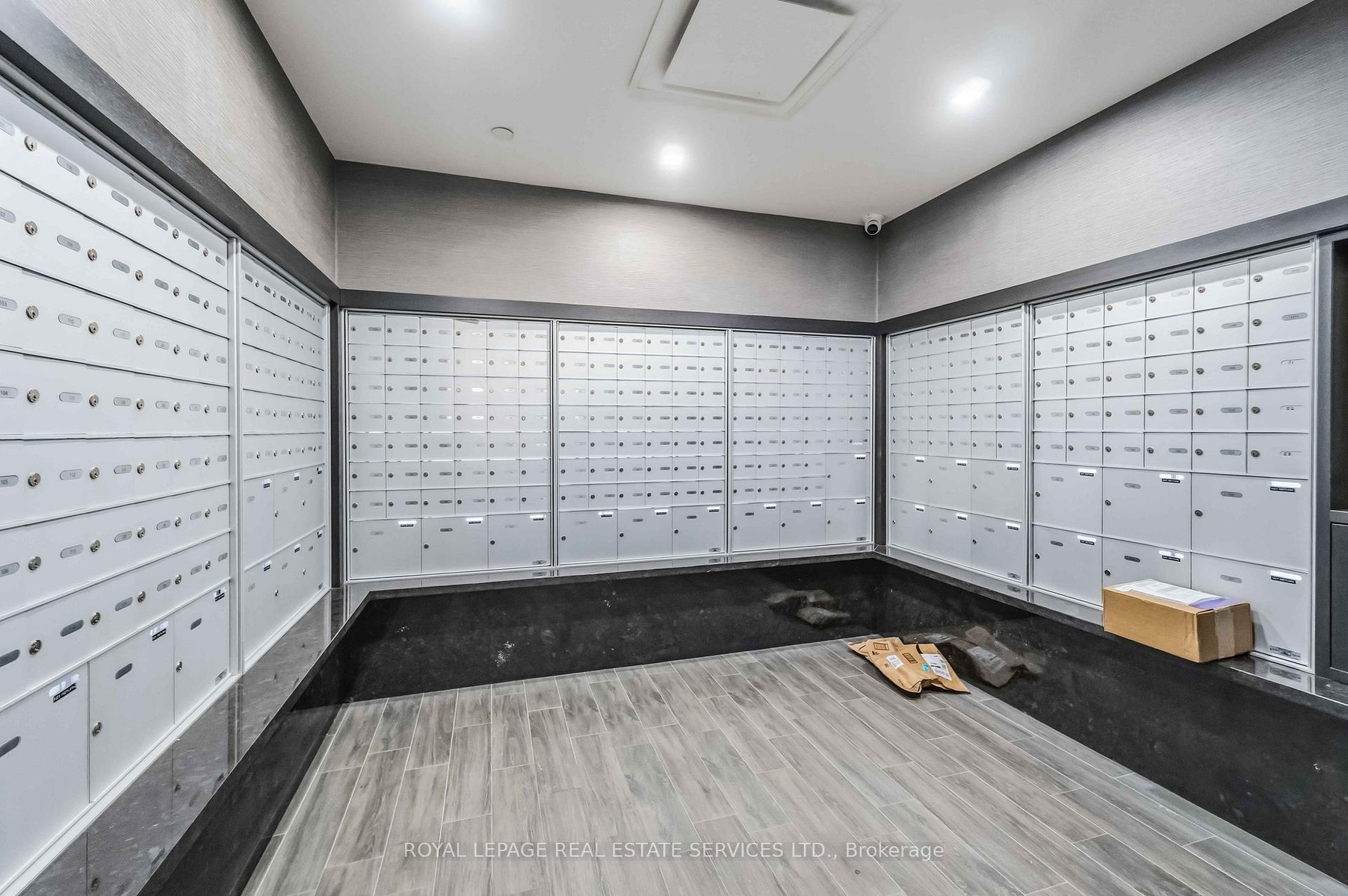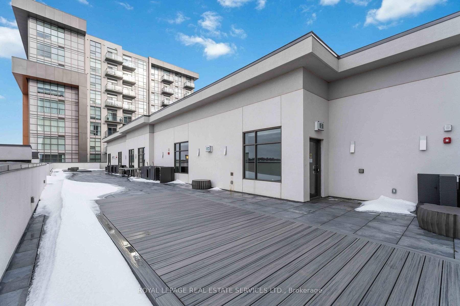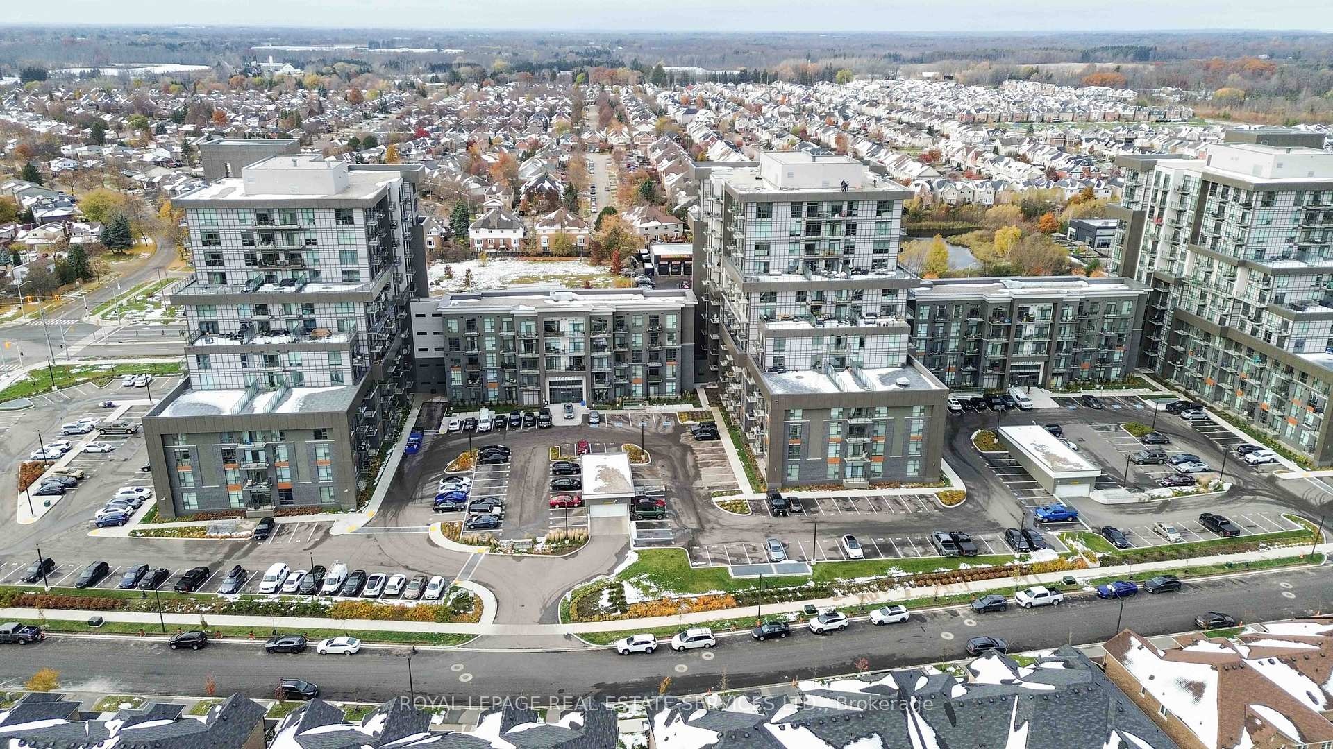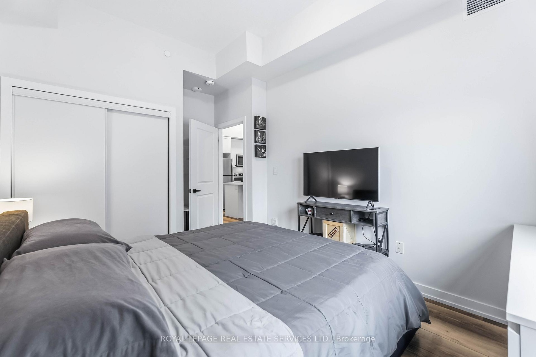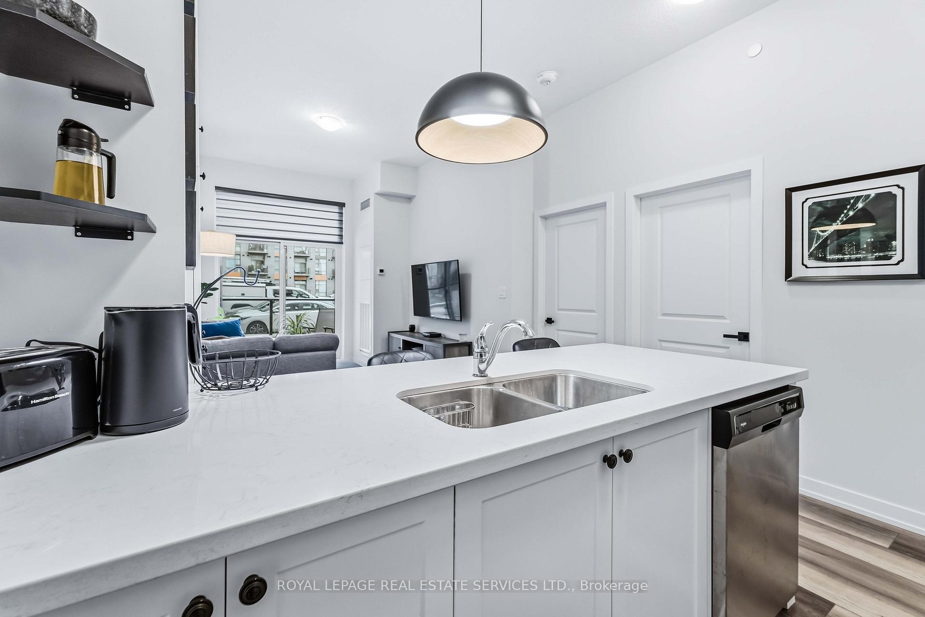 Experience modern living with this stunning 1-bedroom + den residence. The heart of the home is a modern, open-concept kitchen featuring a quartz peninsula island, subway backsplash, stainless steel appliances, and upgraded lighting. This flows seamlessly into a living and dining area defined by luxury vinyl plank flooring, a custom wall cabinet structure, and electric blinds, all leading to a sun-filled balcony walk-out. Beyond the main living space, you will find a versatile den perfect for a home office, a foyer with double mirrored closets, a 4-piece bathroom, and a bright primary bedroom with large windows. Perfectly situated for convenience, this unit is located just steps from the elevator, garbage chute, and your storage locker. Residents enjoy fabulous building amenities including a gym, party room, and meeting room, plus easy highway access for commuters. Don't miss out on this blend of luxury and convenience!